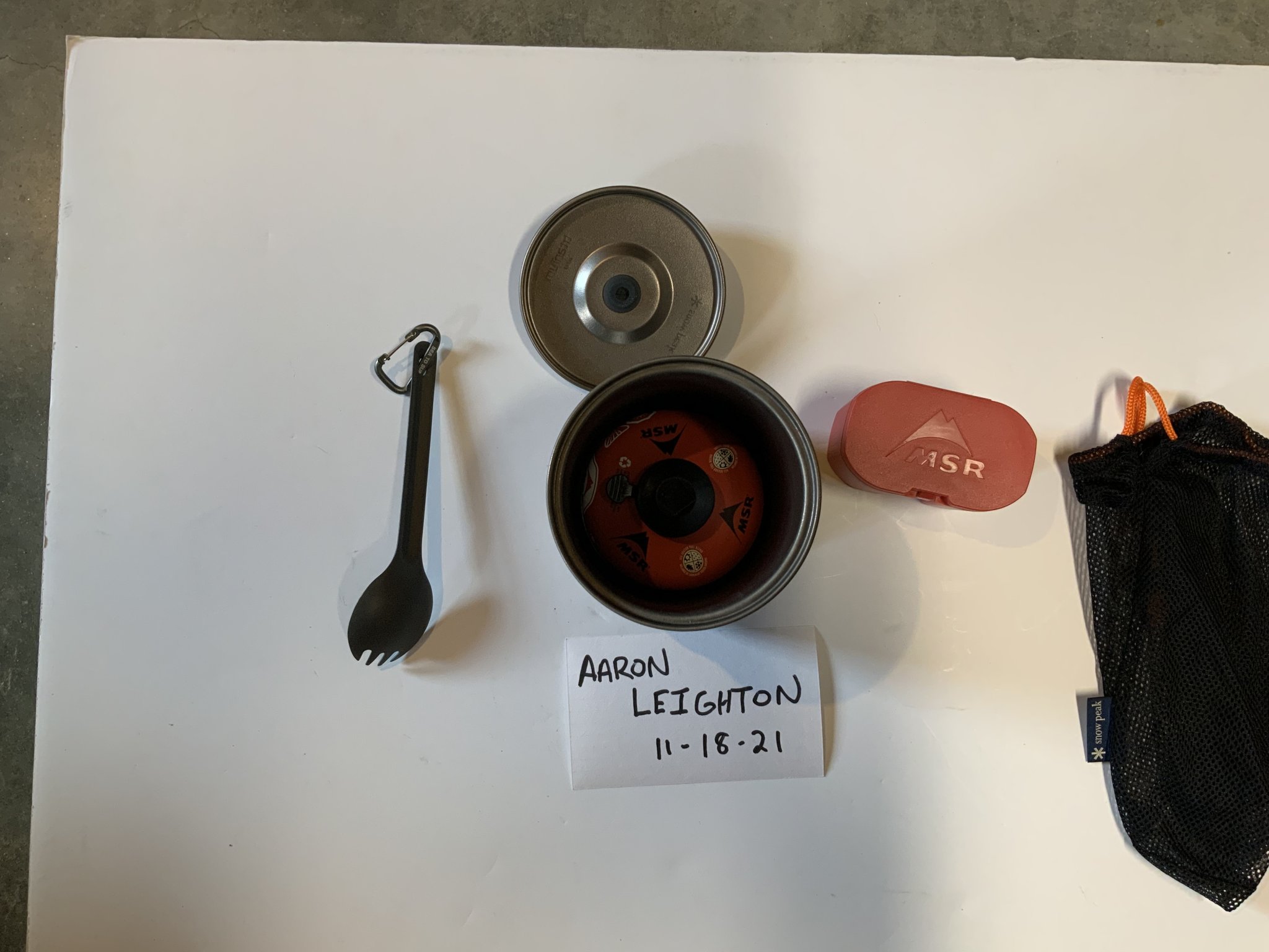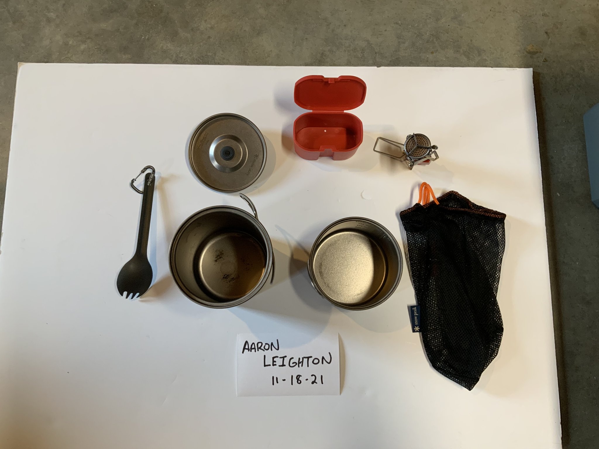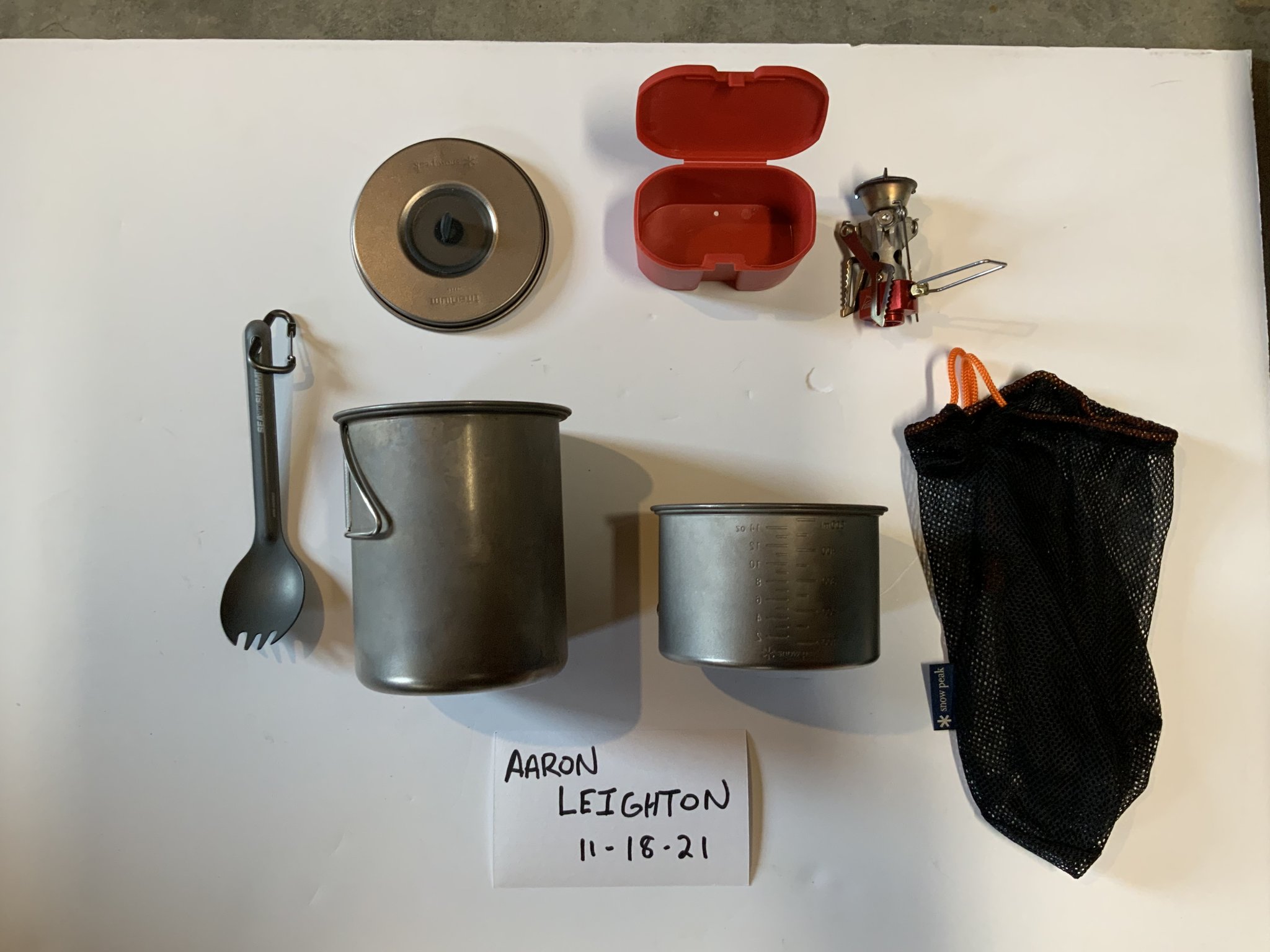 SOLD Snow Peak Ti Mini Solo w/ Mesh Storage Sack (6.9oz), MSR Pocket Rocket 2.0 w/ Storage Case (3.7oz), Snow Peak Spork w/ Mini Carabiner (.5oz)