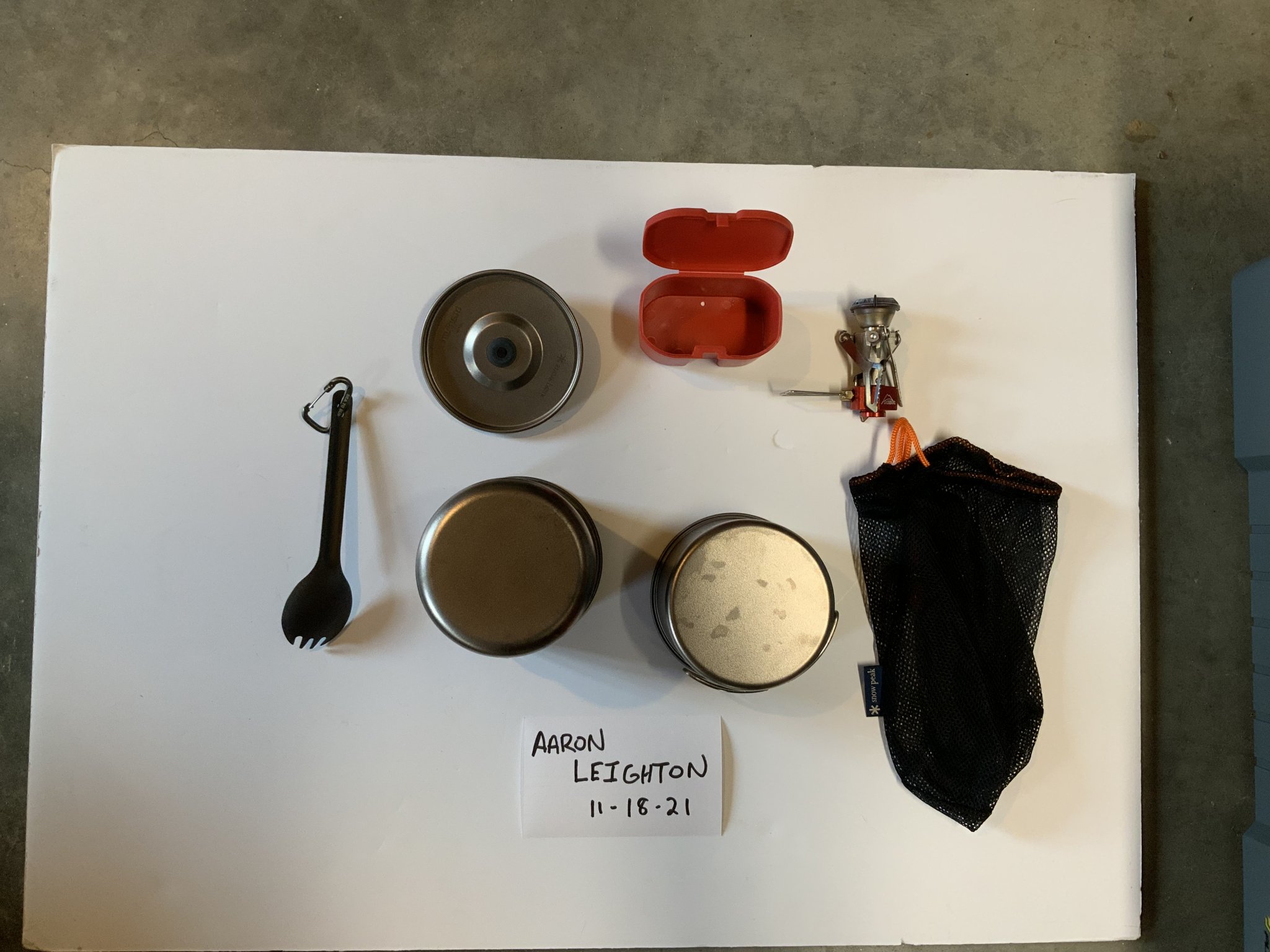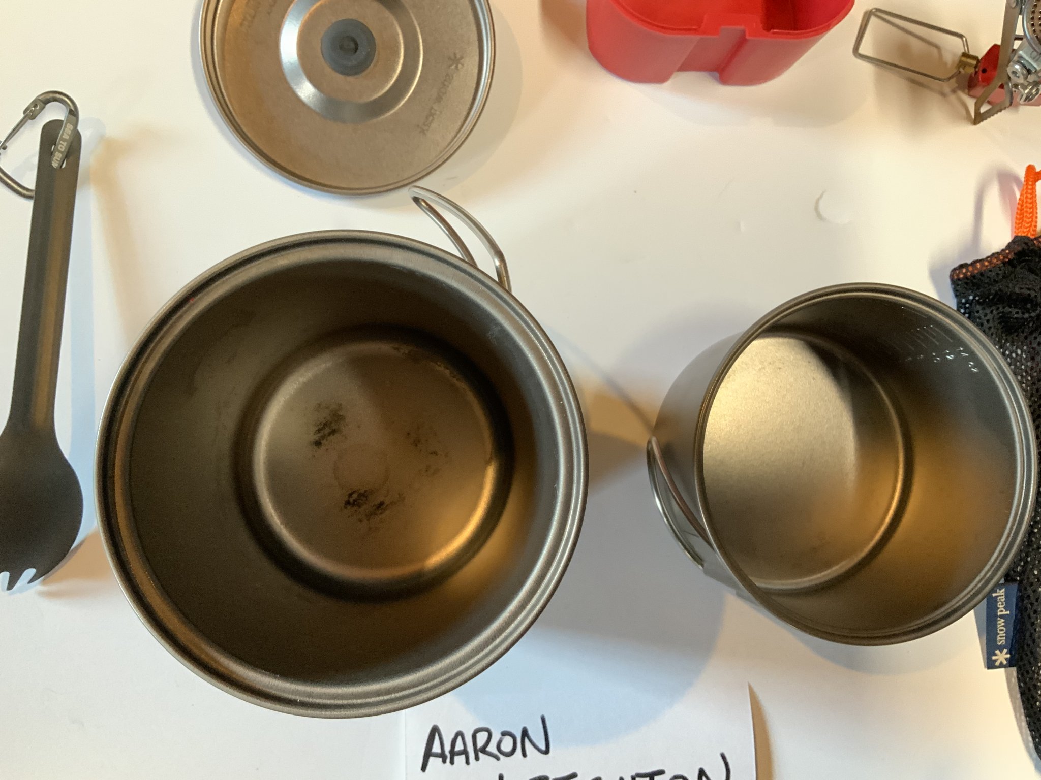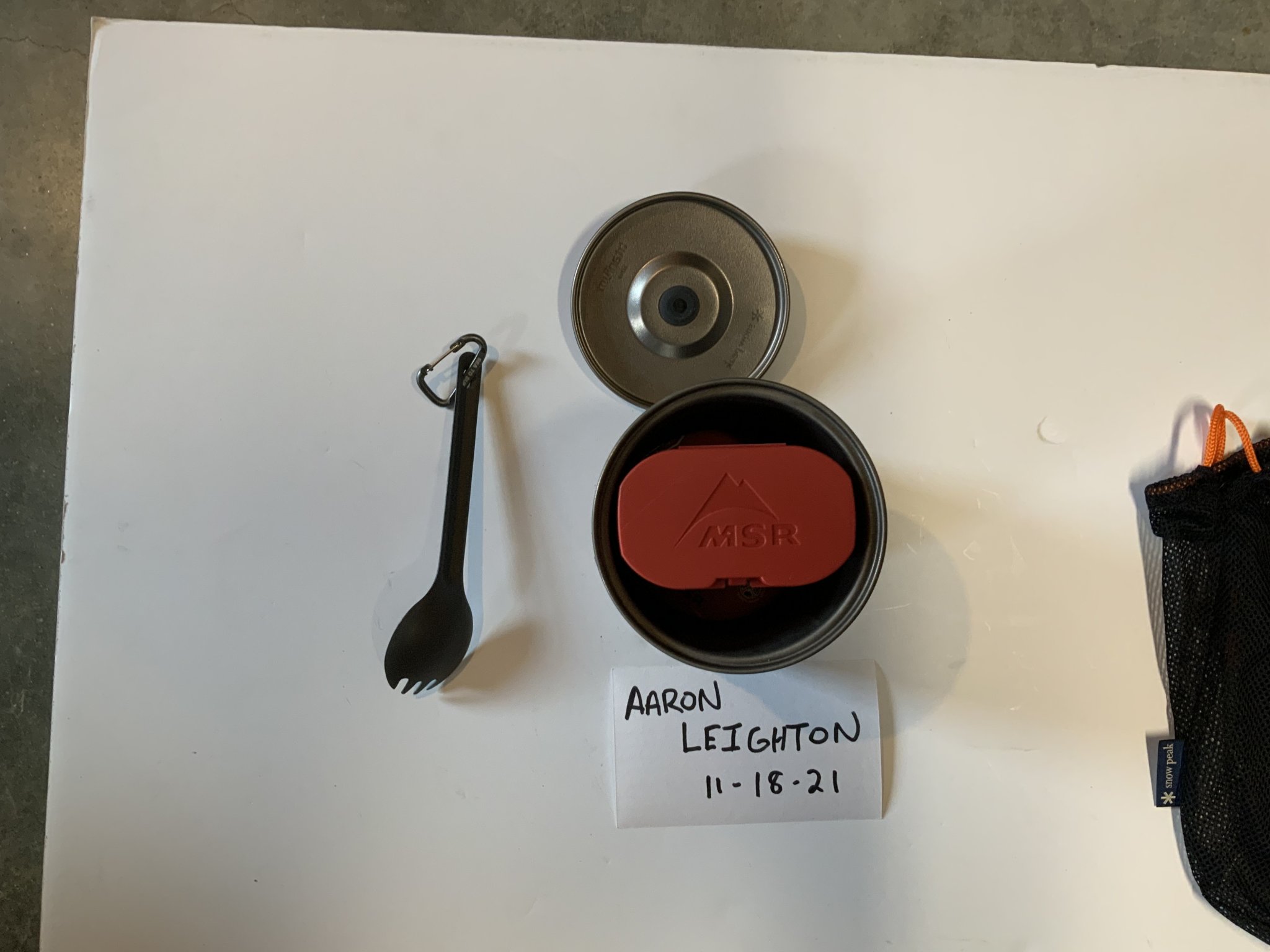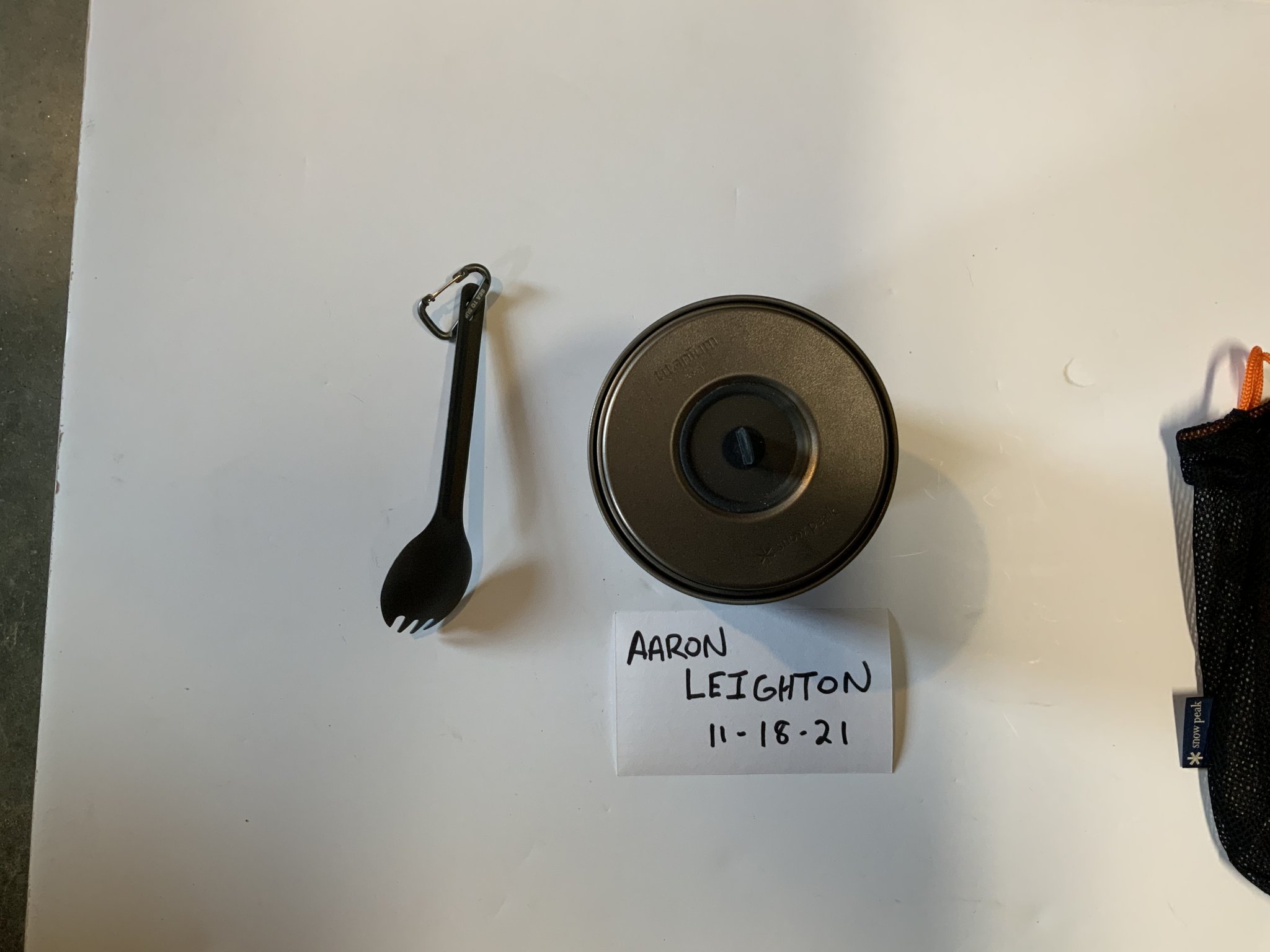 SOLD Snow Peak Ti Mini Solo w/ Mesh Storage Sack (6.9oz), MSR Pocket Rocket 2.0 w/ Storage Case (3.7oz), Snow Peak Spork w/ Mini Carabiner (.5oz)