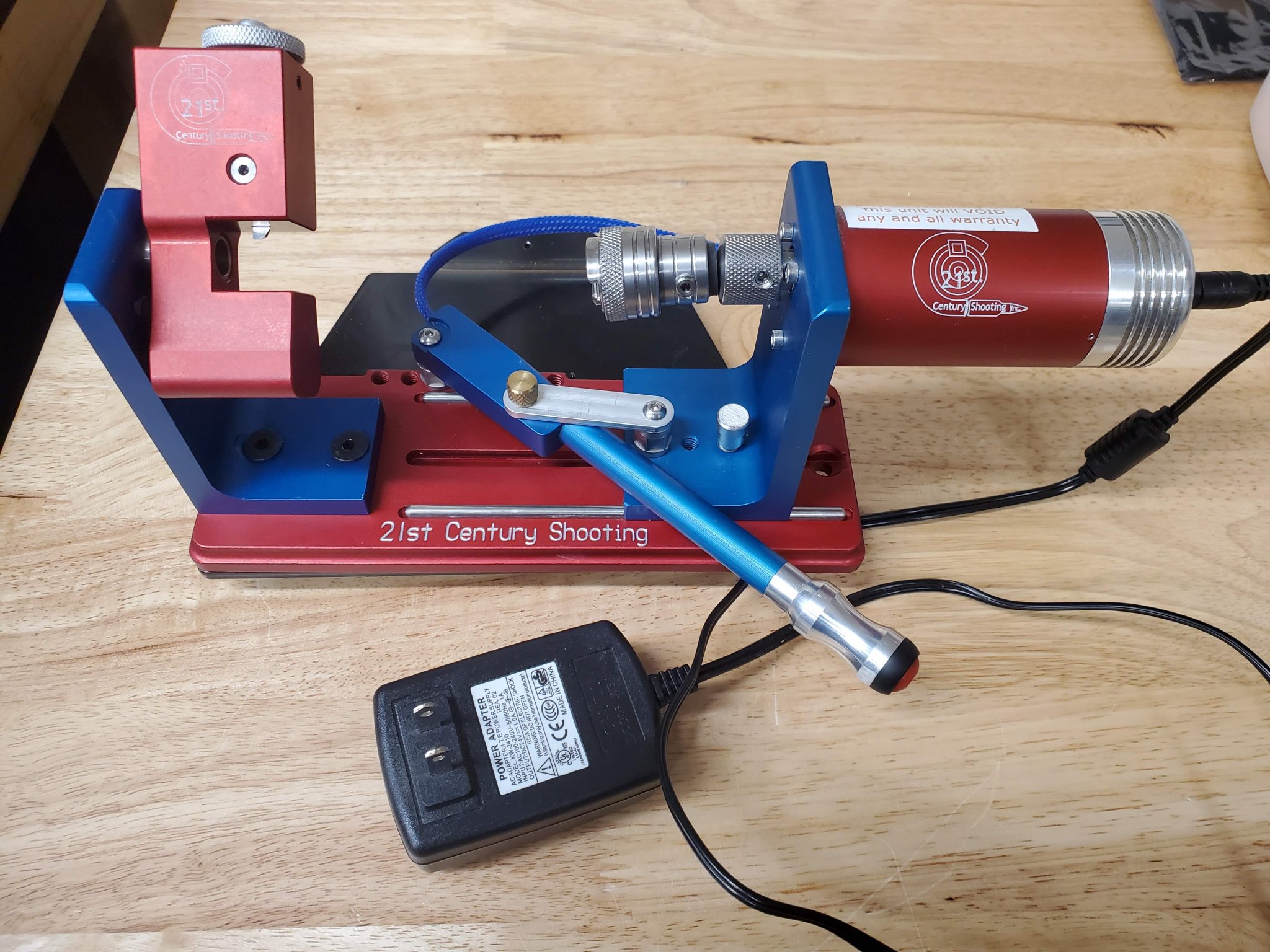 The power head glides on stainless steel guide rails. Power is supplied via button that is build into the feed handle for very precise feed rate. The floating design of the neck turner and case driver allows the case mouth (bore) to run on the arbor absolutely concentric, allowing O.D. to be turned concentric with I.D. The 21st Century cutting tool is: