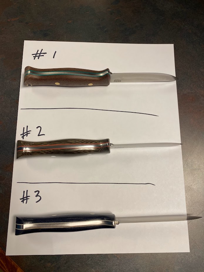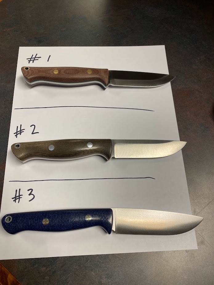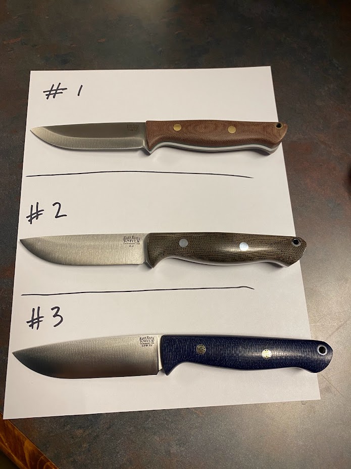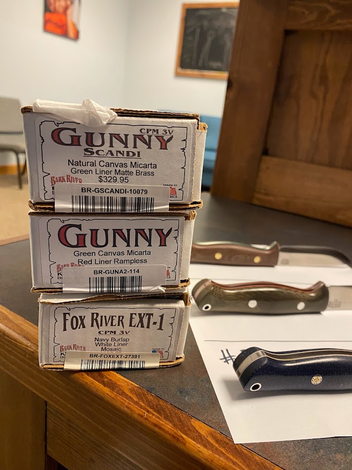 1. Bark River Gunny Scandi (CPM 3V). Natural Canvas Micarta with Green Liners. This is used, but I just got it back from a "spa day" by Bark River. She looks brand new and is razor sharp