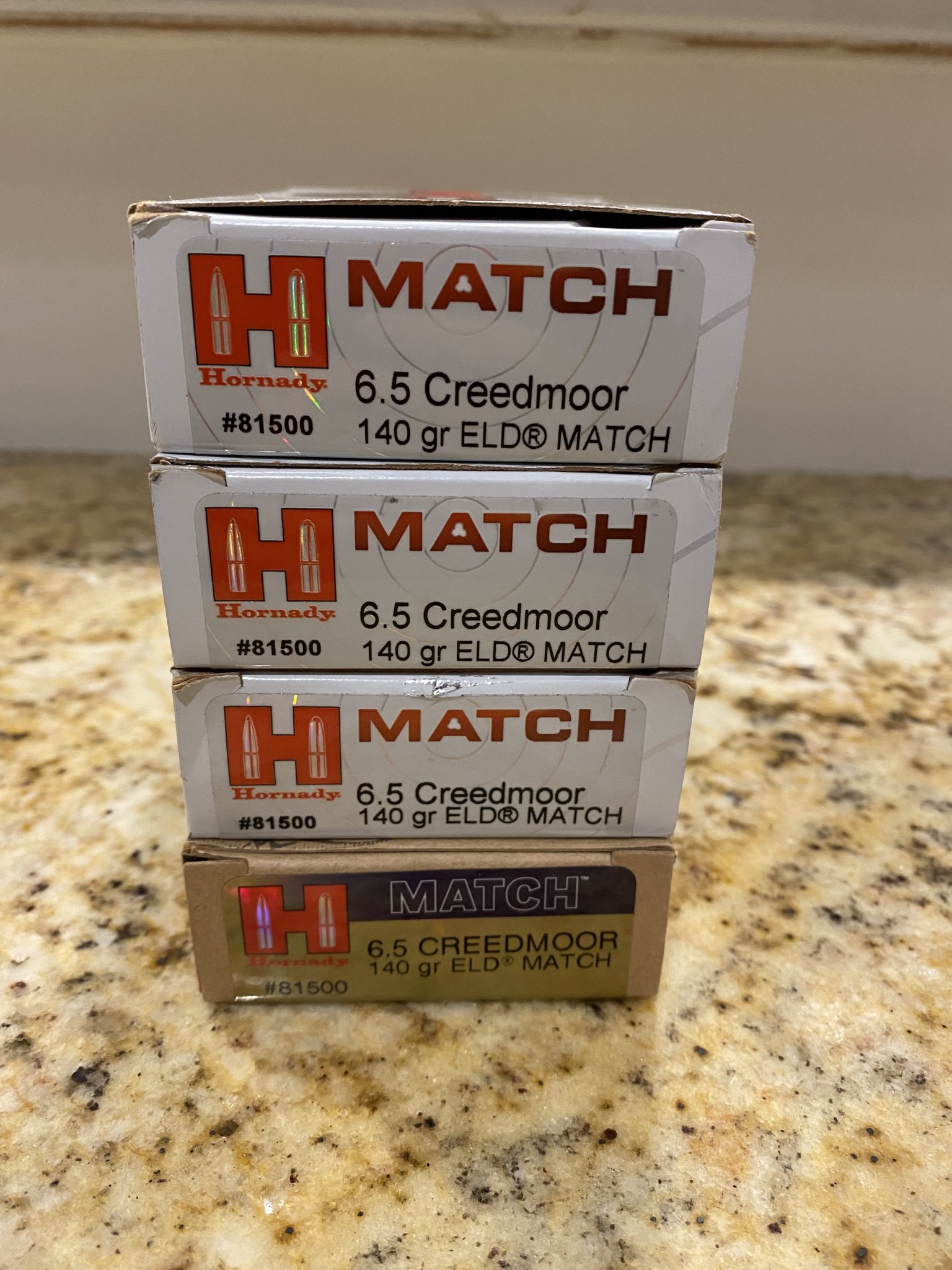 I have 80 rounds of 6.5 creedmoor Hornady 140 grain ELDM available. 2 are the same lot, the others vary.