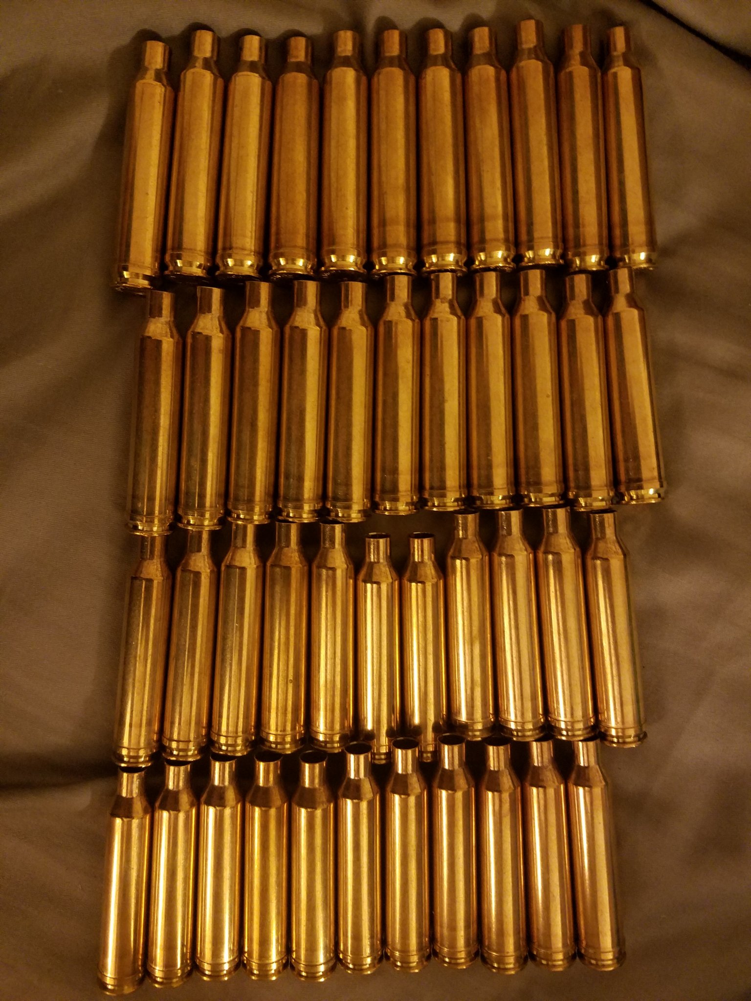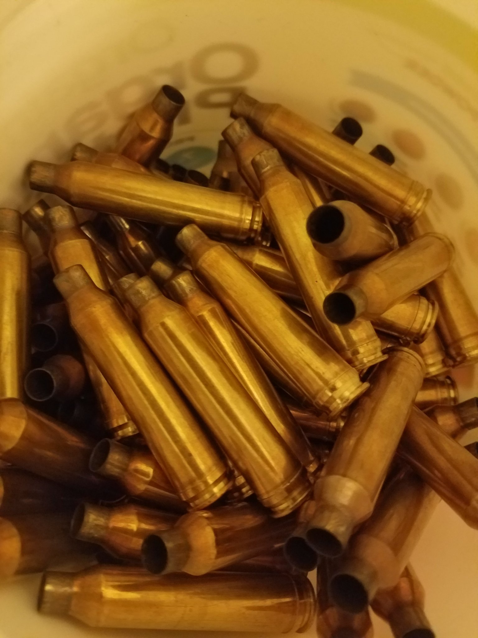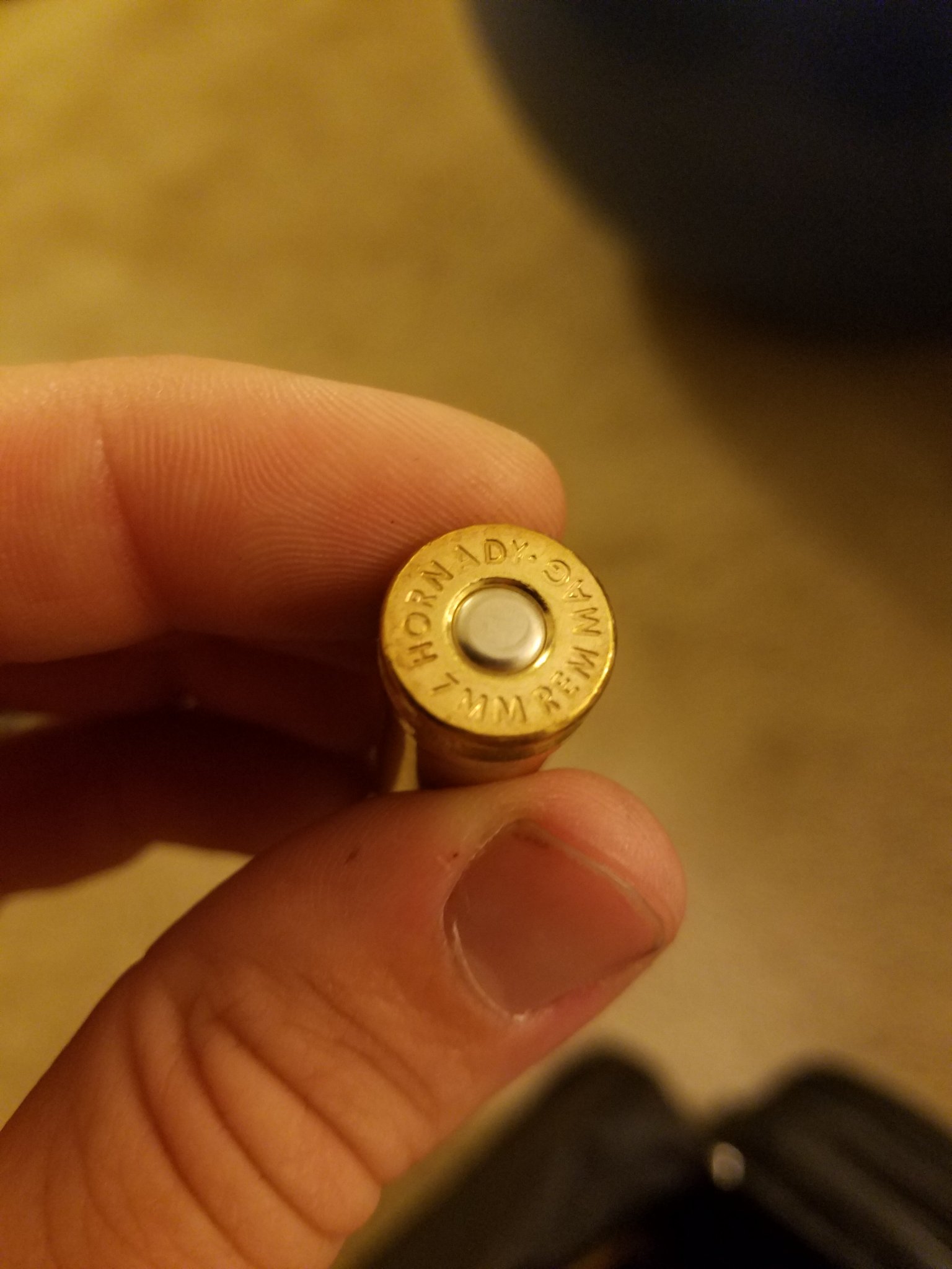 SOLD ( slightly < or > than ) 200 pieces of once fired Hornady 7mm Rem Mag brass along with 44 pieces of unmolested brass with CCI 250 primers from the same lot. About 40 pieces of the once-fired brass are from some factory Hornady ammo (gold primers ). $120