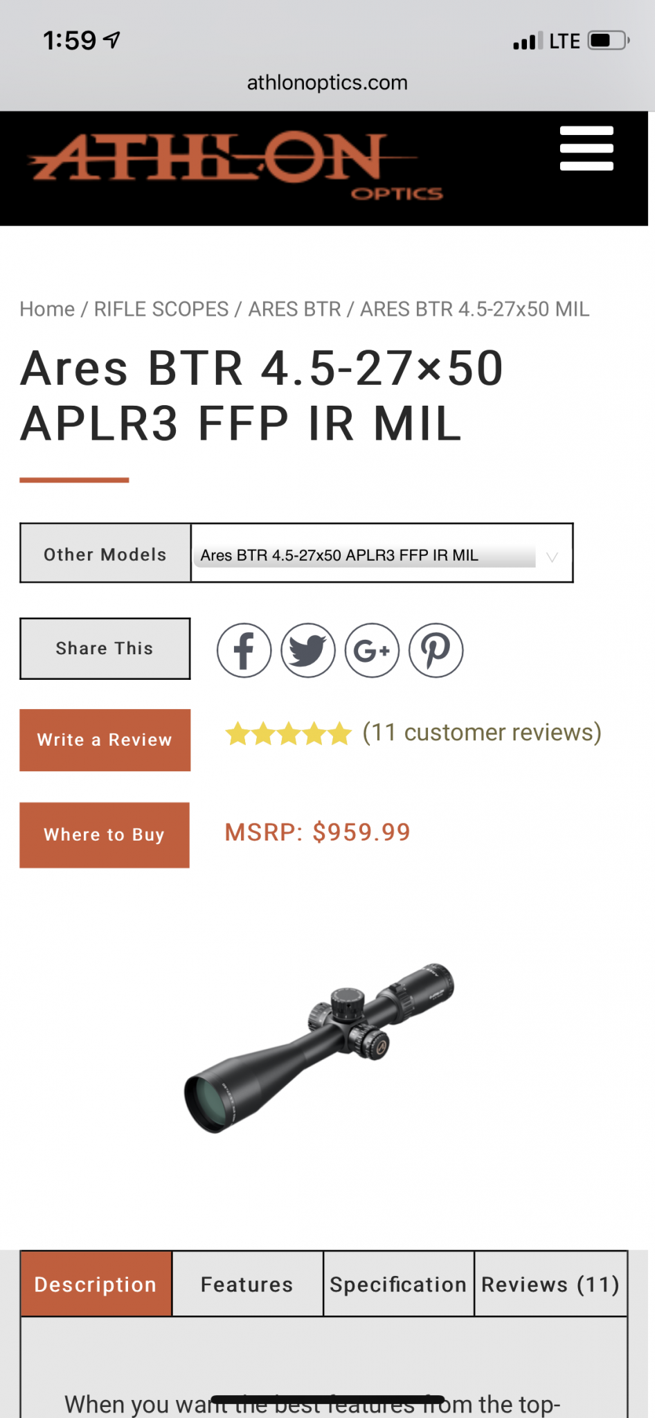 4.5-27x50 FFP APLR3 IR MIL. Model number 212007.