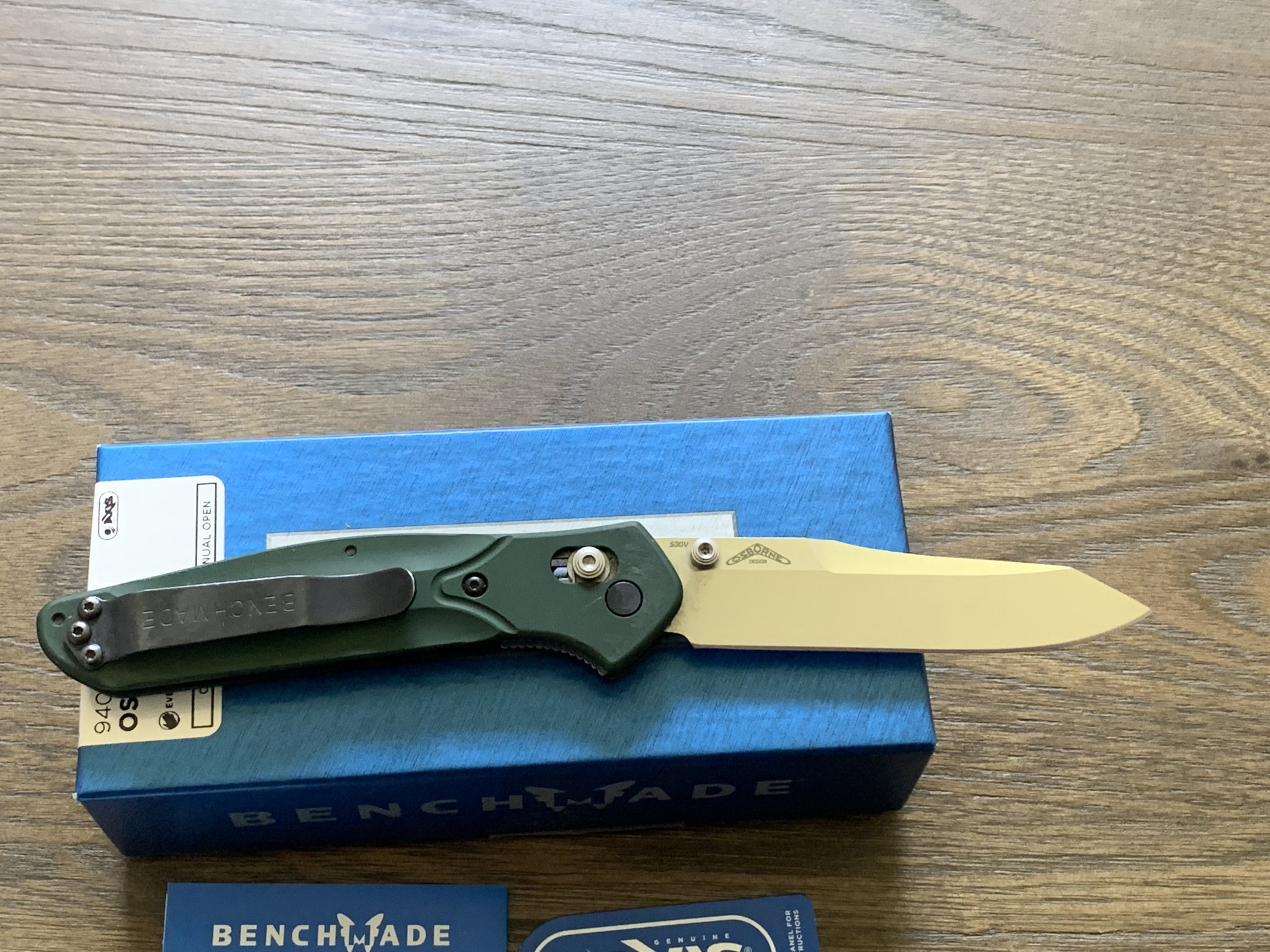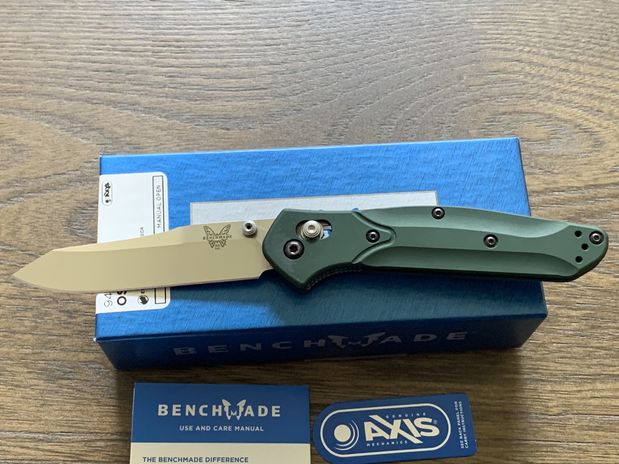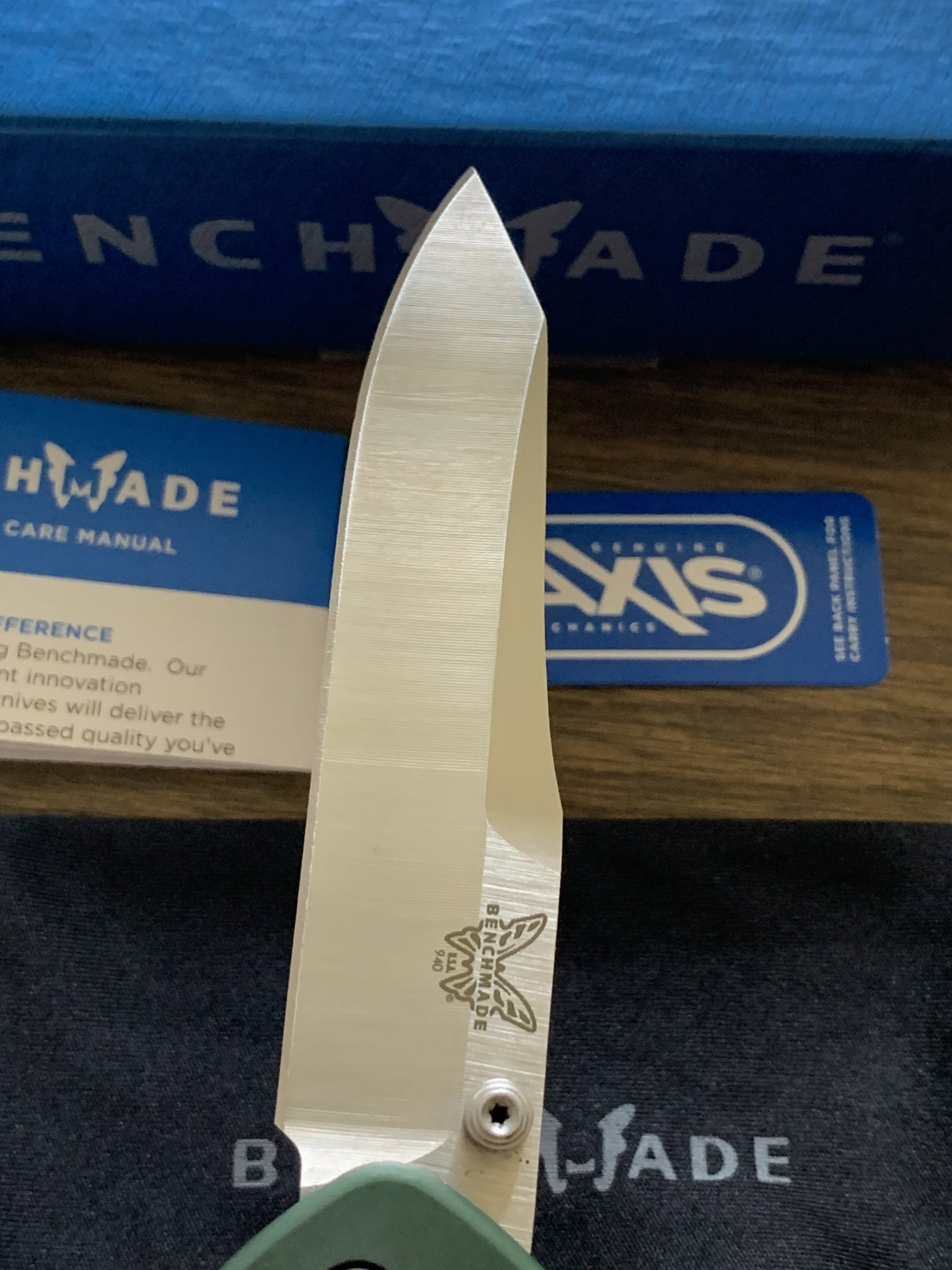 Wanting sell an excellent condition Benchmade 940 Osborne. Green anodized aluminum scales, S30V blade steel. Shows a little surface wear in the pocket clip finish but no scratches or ding that can be felt with to the touch. Comes with original box, paperwork, microfiber bag, and purchase receipt. Price is $115 shipped. PayPal f&f only, shipped CONUS.