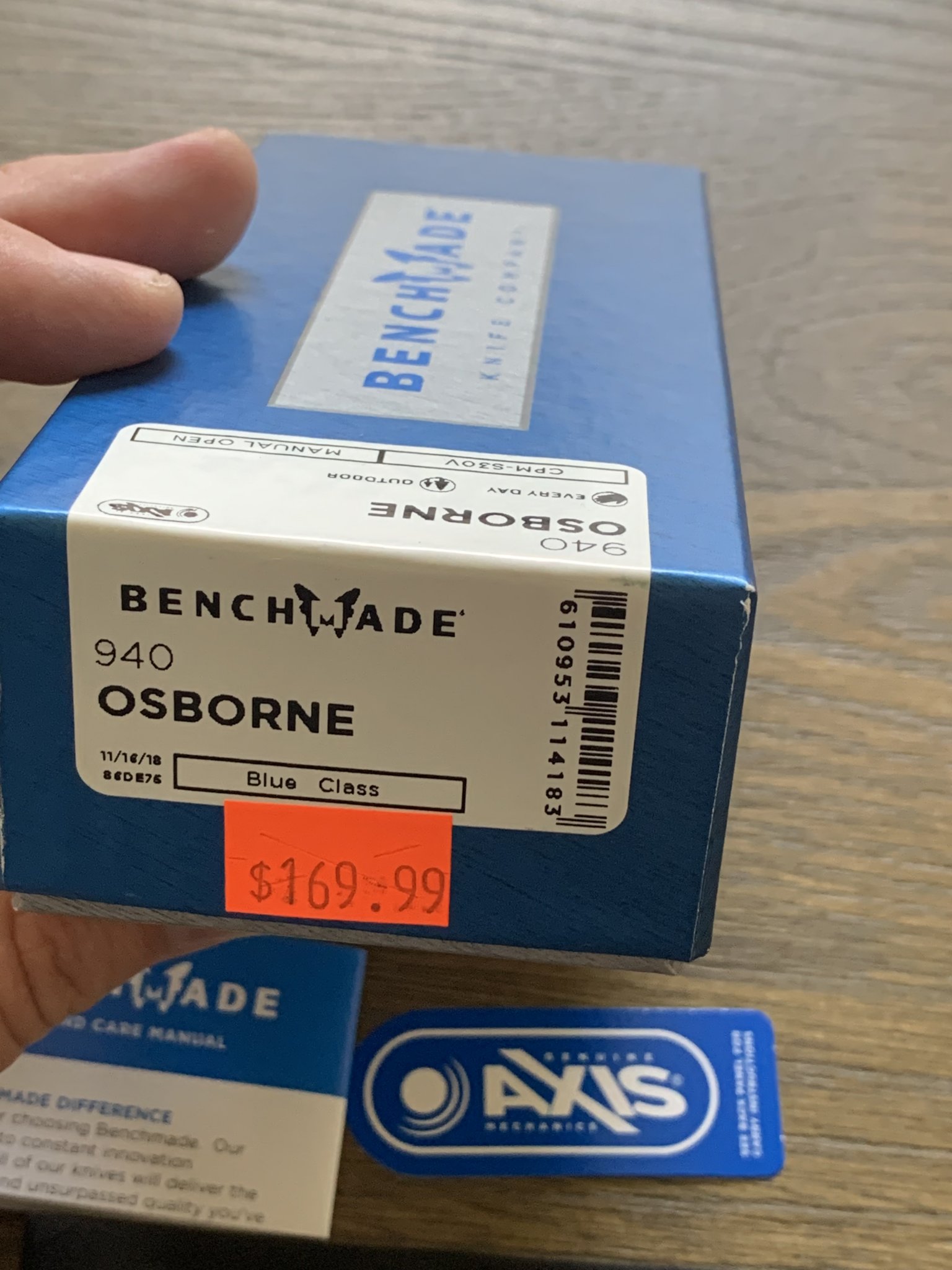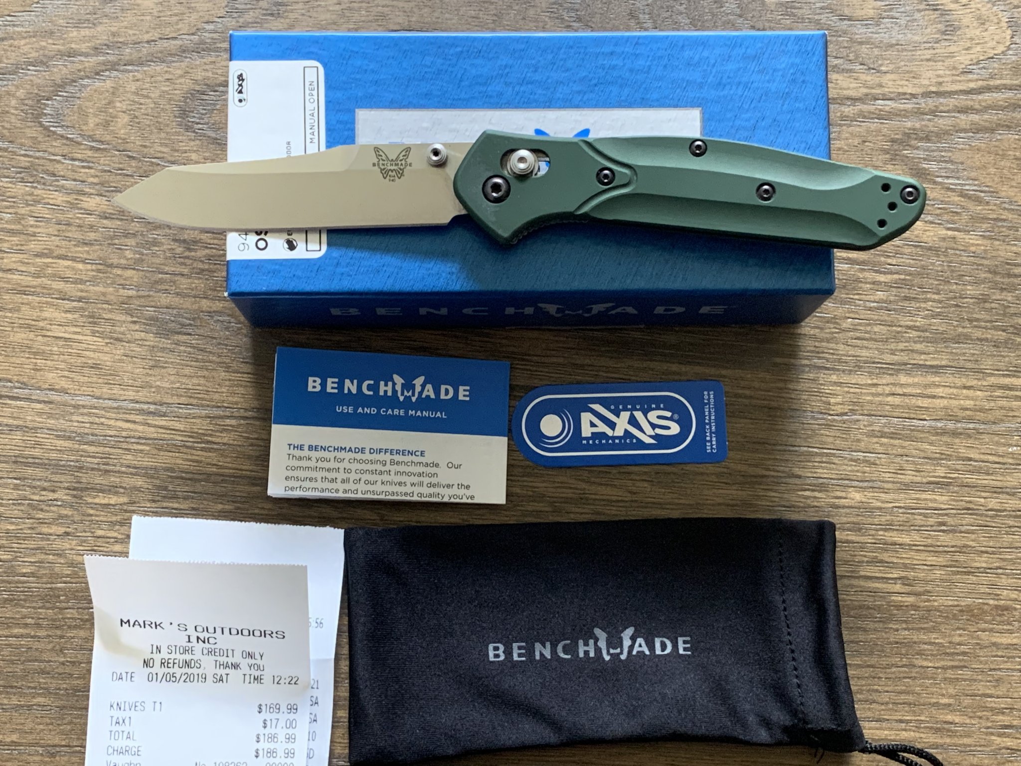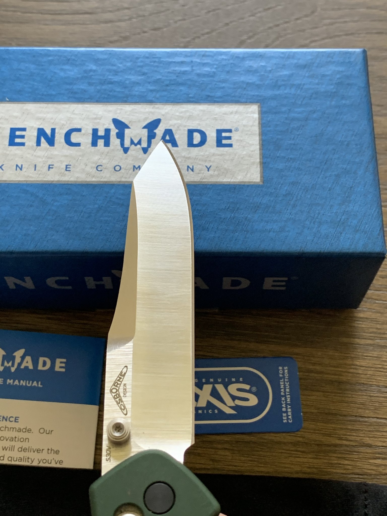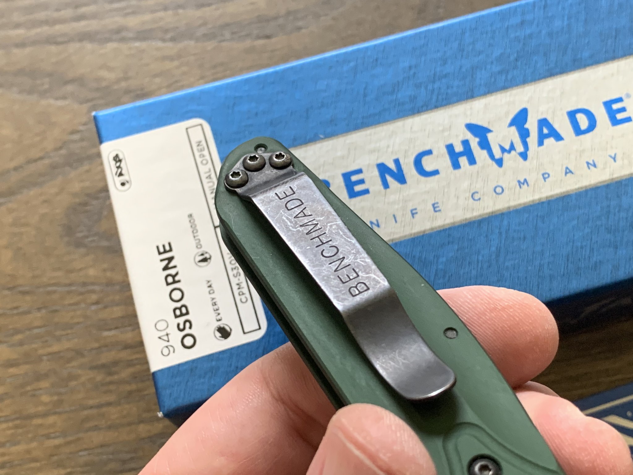 Wanting sell an excellent condition Benchmade 940 Osborne. Green anodized aluminum scales, S30V blade steel. Shows a little surface wear in the pocket clip finish but no scratches or ding that can be felt with to the touch. Comes with original box, paperwork, microfiber bag, and purchase receipt. Price is $115 shipped. PayPal f&f only, shipped CONUS.