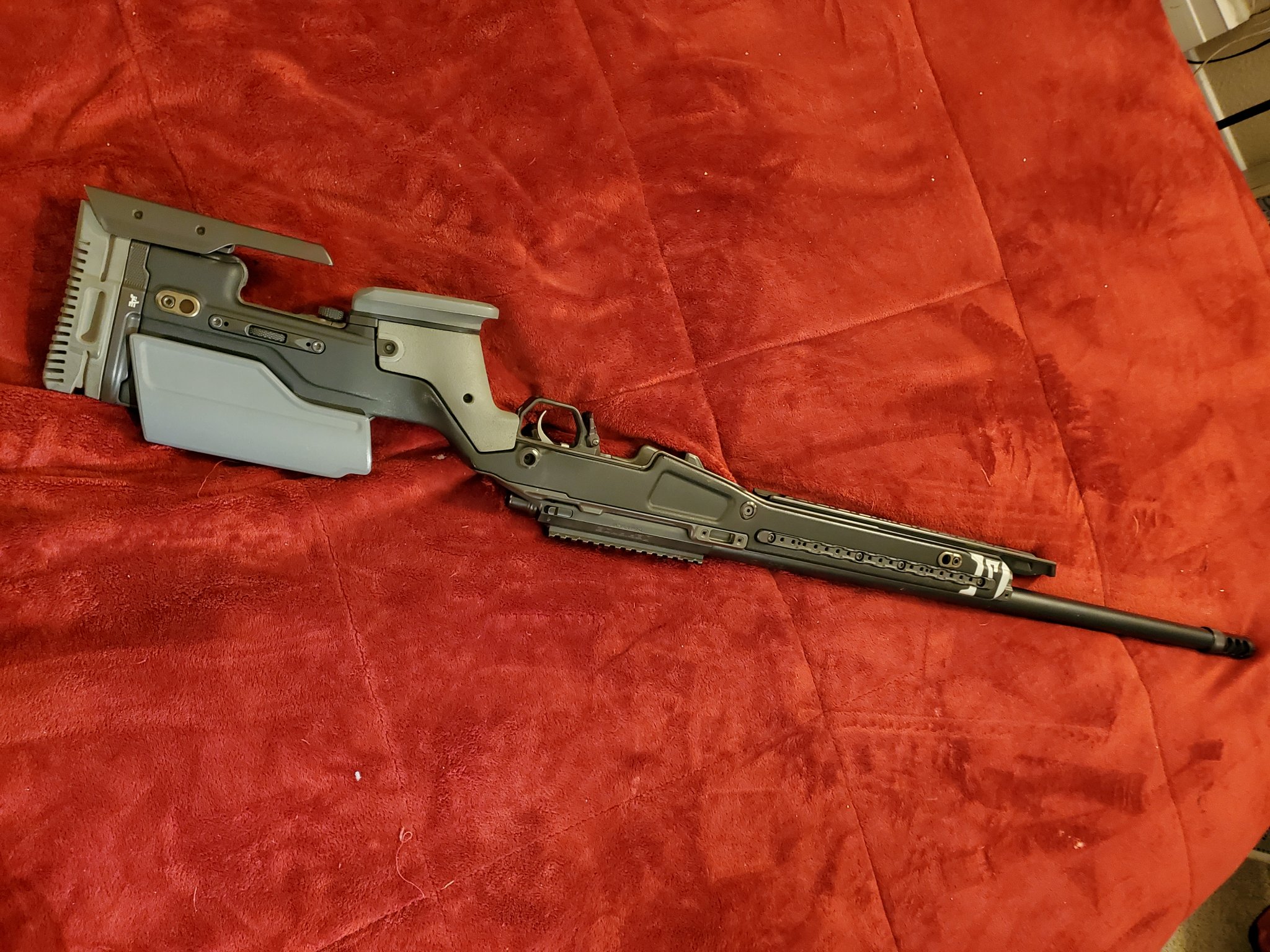 The chassis is black and silver with the Jallen nose art. It comes with the Bag rider, arca rail that extends past the forend, and all the other accessories that come with a Jallen. The chassis is literally brand new. No marks or scuffs and not even used in matches. It was $2200 outfitted as it is. It does have engraving on the butt stock but that would easily be blanked out with the right tools.