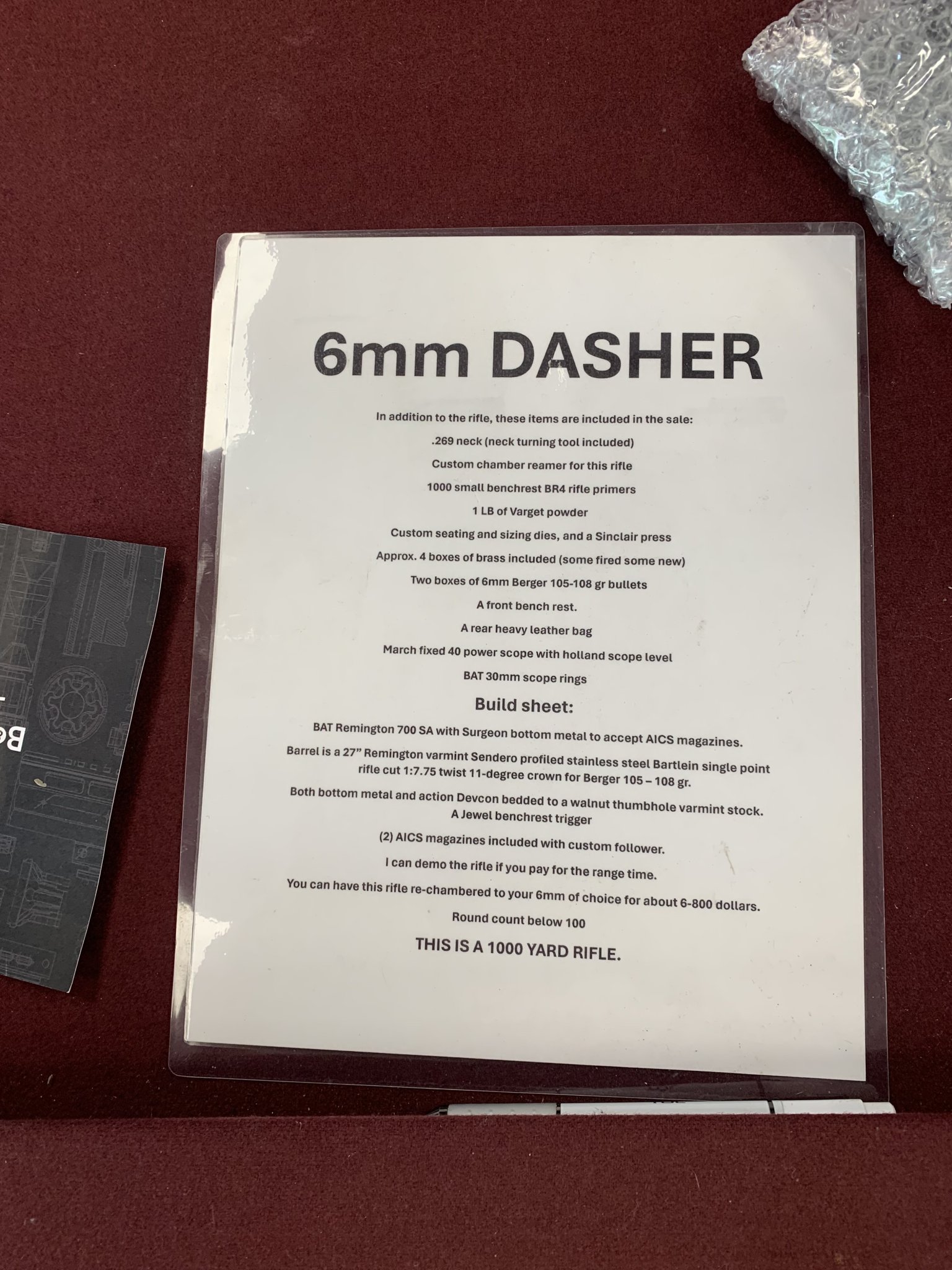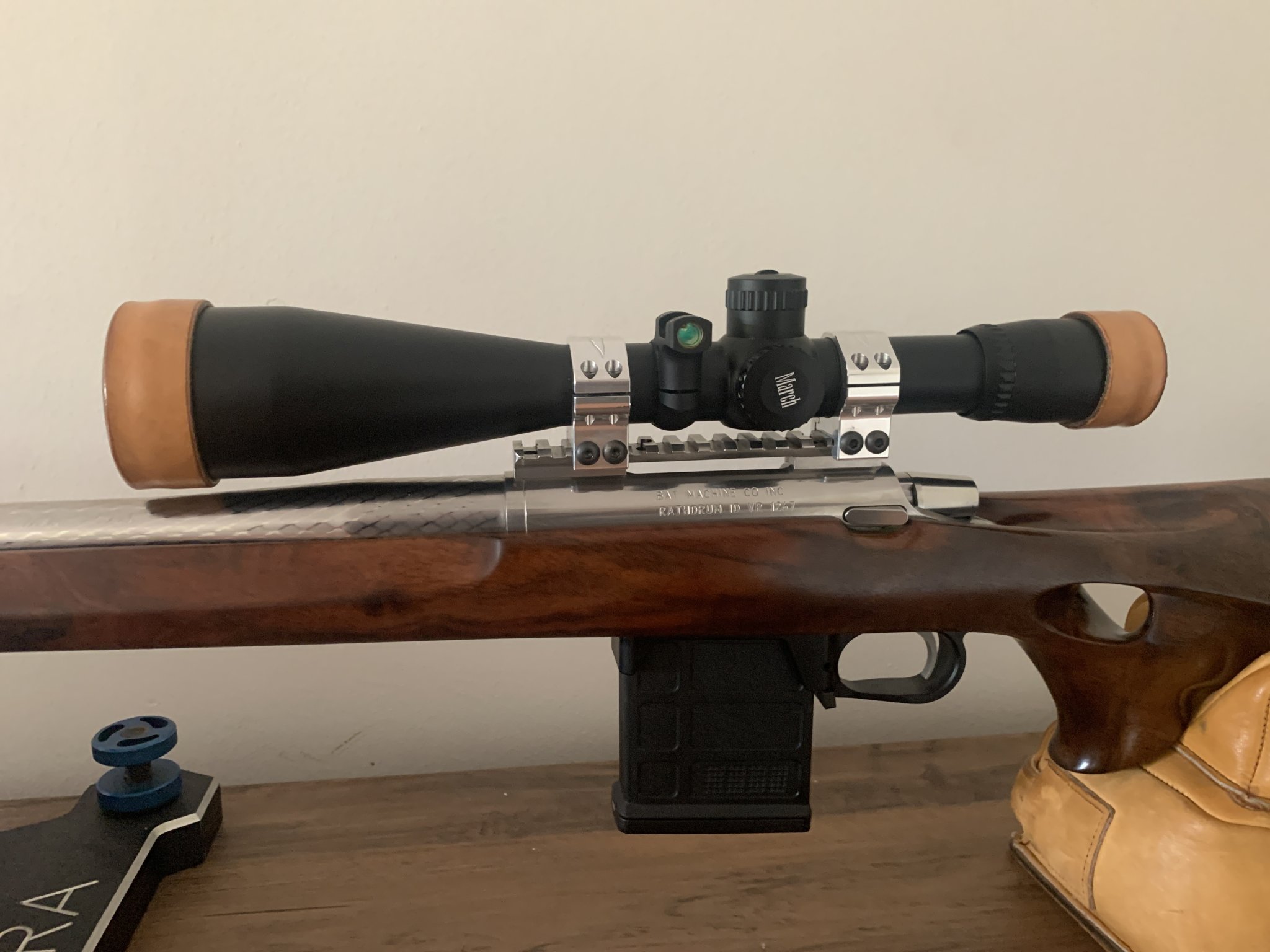 This is a completely custom 6mm Dasher bench shooting competition rifle. The action is by BAT Precision, the barrel is by Bartlein. All additional work to the rifle from assembling to seating to the custom finishing on the barrel and furniture was provisioned by Gre-Tan. The optic is a Deon MARCH fixed power 48x scope with the classic crosshair reticle.