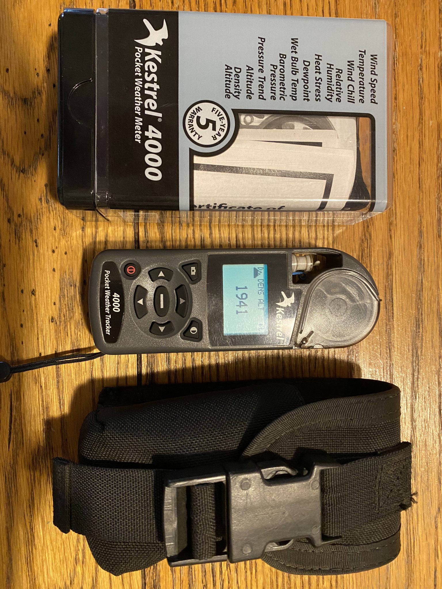 Kestrel Gray 4000. Discontinued model that still works great for weather information. Used for a few years, but still in great condition.