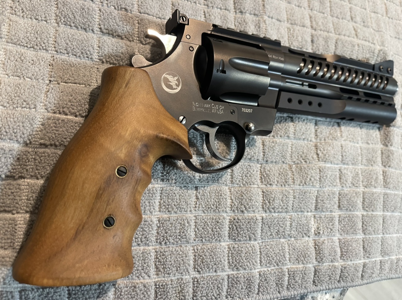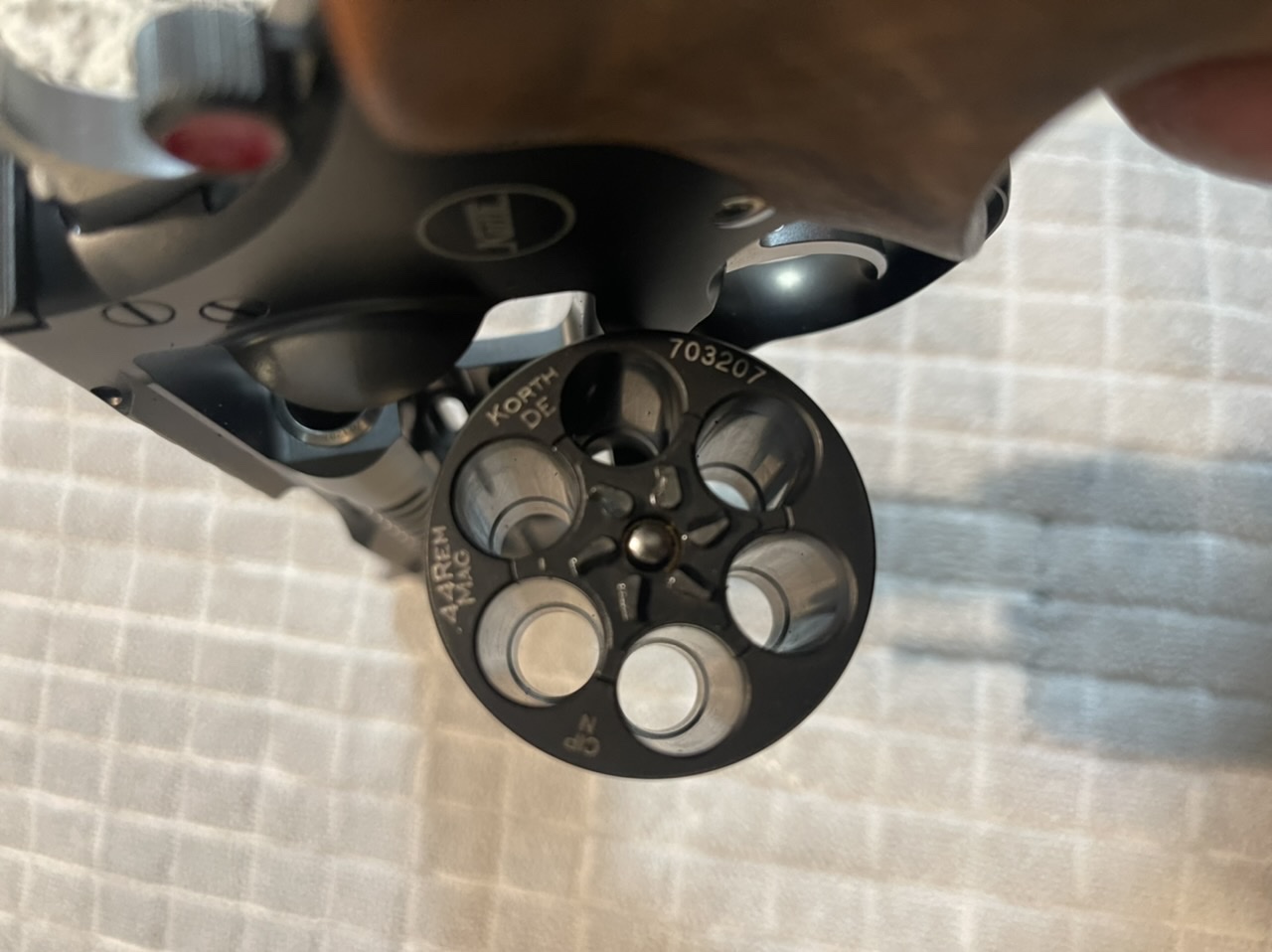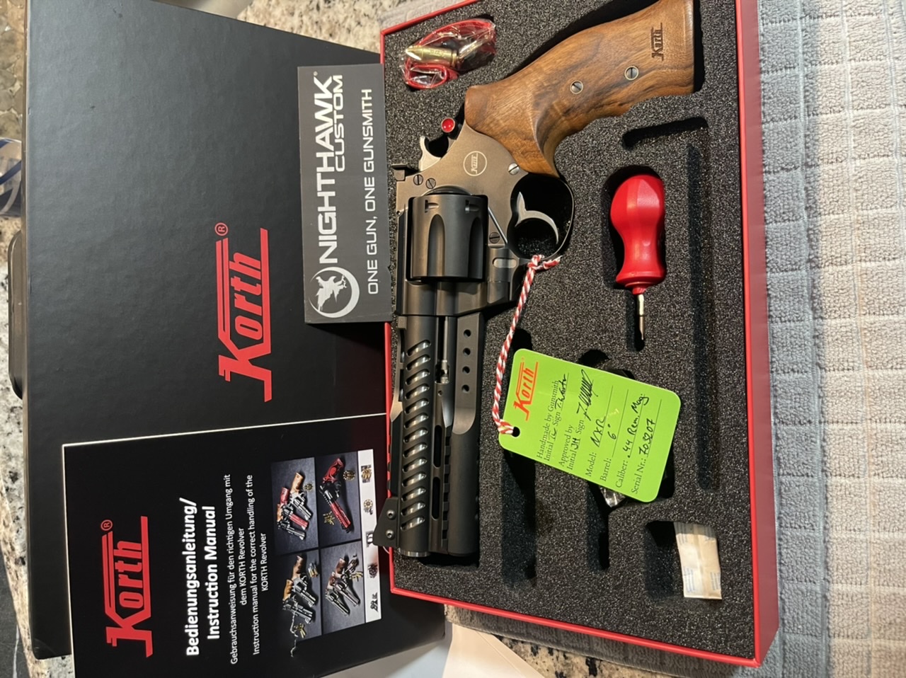 This is a NIB Korth NXR fresh from Germany with under-barrel weight pictured (not installed) The Korth NXR brings a six-shot .44 Magnum to the legendary roster of Korth revolvers. The NXR is available with a 6” hammer-forged precision barrel and an integrated Picatinny rail on the frame. The barrel housing has been ventilated for faster cooling while the entire revolver has a DLC finish for a beautiful yet durable look. There is an additional Picatinny rail mounted below the barrel, which allows you to run the weight bar or remove it for an additional bottom rail. The NXR features an adjustable rear sight with a fast-changeable front sight. Removable side panels to the front sight give this revolver versatility in a wide range of shooting disciplines. A Turkish Walnut grip gives this .44 Magnum powerhouse a look just as fierce as its performance.
