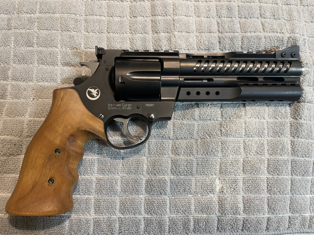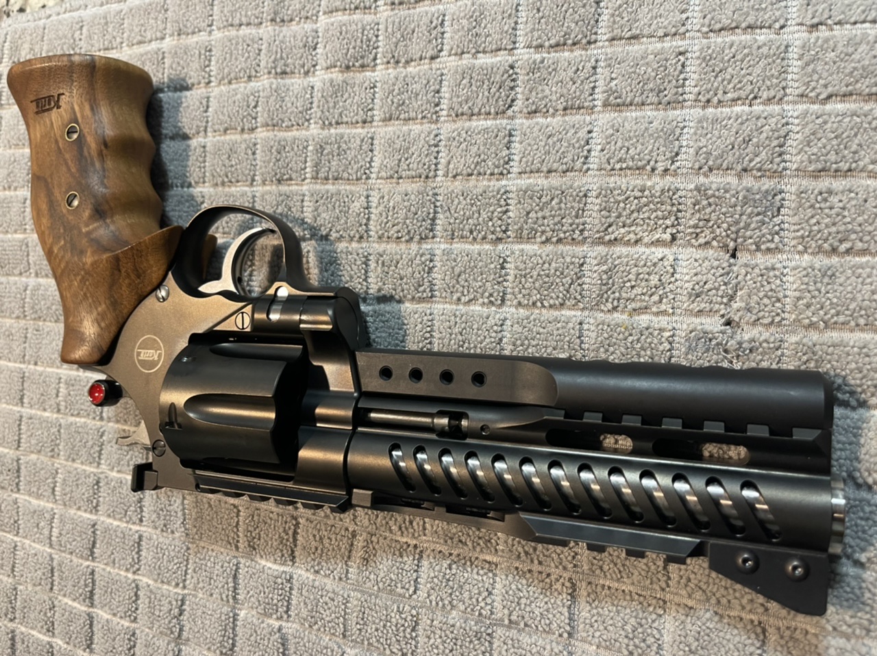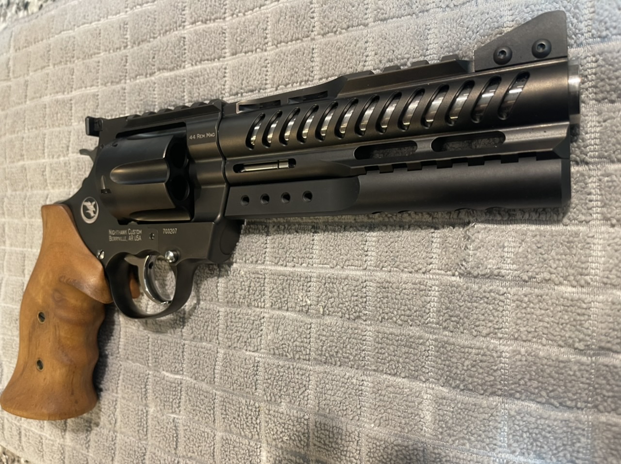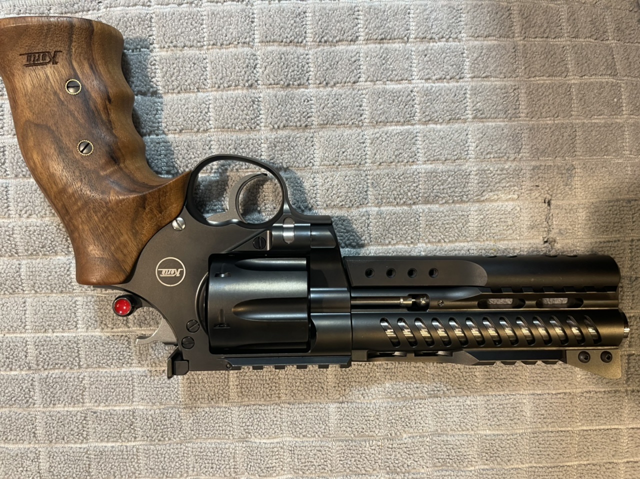 This is a NIB Korth NXR fresh from Germany with under-barrel weight pictured (not installed) The Korth NXR brings a six-shot .44 Magnum to the legendary roster of Korth revolvers. The NXR is available with a 6” hammer-forged precision barrel and an integrated Picatinny rail on the frame. The barrel housing has been ventilated for faster cooling while the entire revolver has a DLC finish for a beautiful yet durable look. There is an additional Picatinny rail mounted below the barrel, which allows you to run the weight bar or remove it for an additional bottom rail. The NXR features an adjustable rear sight with a fast-changeable front sight. Removable side panels to the front sight give this revolver versatility in a wide range of shooting disciplines. A Turkish Walnut grip gives this .44 Magnum powerhouse a look just as fierce as its performance.