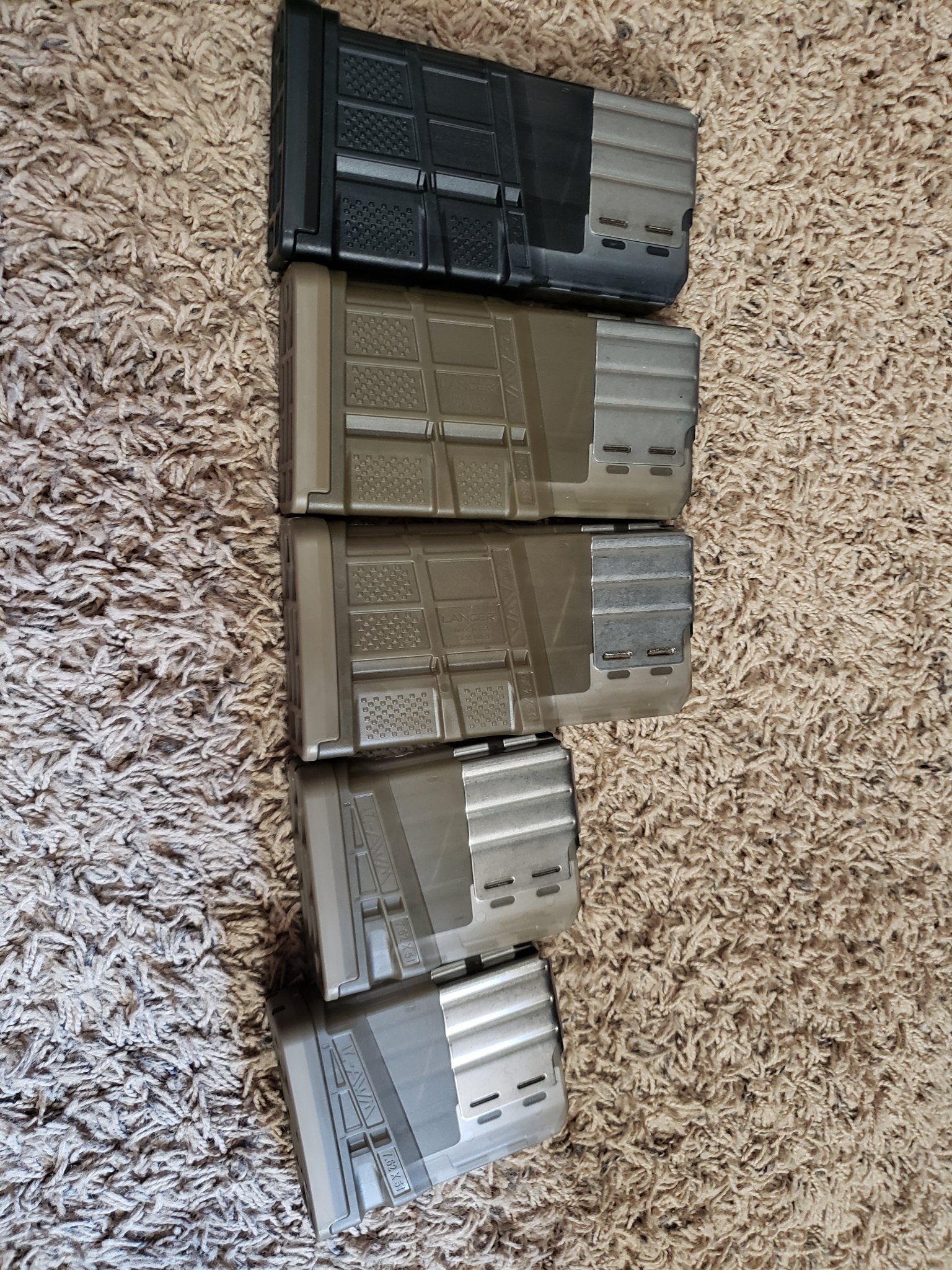 5 lancer L7 308 ar 10 mags for sale as a package. 2 translucent fde 10 rounds, 2 translucent fde 20 rounds, 1 translucent smoke 20 round. 170 shipped for all 5. All are in mint condition, 3 haven't ever even been used.