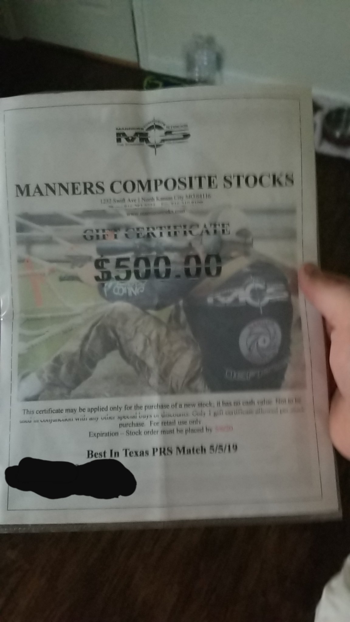 I have a manners $500 off stock purchase cert for sale from Best in Texas. I'd like to get $400 for it OBO. Also interested in maybe trading for bartlien barrel cert.