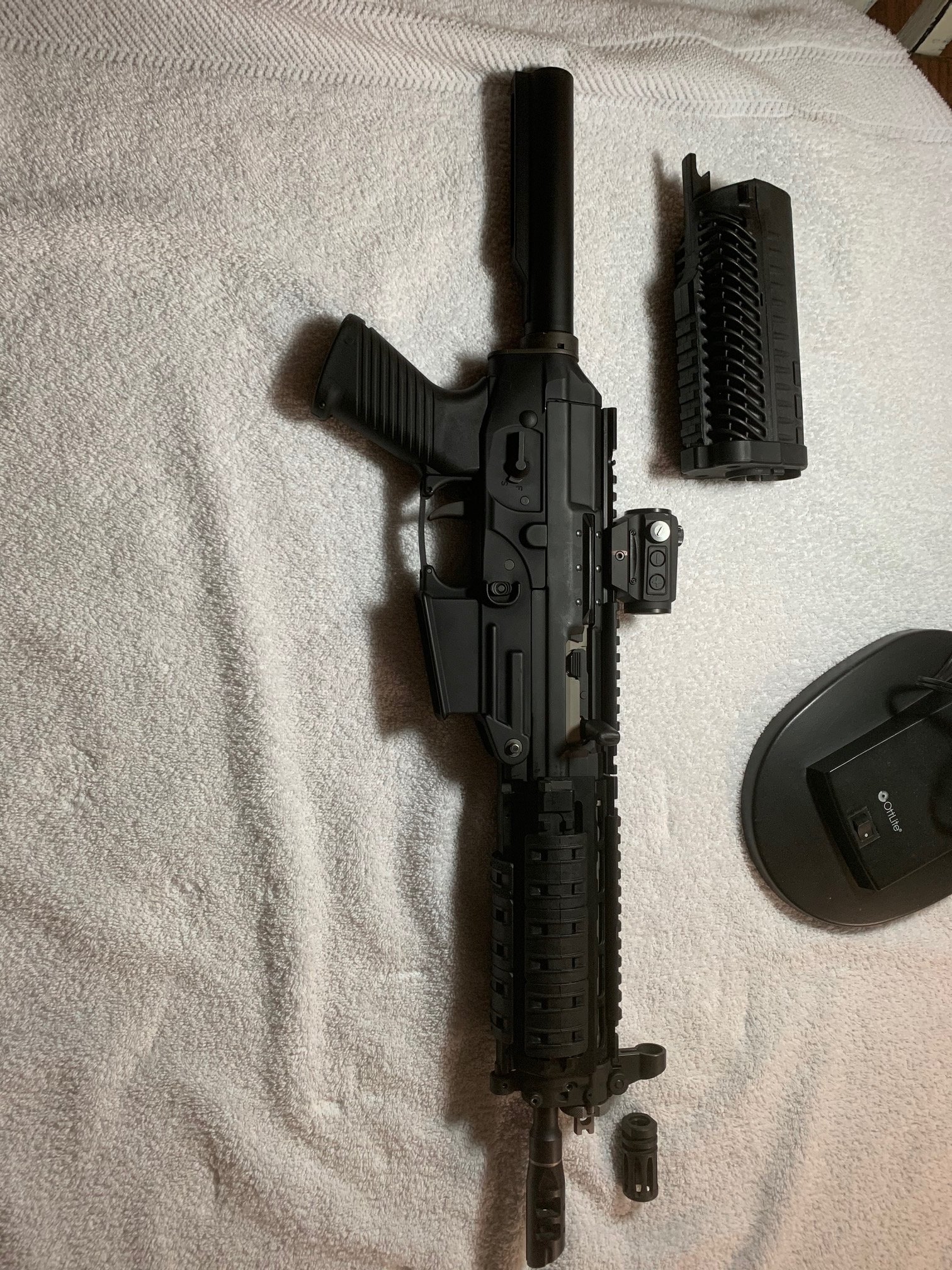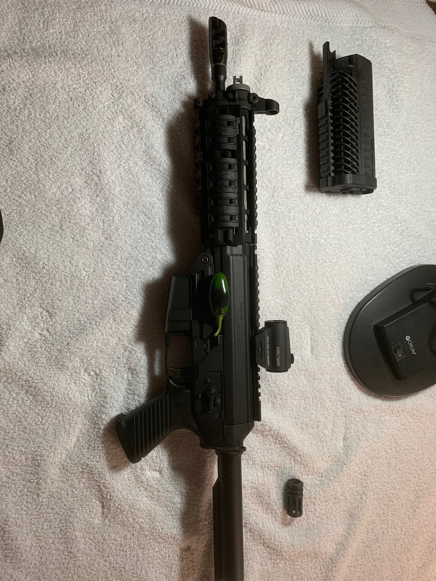 This is a Sig P556 that has never been fired. Pistol has a sig Rail and rainier arms comp ( can be removed for $50 less and add bird cage original ) and push pin take down pin. I can replace the rail with regular fish gills pictured -$50 to the price, red dot will not sell with the gun. All that is needed is for you to add the brace you want. I am located in charlotte for FTF sale and has been cross posted. $1450 shipped final lower price