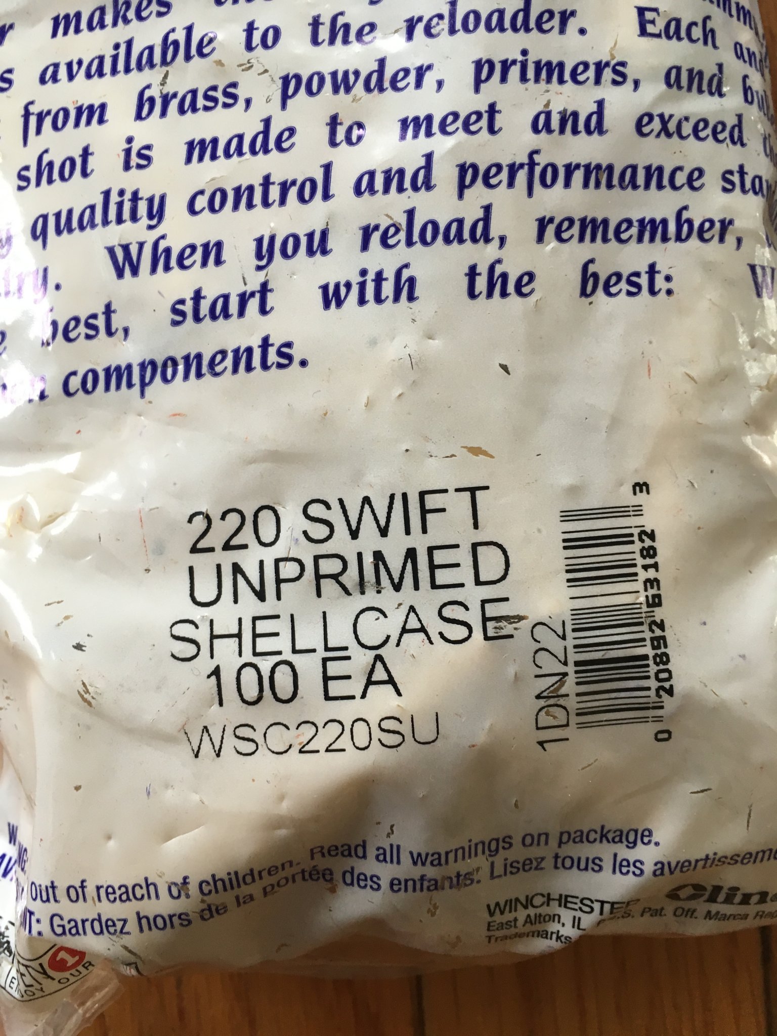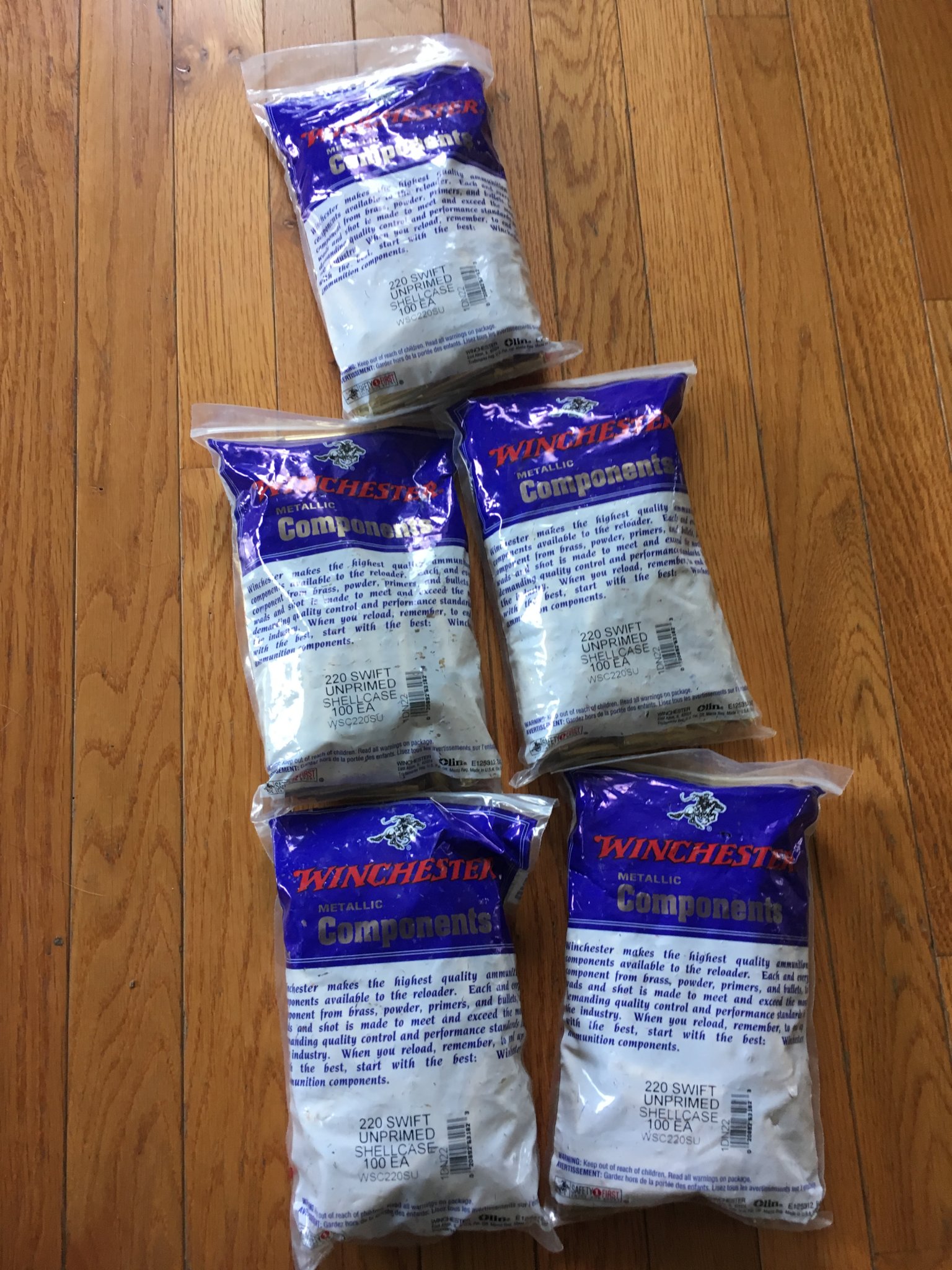 I have 500 pieces of new unprimed winchester brand 220 swift brass. This is the older blue bag Winchester brass. $275 shipped. PayPal f/f or add 3% or certified bank check( held until funds clear).