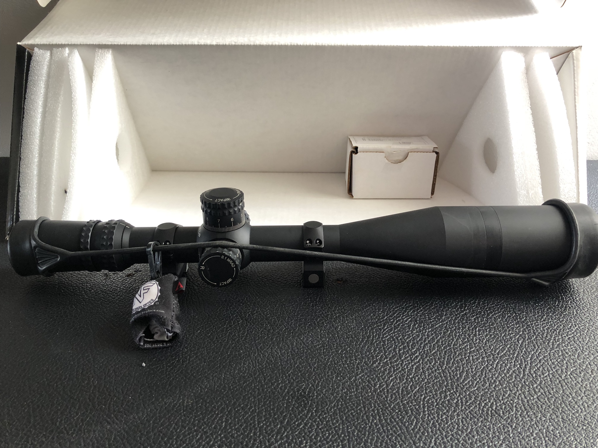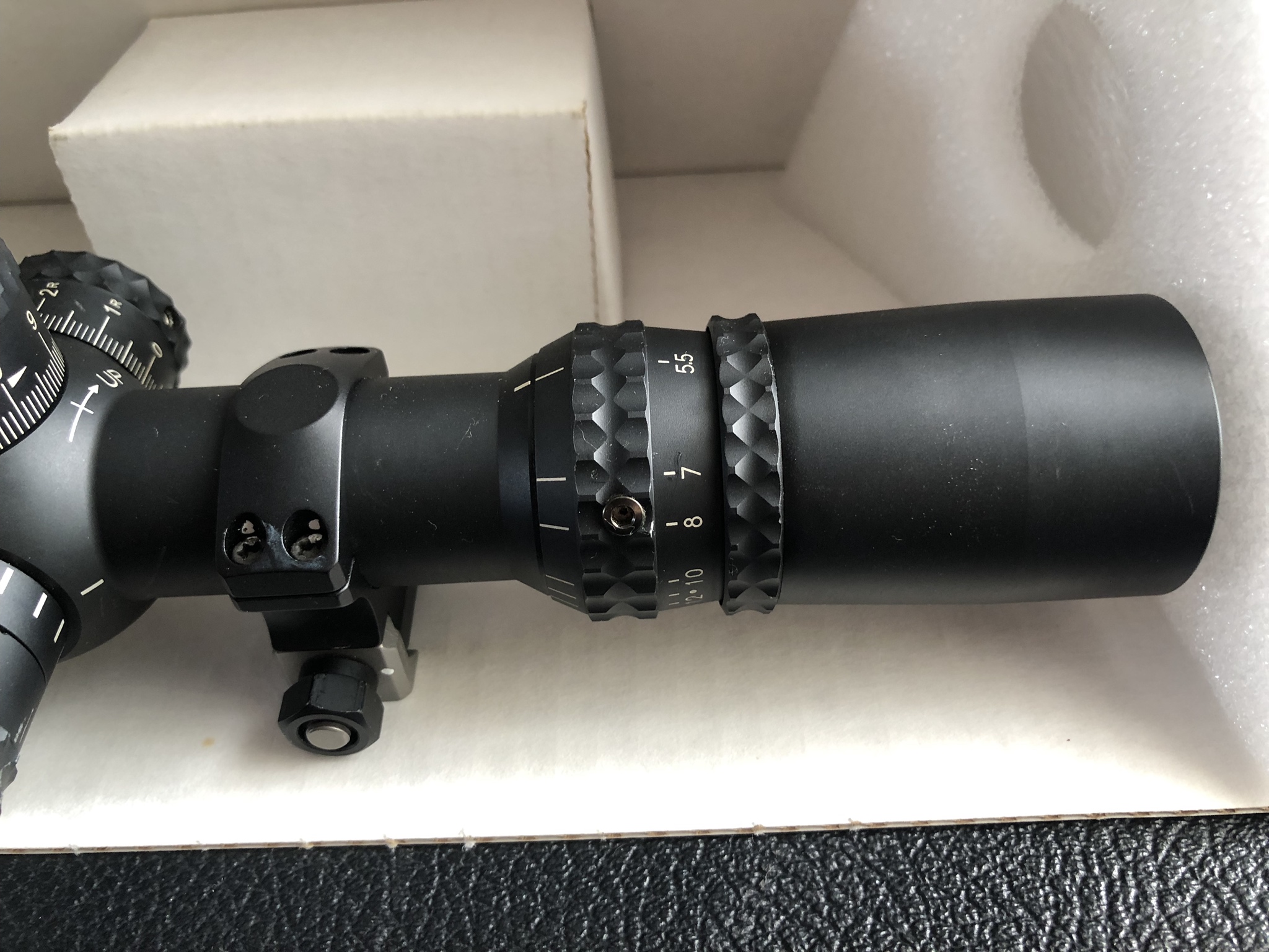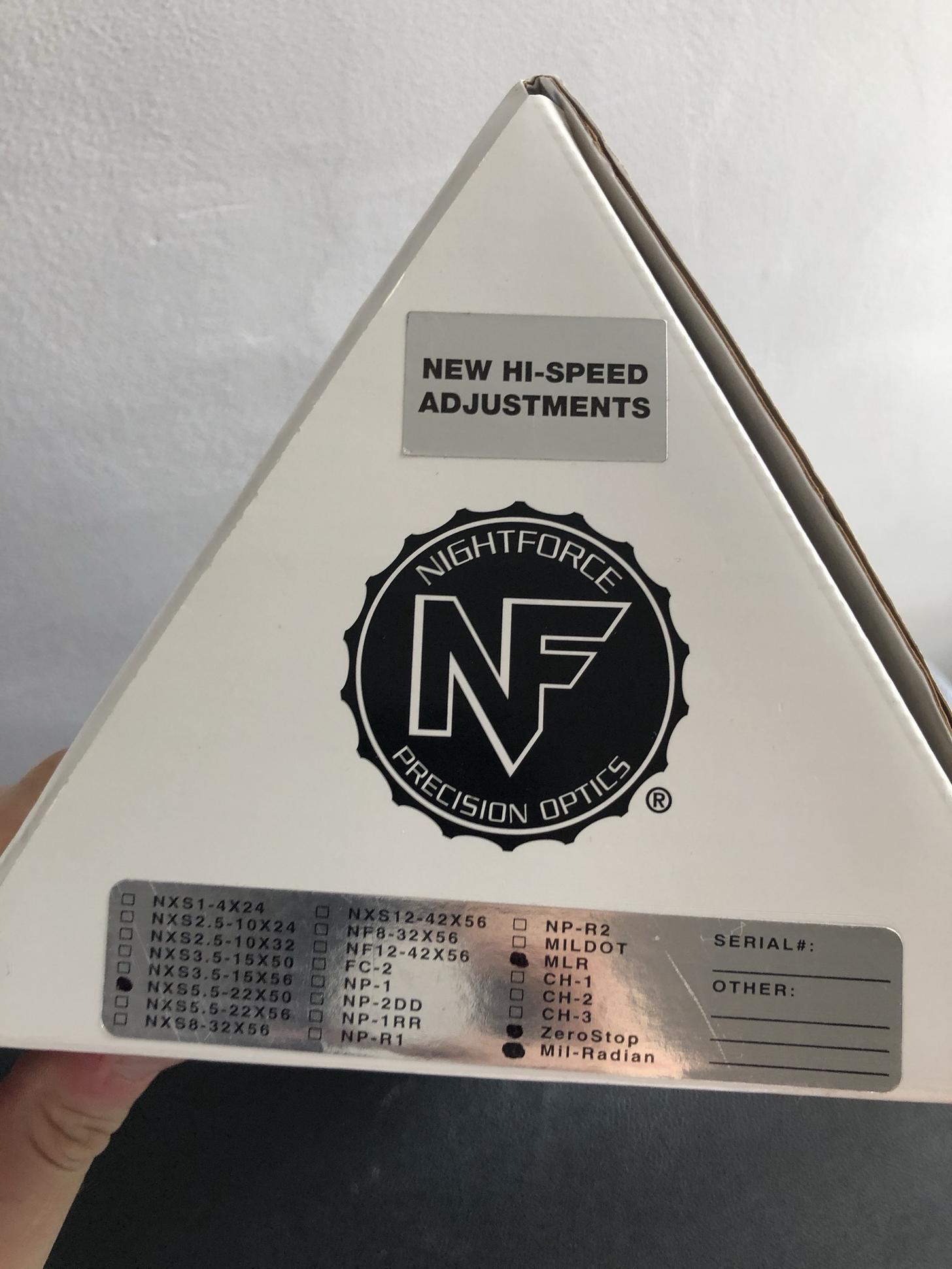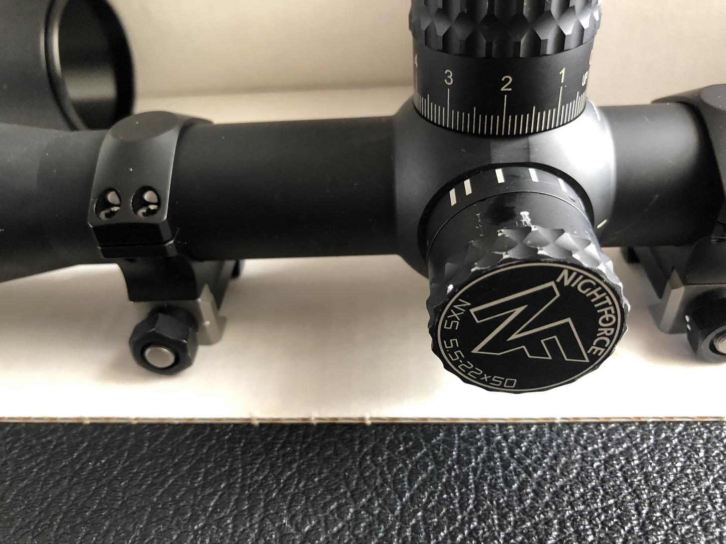 nightforce NXS 5.5-22x50 in MLR reticle with ZeroStop, mil-radian knobs, Illumination works perfectly, Few wears here and there but it tracks like it should, the glass is flawless. Comes with box, bikini lens covers, lens cloth, manual, stickers, etc. I am including a NF Ultralight rings in this sale.