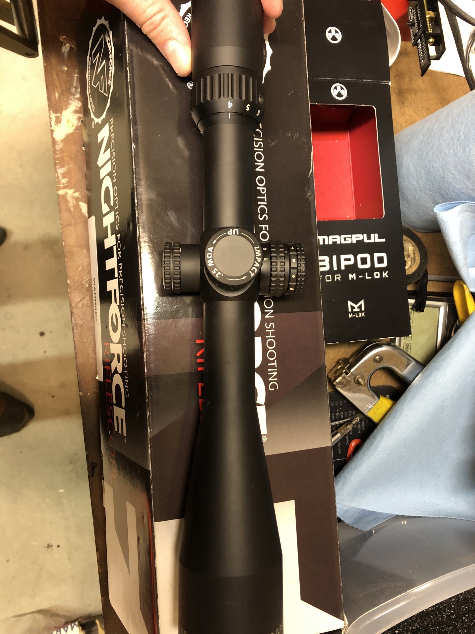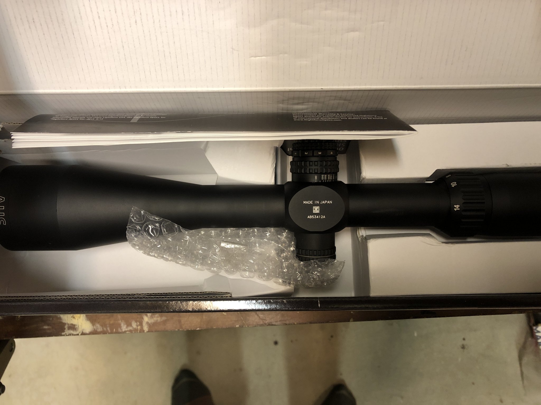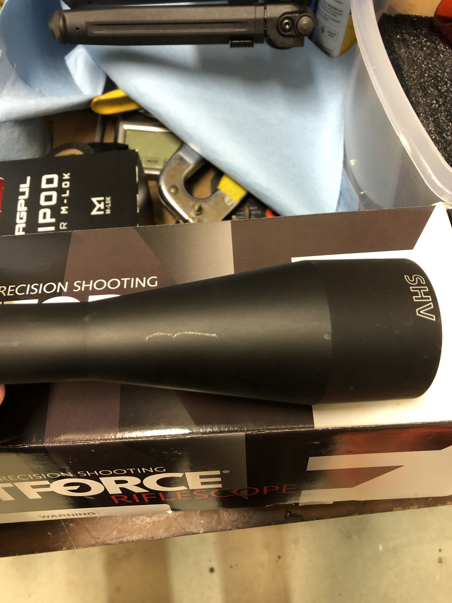 Very good overall condition scope, in box. I just acquired it here but never mounted it. It’s FFP with MOAR reticle. Turrets are nice and positive. Glass is perfect. Scope body has one small noticeable but superficial mark. Couple other little marks here and there. Very slight ring shadows.