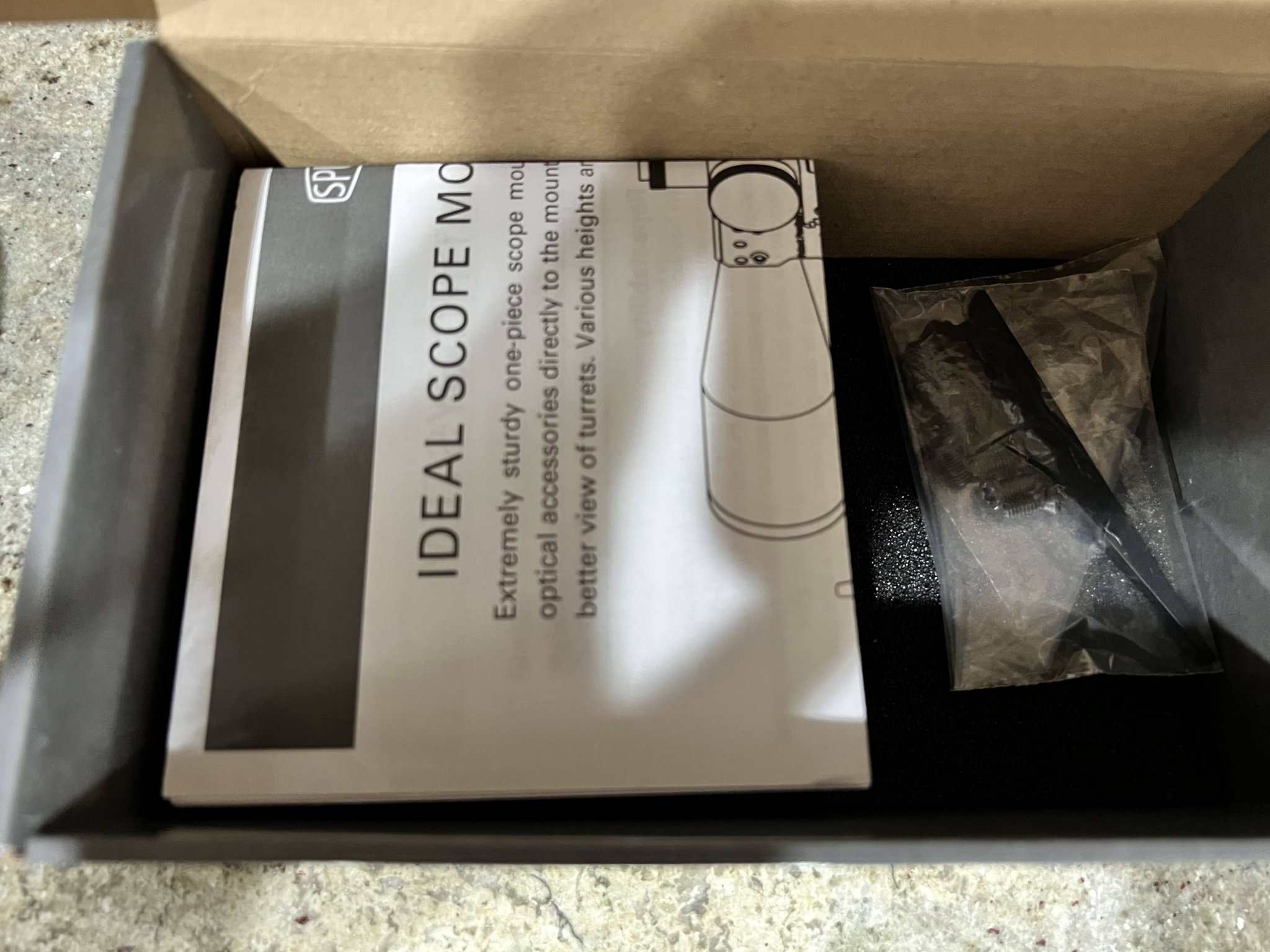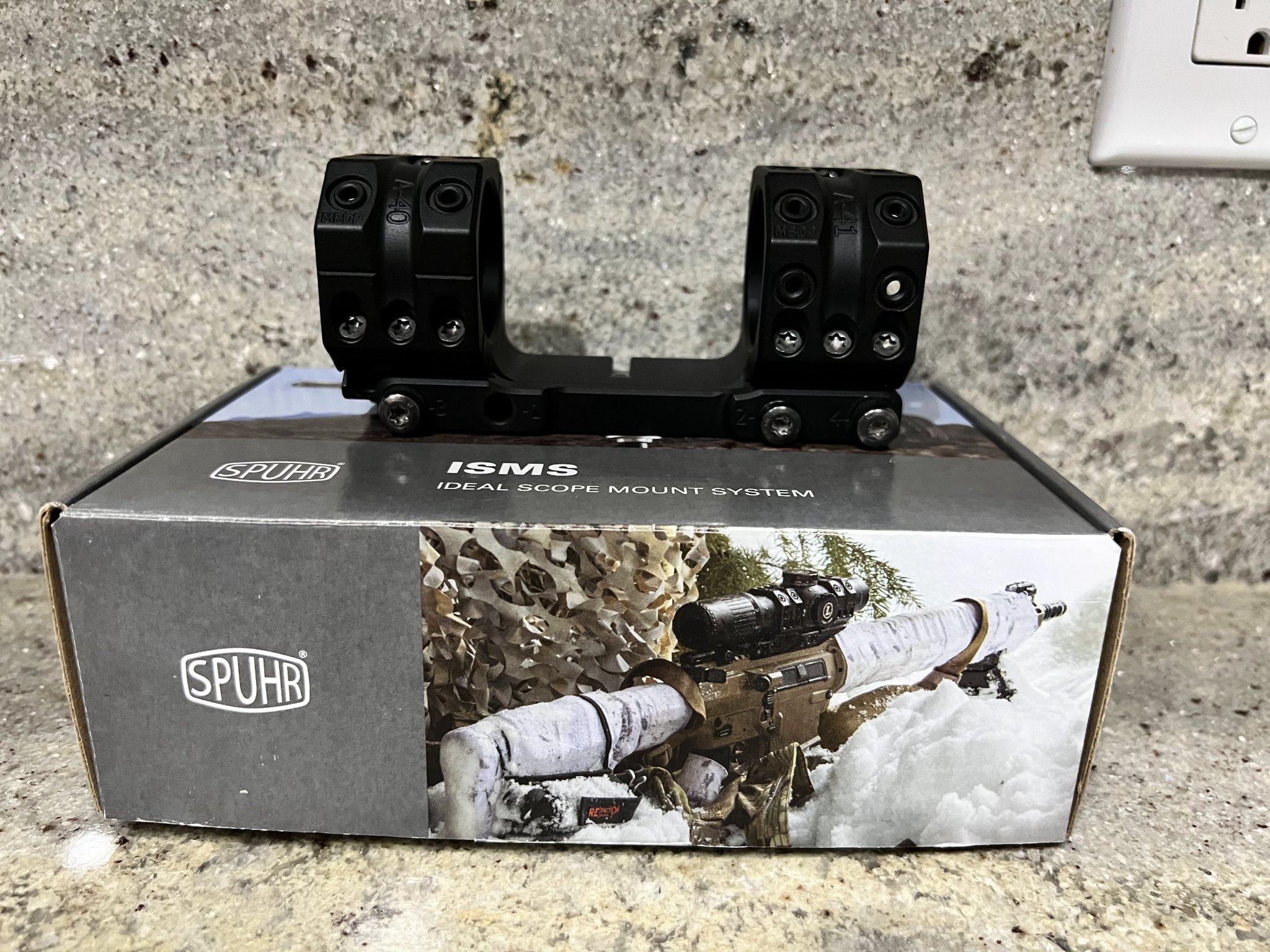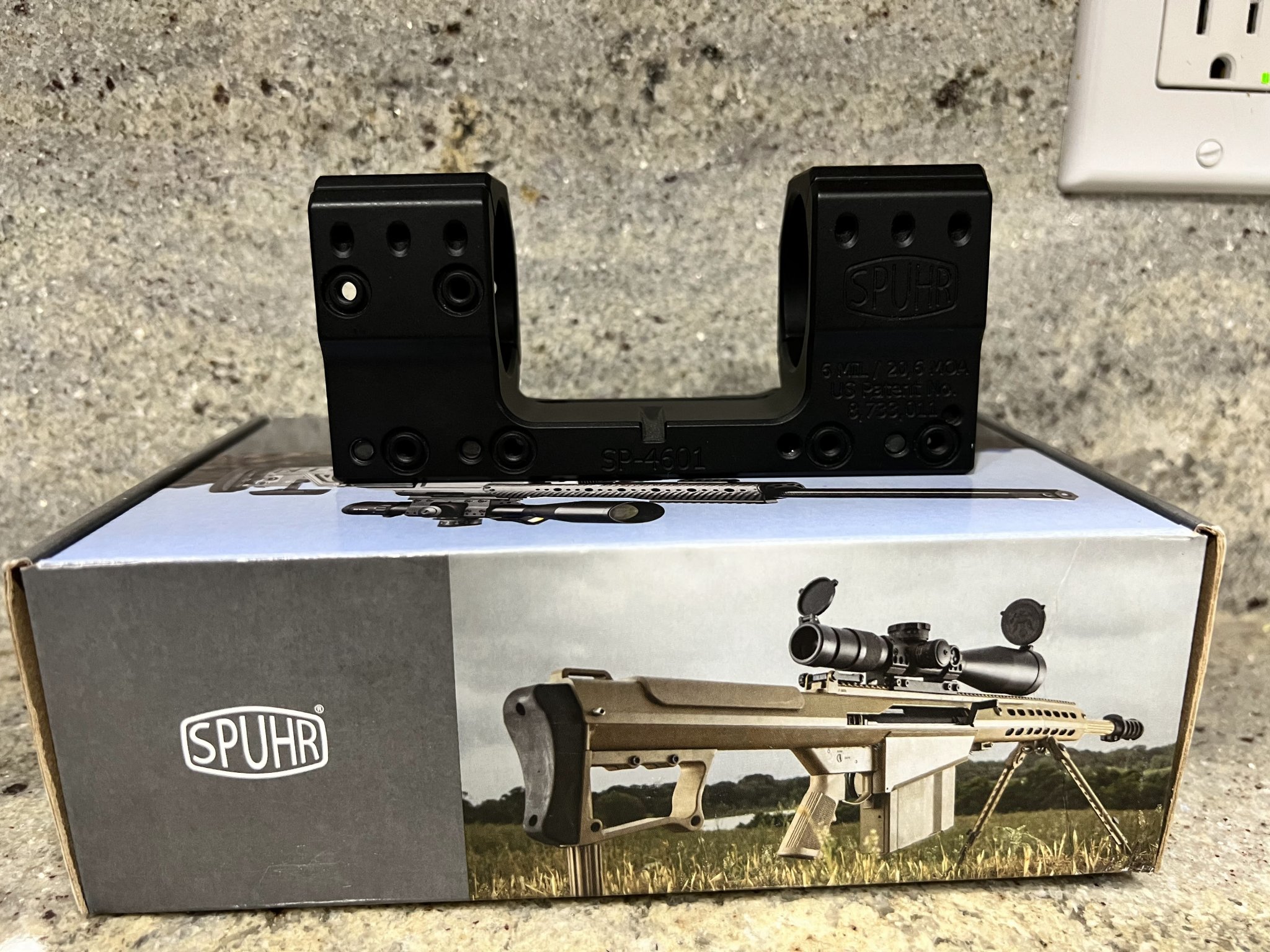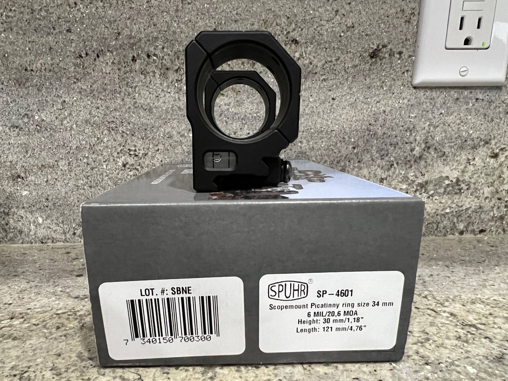 Spuhr SP-4601 (34mm, 6MIL/20.6MOA), which is in great condition, just missing one of the picatinny clamp screws (shown in the pictures), but definitely works as intended, you'd just need to procure an extra screw from Spuhr. Comes with box, wedge, instructions (not that you need them!) and extra scope clamp screws.