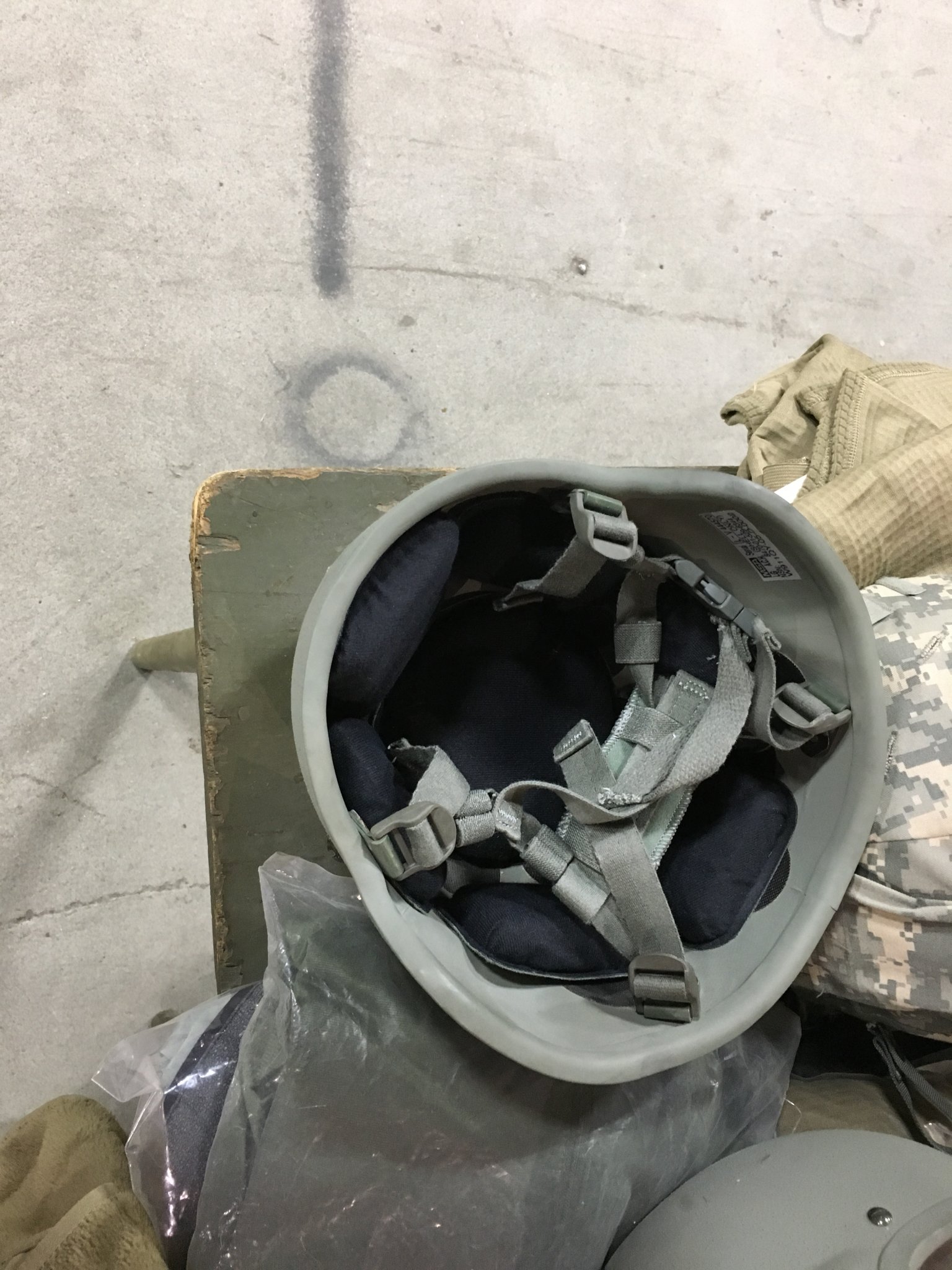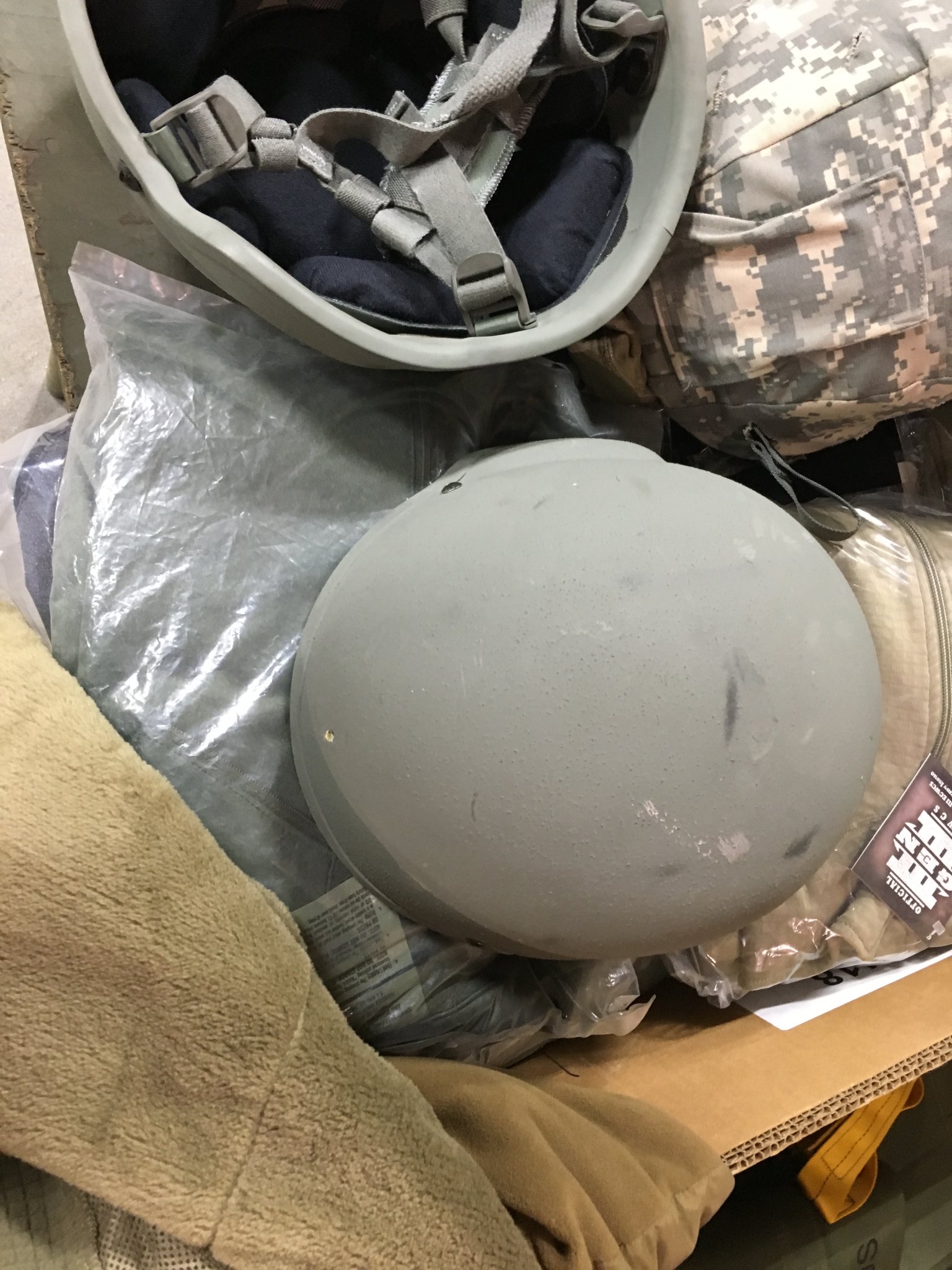 Helmet is used in very good condition. Helmet has cosmetic wear; such as, scratches and dust. Pads and chinstrap are used but look good. No cracks or damages. Helmet looks like it was originally foliage green color but was spray painted tan. Pictures are of actual item.