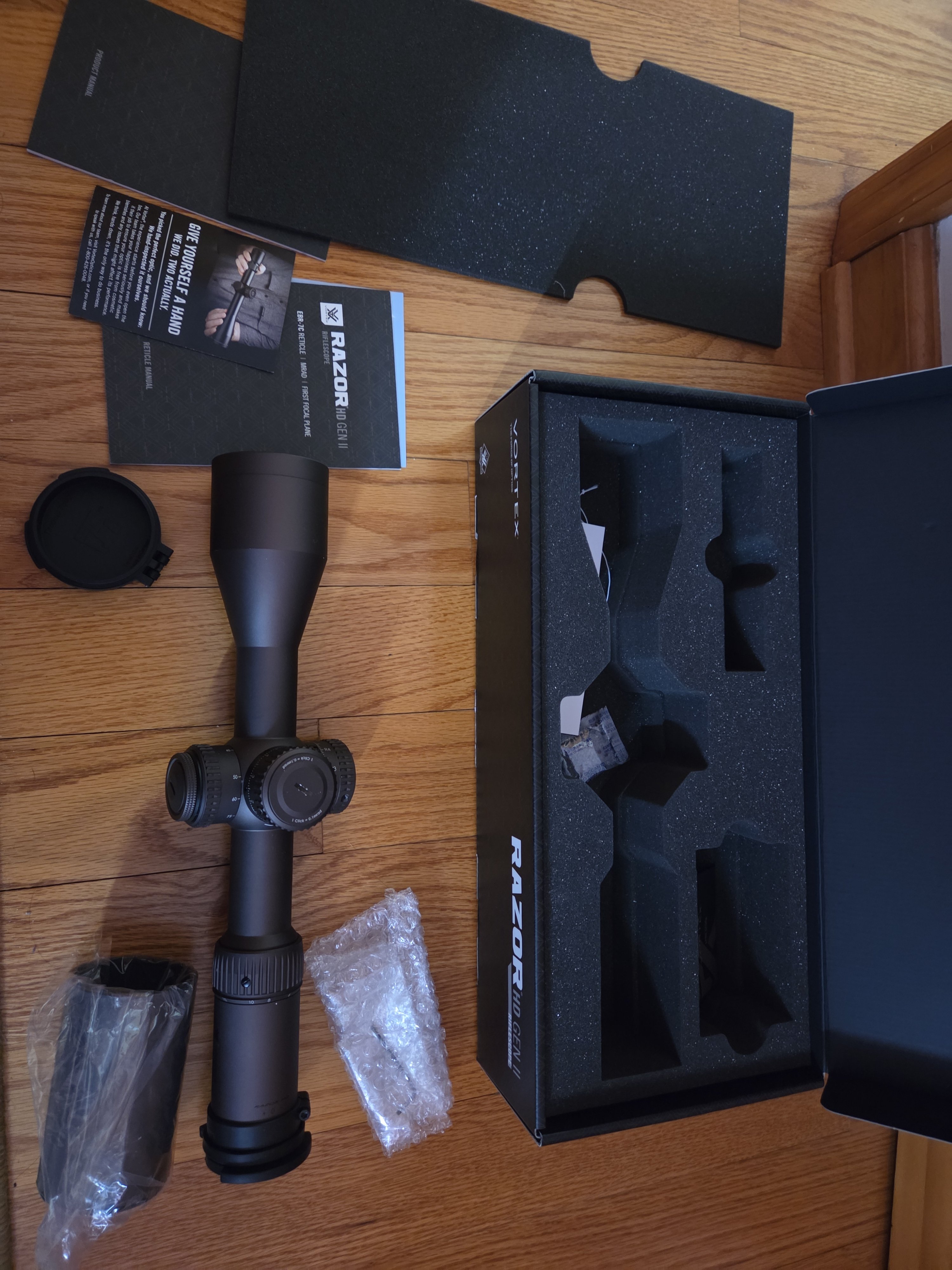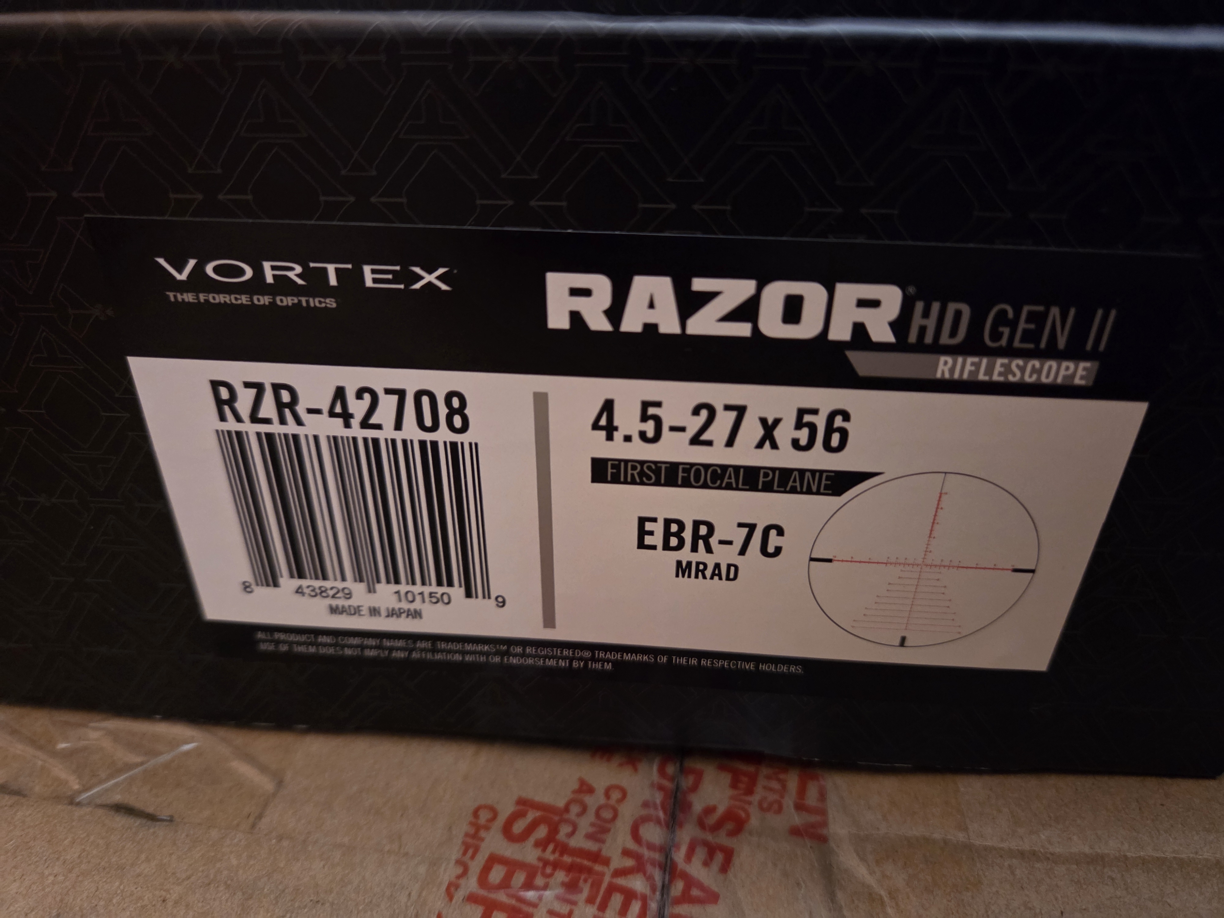 Selling Vortex Razor Gen II 4.5-27. Taken out on several range trips, never for competition. Some wear can be seen on the slots for the turret caps for adjusting zero, scope body has extremely faint ring marks in the right light, and glass is clean.