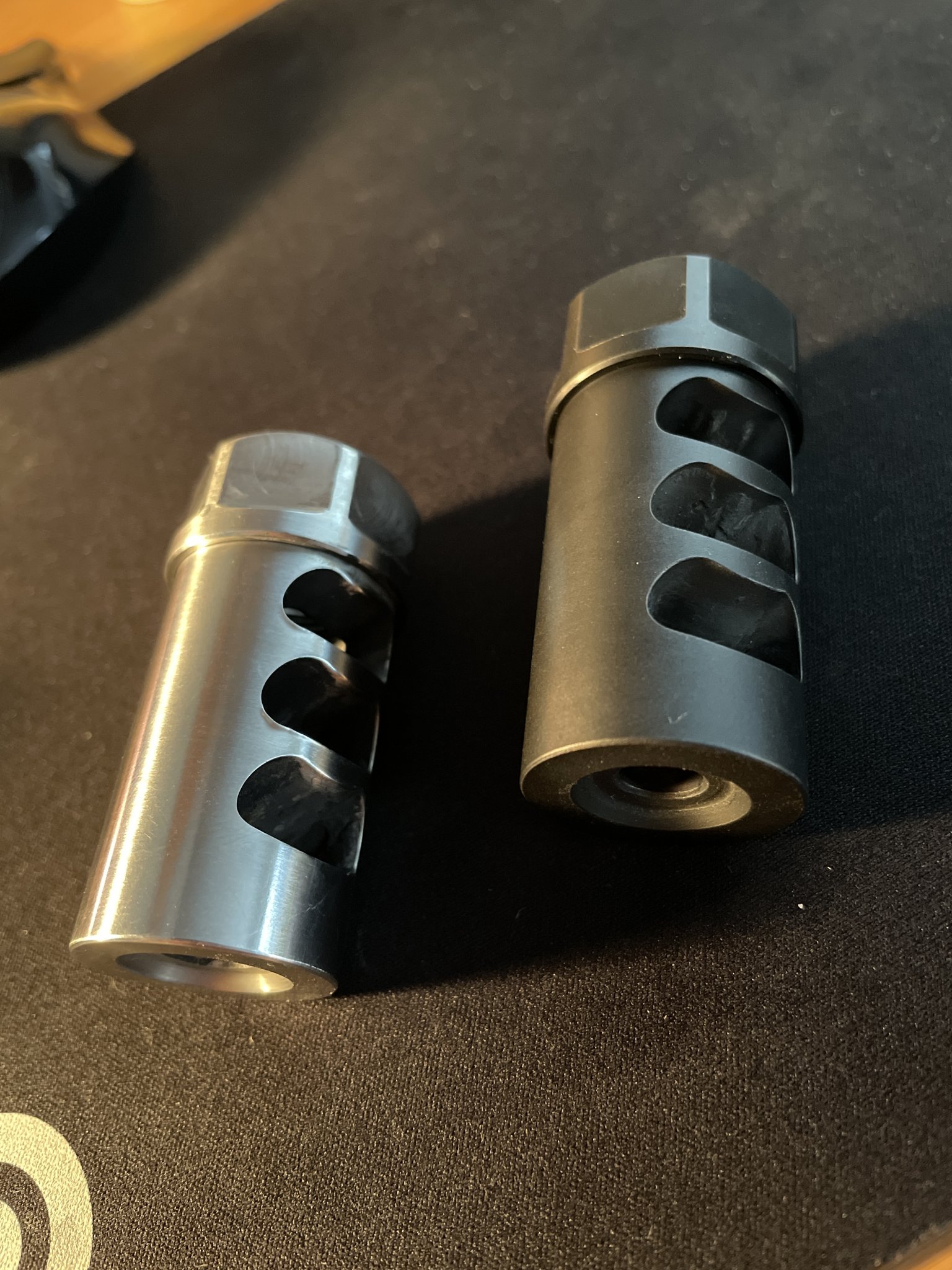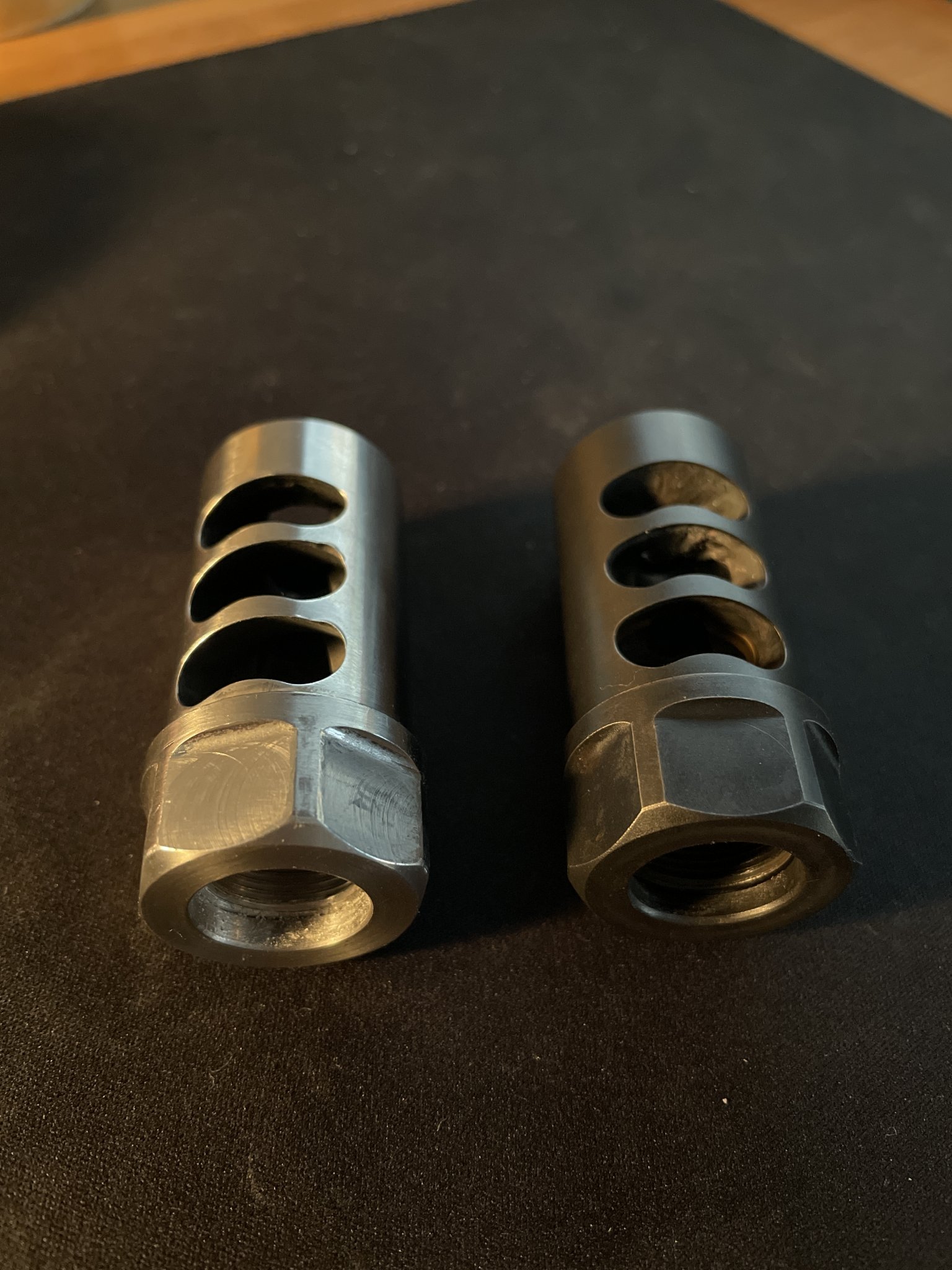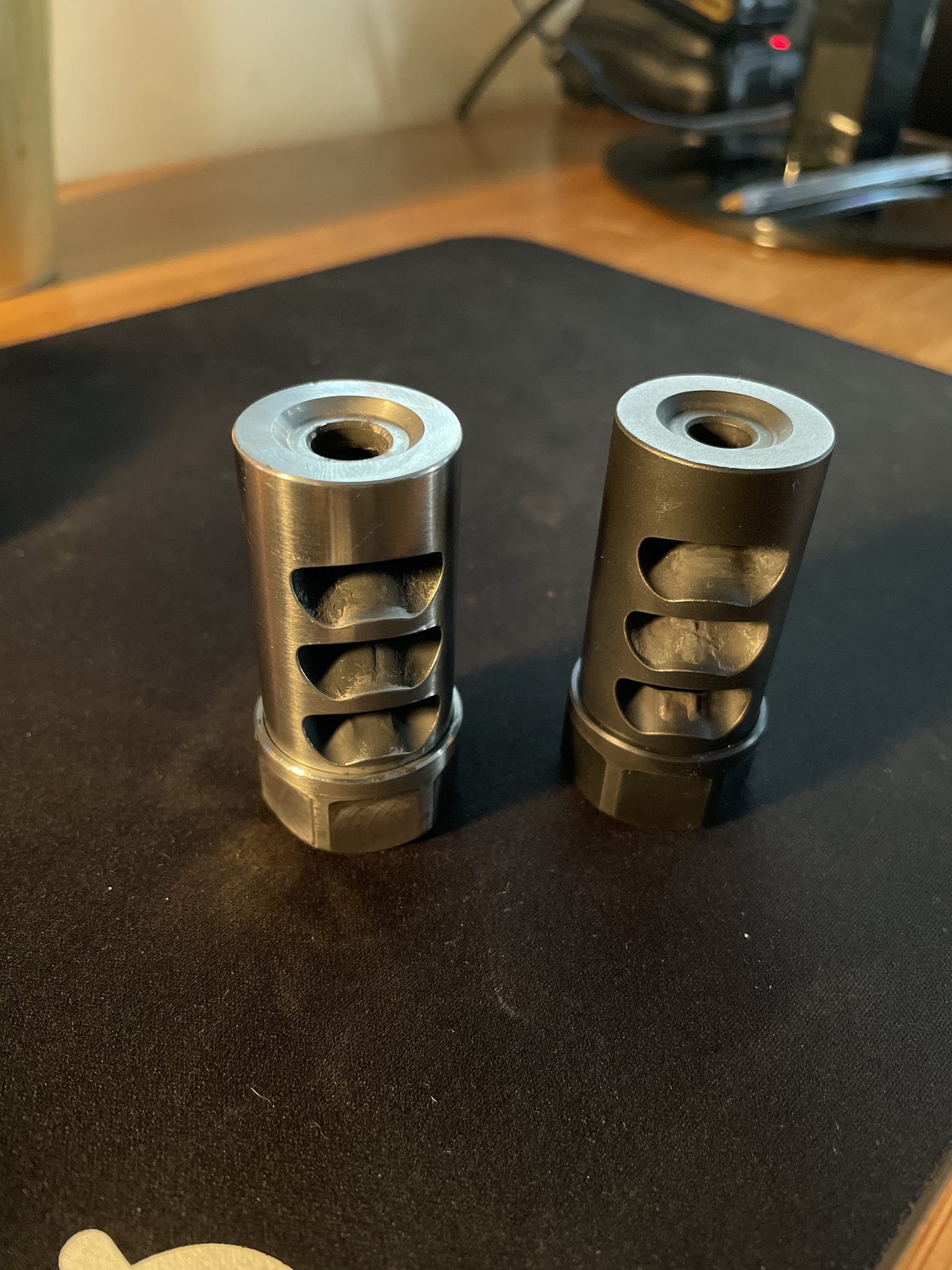 - the stainless has a very small ding on the baffle from threading into barricades. Nitride is in excellent condition