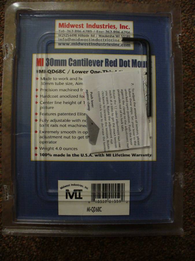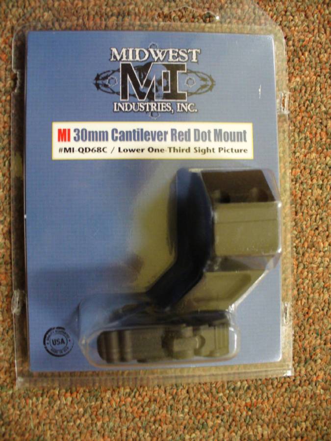 I have for sale one brand new in the package Midwest Industries QD Quick Detach Cantilever lower 1/3 Ring Mount Mod# MI-QD68C, for the Aimpoint Pro red dot optic as well as others. I paid $125.00. I'm asking $70.00 shipped. Payment by Paypal F&F or USPS money order.