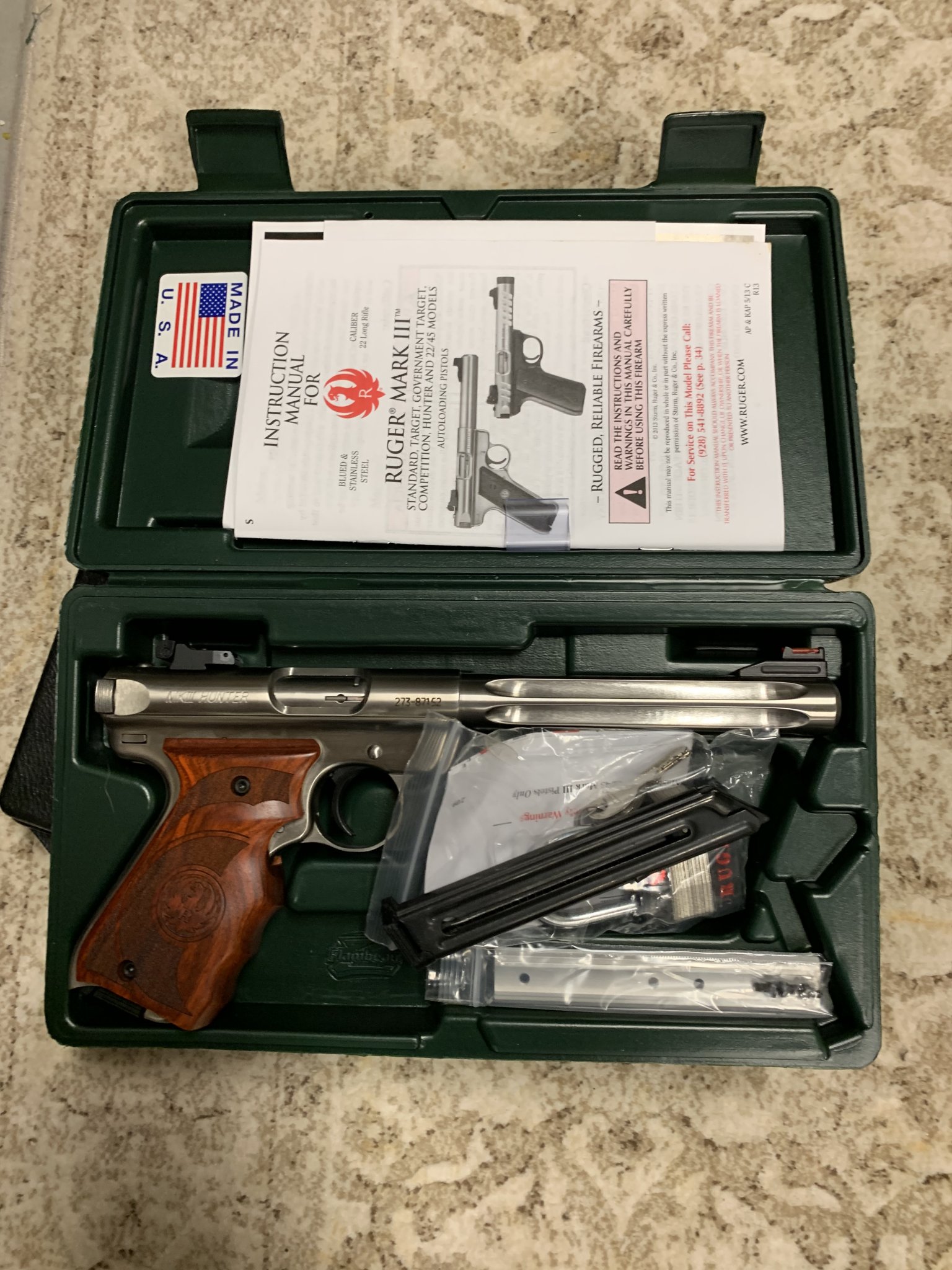 Looking to sell my Ruger Mark III Hunter. I originally bought this to teach my boys to shoot and realized quickly that the grips were way too big for a child. This gun has never been fired and has two mags and everything original in the box. 100% mint condition. 700.00 plus shipping.