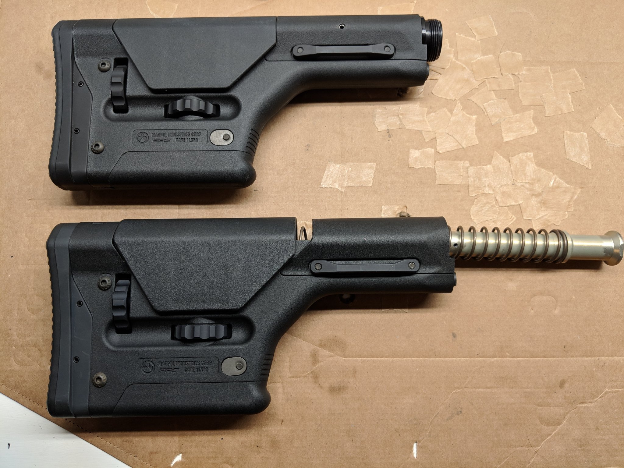 AR-15 version that has had the cheek piece trimmed to work on an AR-10 as well. No extension tube but with buffer and spring.