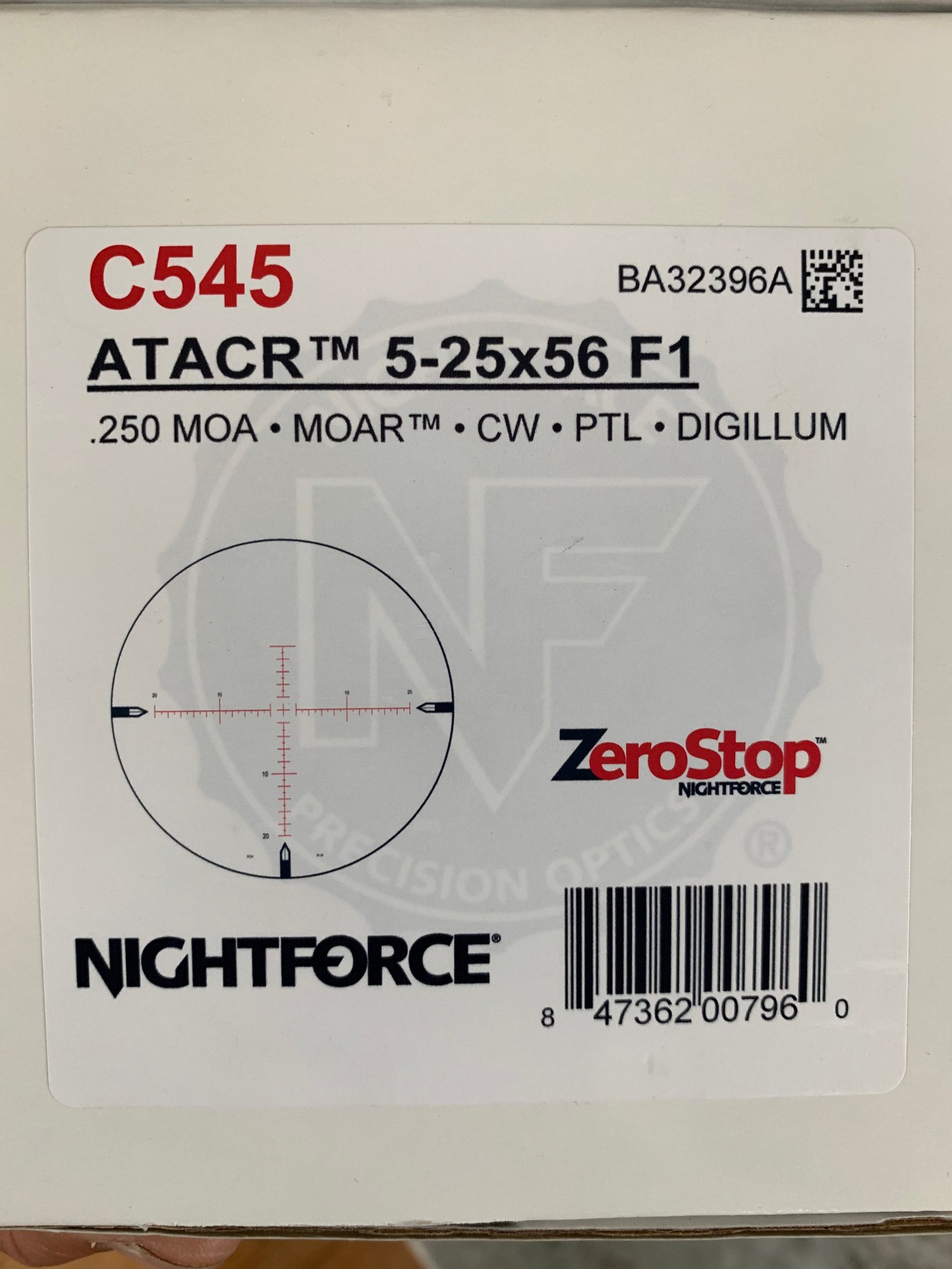 I have a nightforce ATACR 5-25 F1 for sale. Has the MOAR-T 20MOA reticle. Bought brand new a little more than a year ago. Glass is perfect. there are very slight ring marks but It has been mounted in nightforce rings and torqued to spec the entire time. comes with original box and paperwork along with everything a new scope comes with with the exception of the stickers. I also have some NF rings and a NF 20 MOA base for a rem SA. asking 2,300 for just the scope and 2,400 for the scope rings and base.