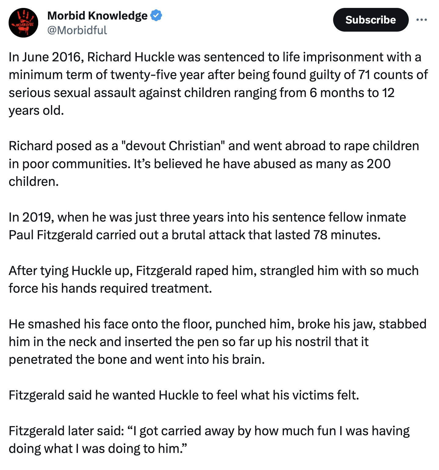 Interesting hero. When he was 12 he sexually assaulted a four year old (according to article cited below). Not at all the type of person I admire. Him taking out another sex offender was because Fitzgerald wanted to torture and eat him. He had so much fun torturing him he didn’t get around to killing the other people on his list in the same prison block of sex offenders. Fitzgerald did call it a “poetic justice”, but I don’t think that should get him a reduced sentence.