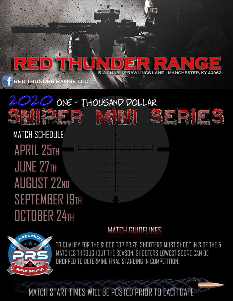 Red Thunder Range located in Manchester, Kentucky has their 2020 match schedule up with this year again being a run at the $1000 Sniper Mini Series. The series is comprised of five matches throughout the year. Shooters must compete in 3 of the 5 to be eligible for the end of season prize money. The lowest score of the three shoots will be dropped to determine your position in the final standings. Red Thunder is a 578 yard range with a challenging course of fire. Many shooters have rolled in thinking it's just 578 yards and they have found out quickly that even though the distance is considered short, it's a much harder range than they anticipated.