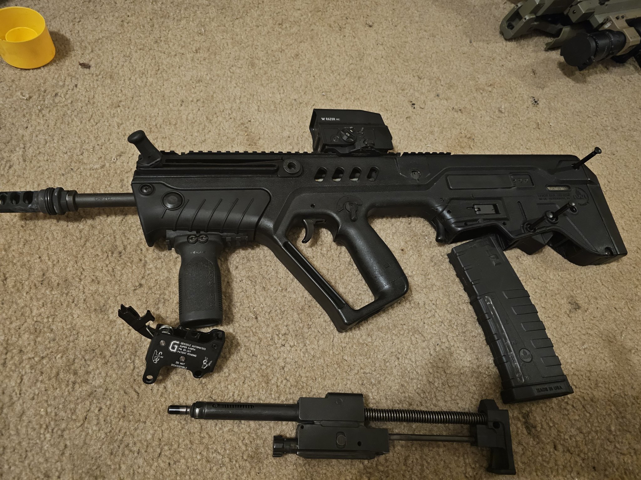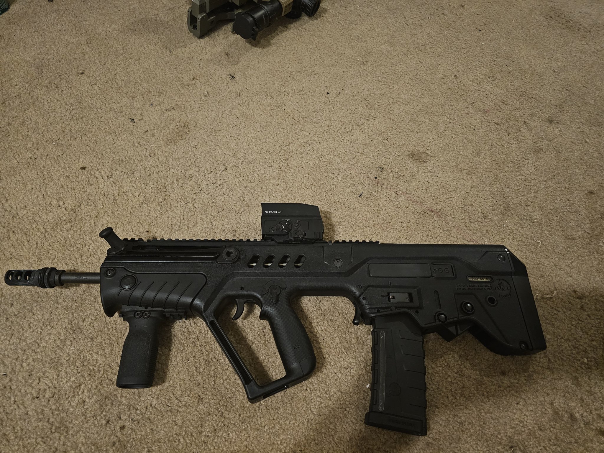 IWI Tavor 556 with pictured magpul grip and IWI magazine and most importantly Geiselle Supre Sabra trigger pack INCLUDED and installed. I took it out to clean and oil it and take a few pictures to prove what you're getting, they really do make fine triggers and it turned this gun around imho. original trigger is lost forever, very sorry. once you feel the super sabra you won't care.