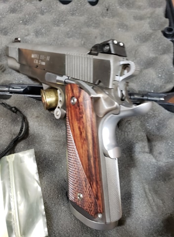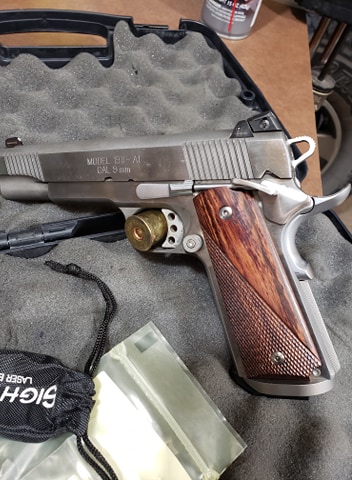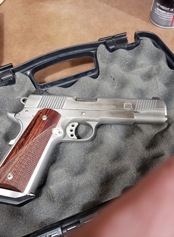 I really think this is one of the first 1911's in 9mm Springfield made, and not sure of the model. I cannot find the box to verify. Mods have been made, Ken sights tritium night sights, magwell, oversize mag release, oversize safety, full length guide rod. Low rd count, but not in pristine shape, great range gun, comes with 4 mags with base pads, Kim Ahrands Dessertwood grips, I think, lol.