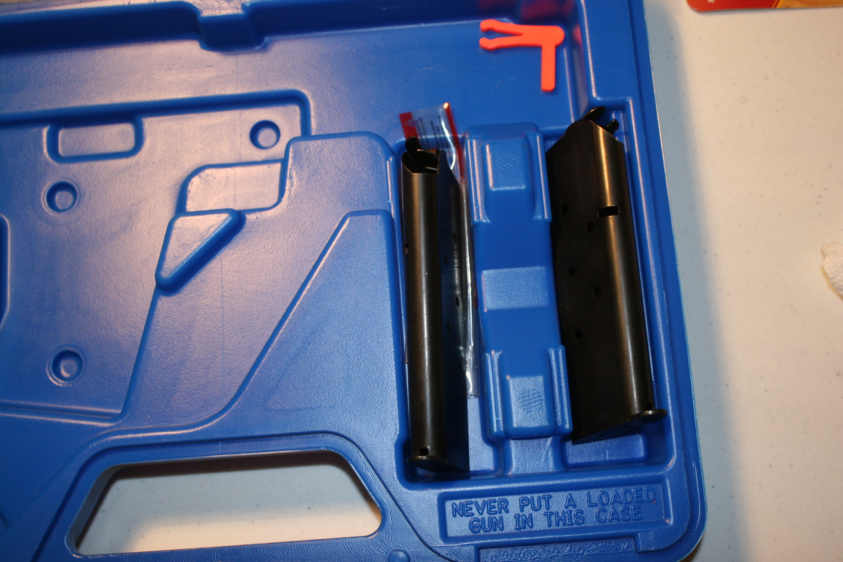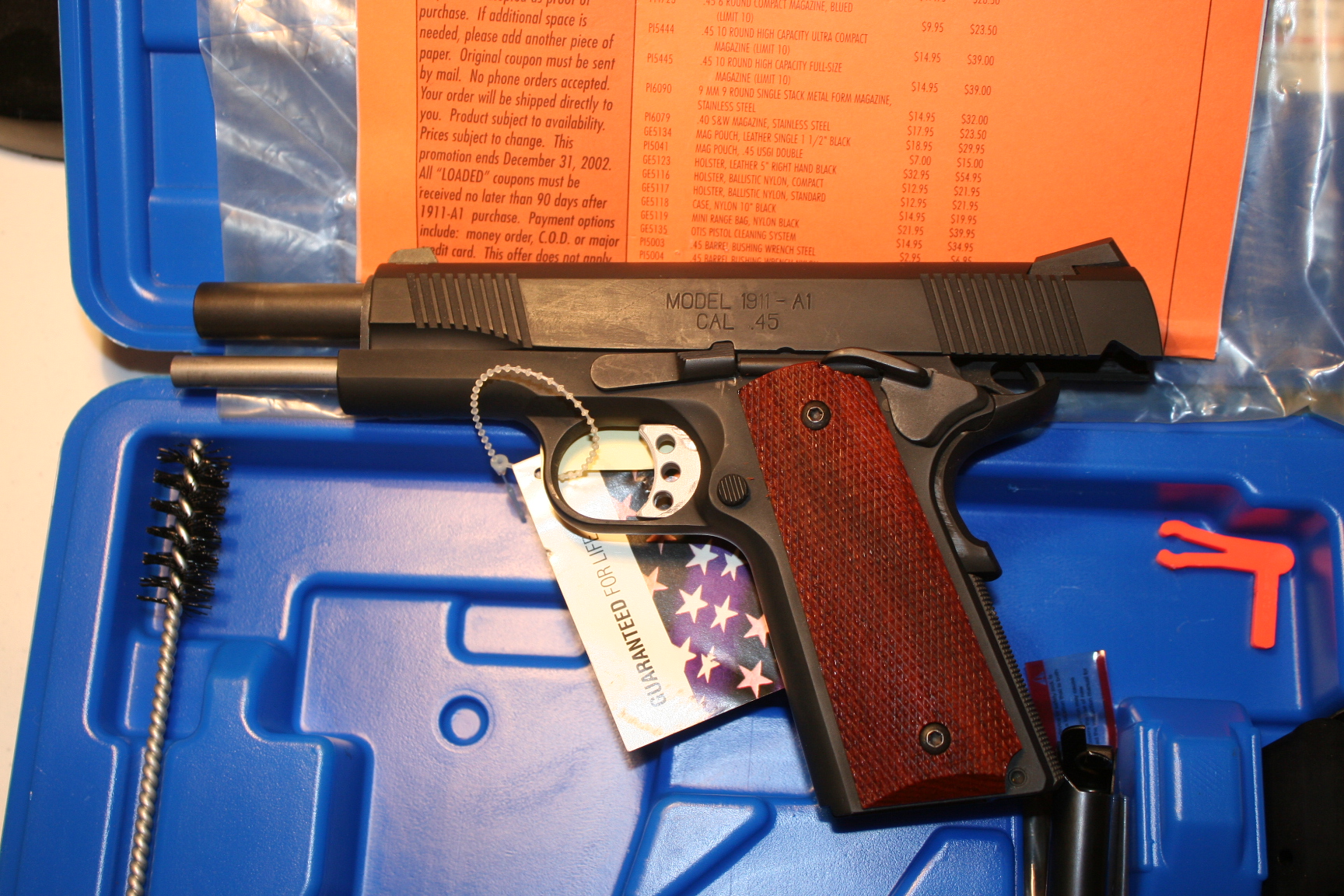 New in box, Springfield Light Weight 1911, ramped barrel, 2 mags, and paperwork. Novak like sights. Look to be tritium but are dead now.