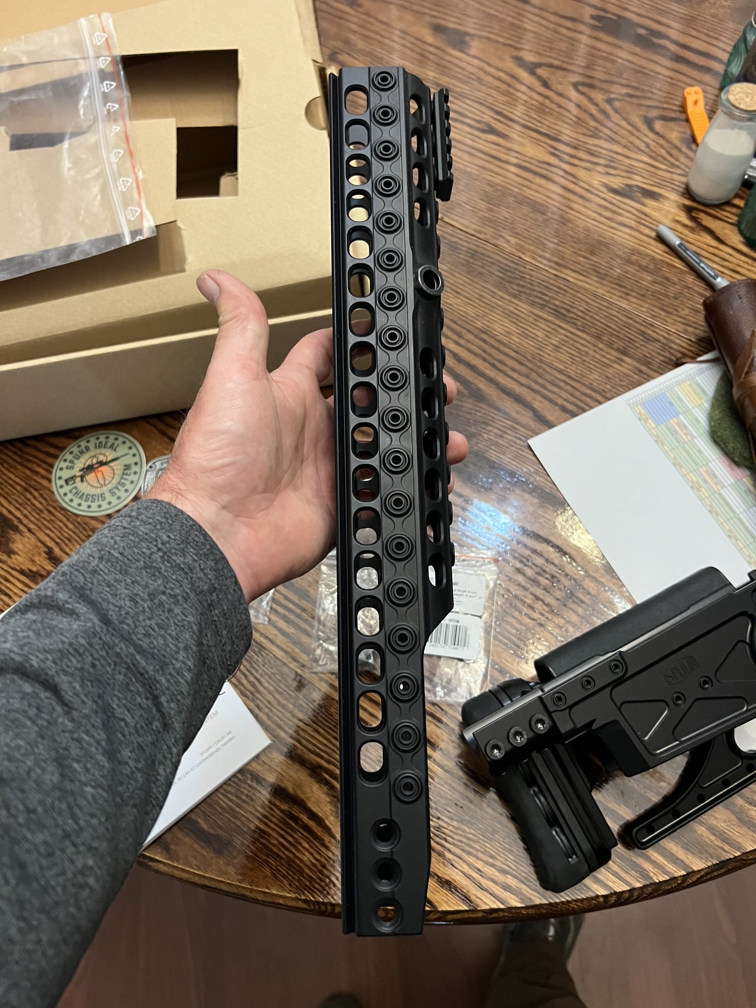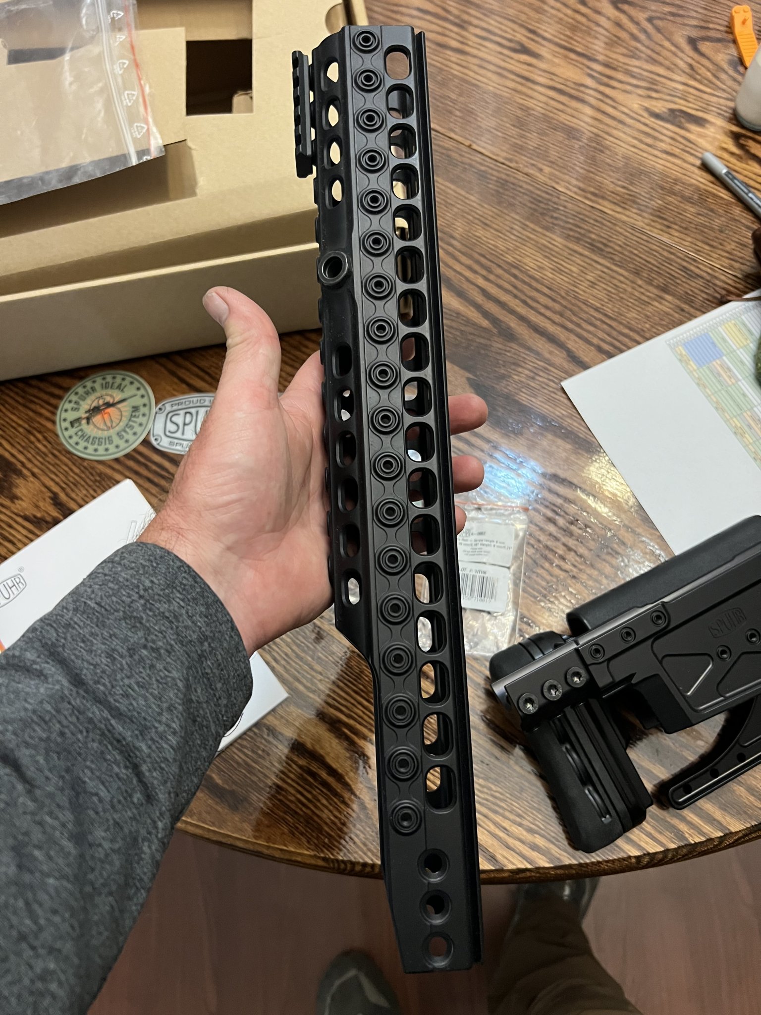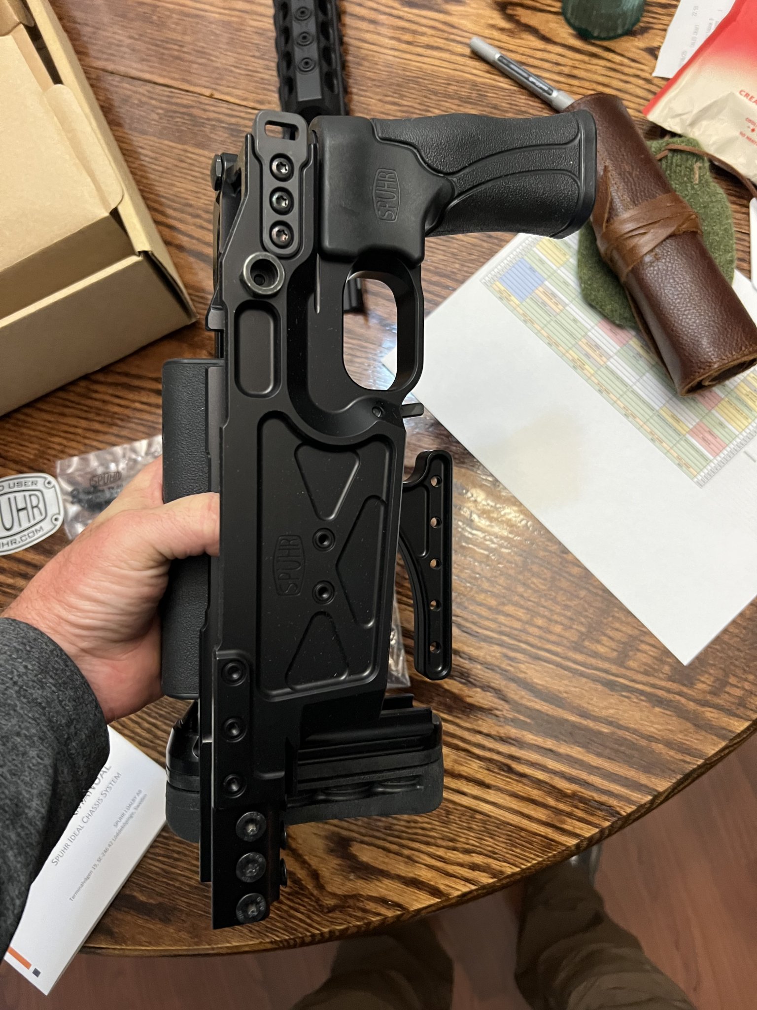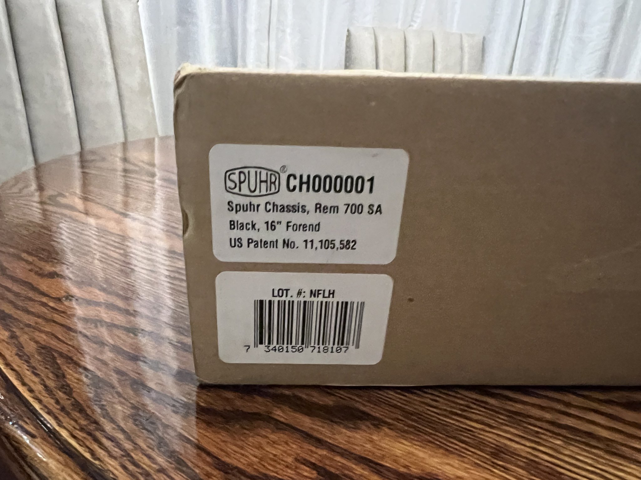 New in Box Spuhr SICS Chassis. Model CH000001, REM 700 SA, Black, 16” Forend
