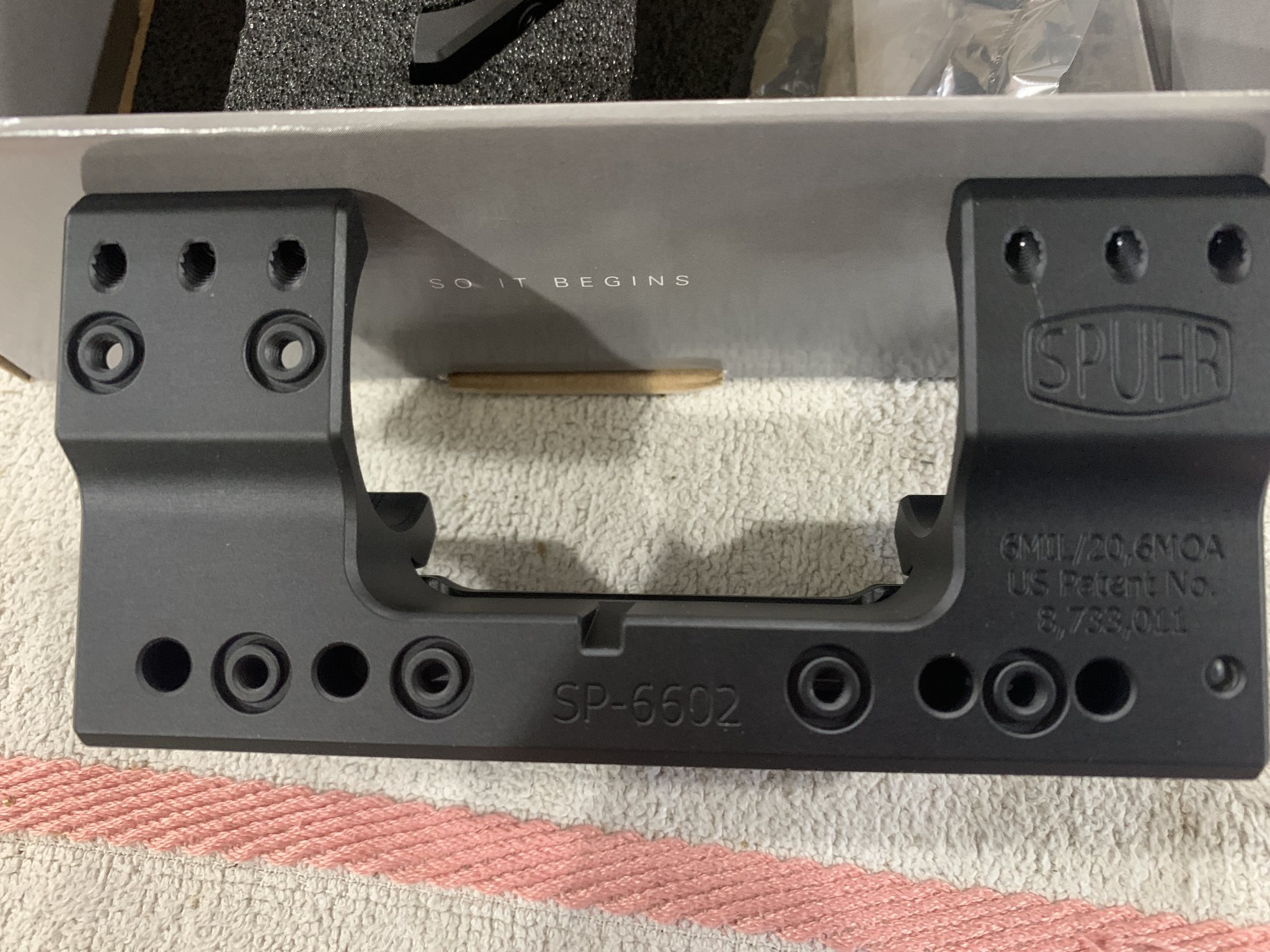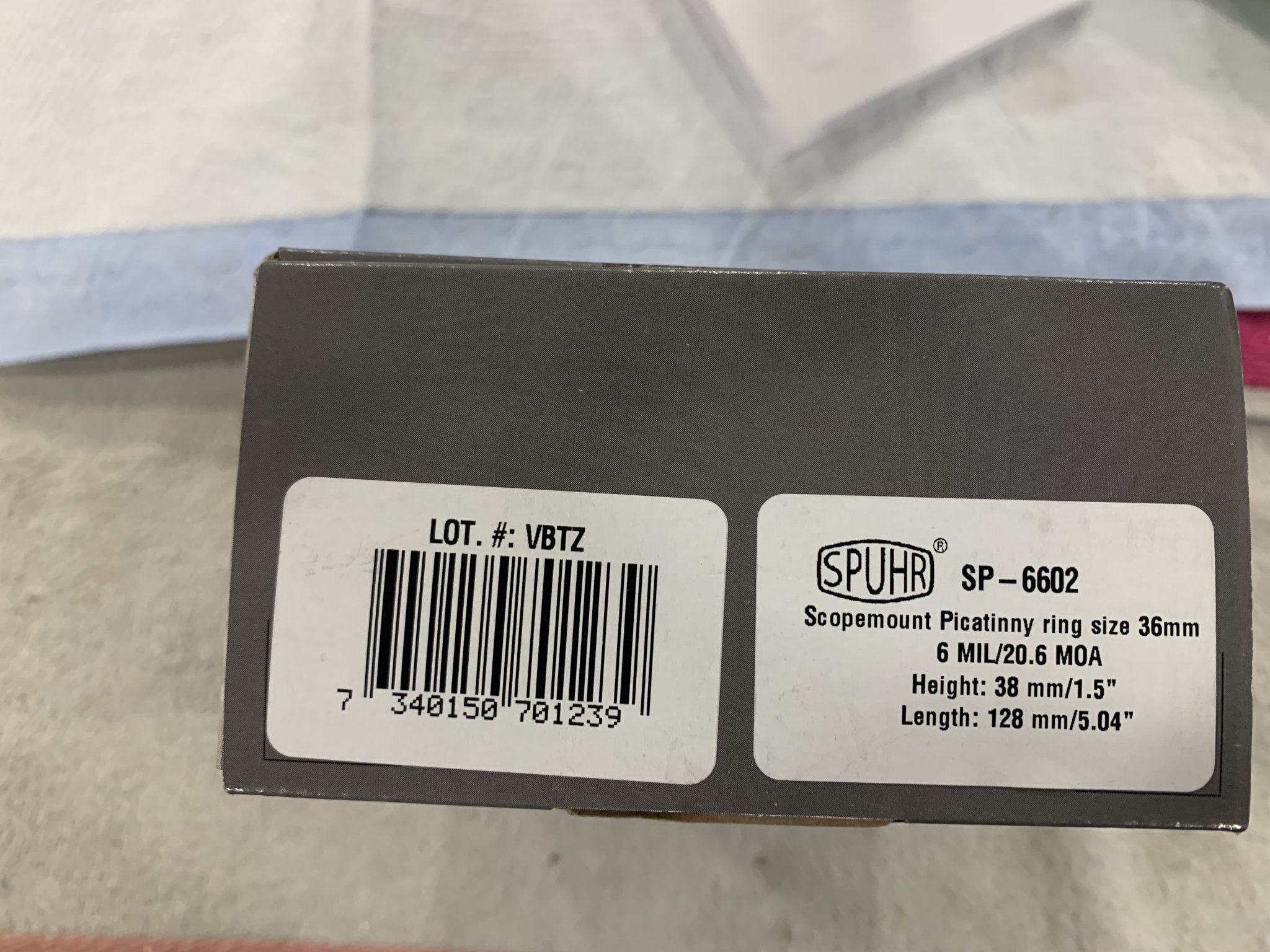 Spuhr SP-6602: A 36mm Picatinny mount (20 MOA) 1.5in height. Durable, grooved rings, and 7 mounting placements for accessories.