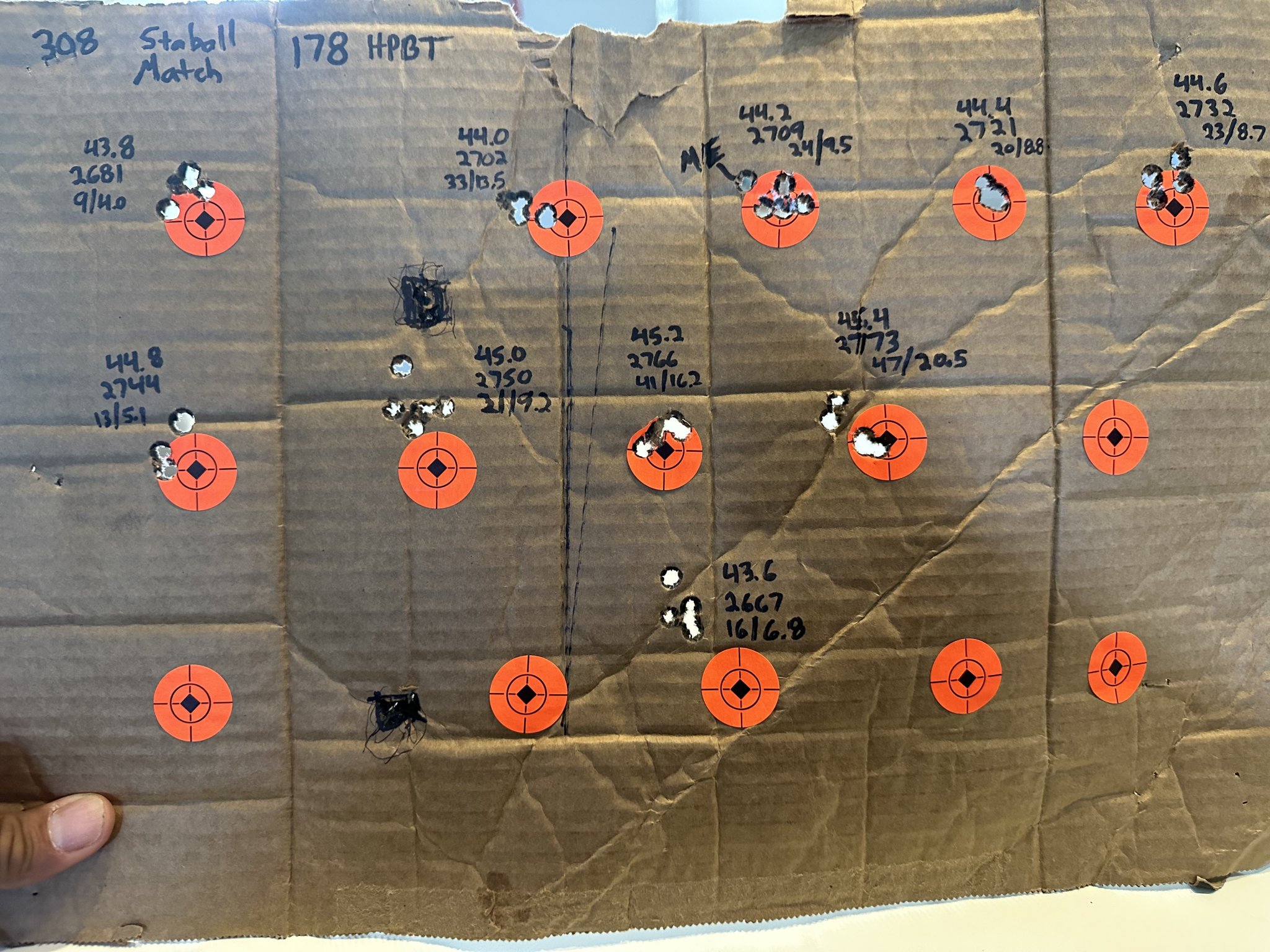 Tested Staball match in 308 with 178 ELD-M. Tested 44.2 up to Hodgdon max 46gr. After 44.2gr it really tightened up. Very happy with the accuracy. First ever test with this powder so only did 4-shot groups. Next time I will bring the chrono and verify 46.0 range and report back with velocities.