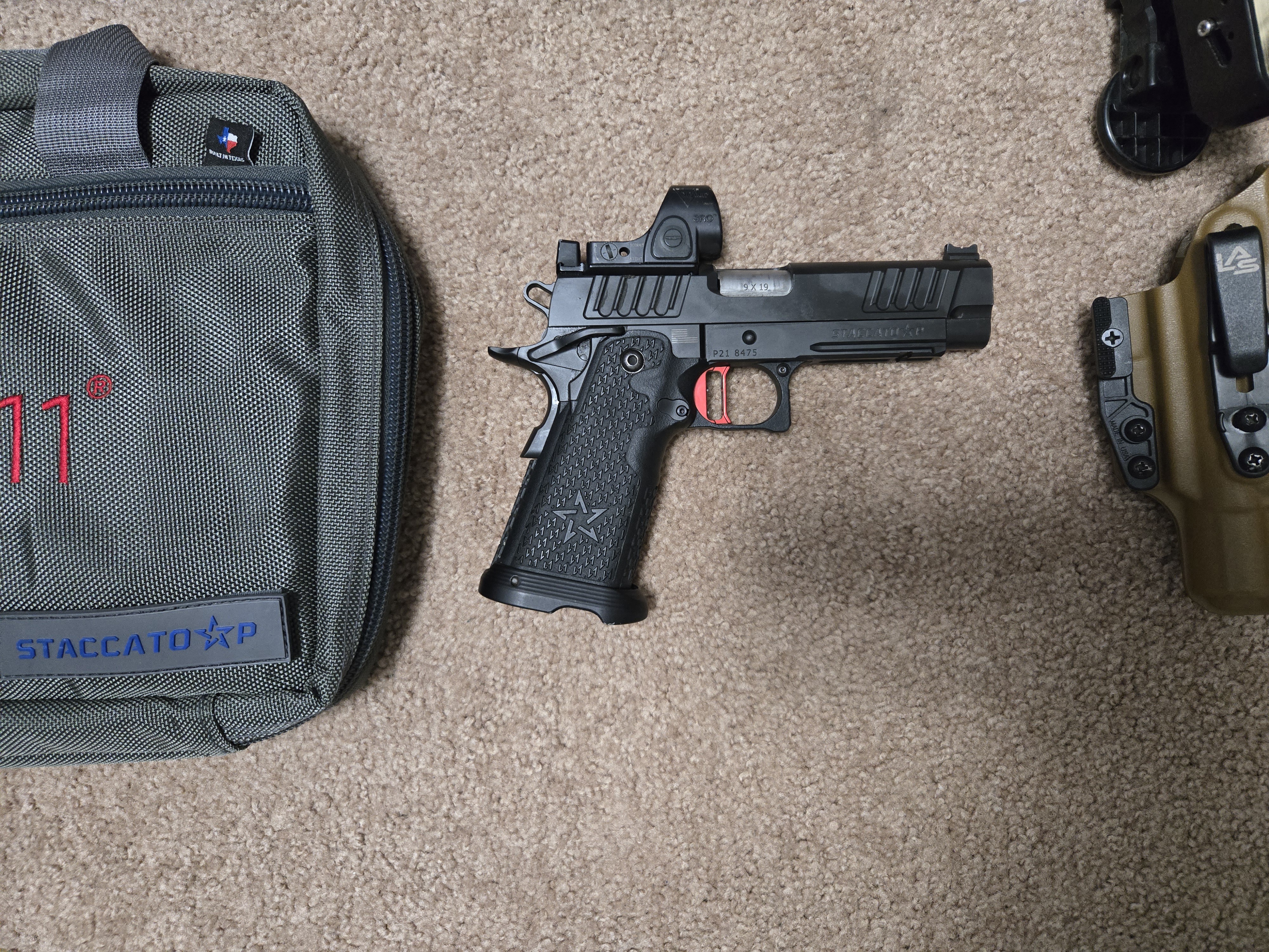 Staccato P, Trijicon SRO, Double Alpha outter and inner belt,USPSA race holster, 4 magnetic magazine holders, 3 staccato magazines, 1 MBX magazine, OWB and IWB holster, adjustable Atlas flat trigger