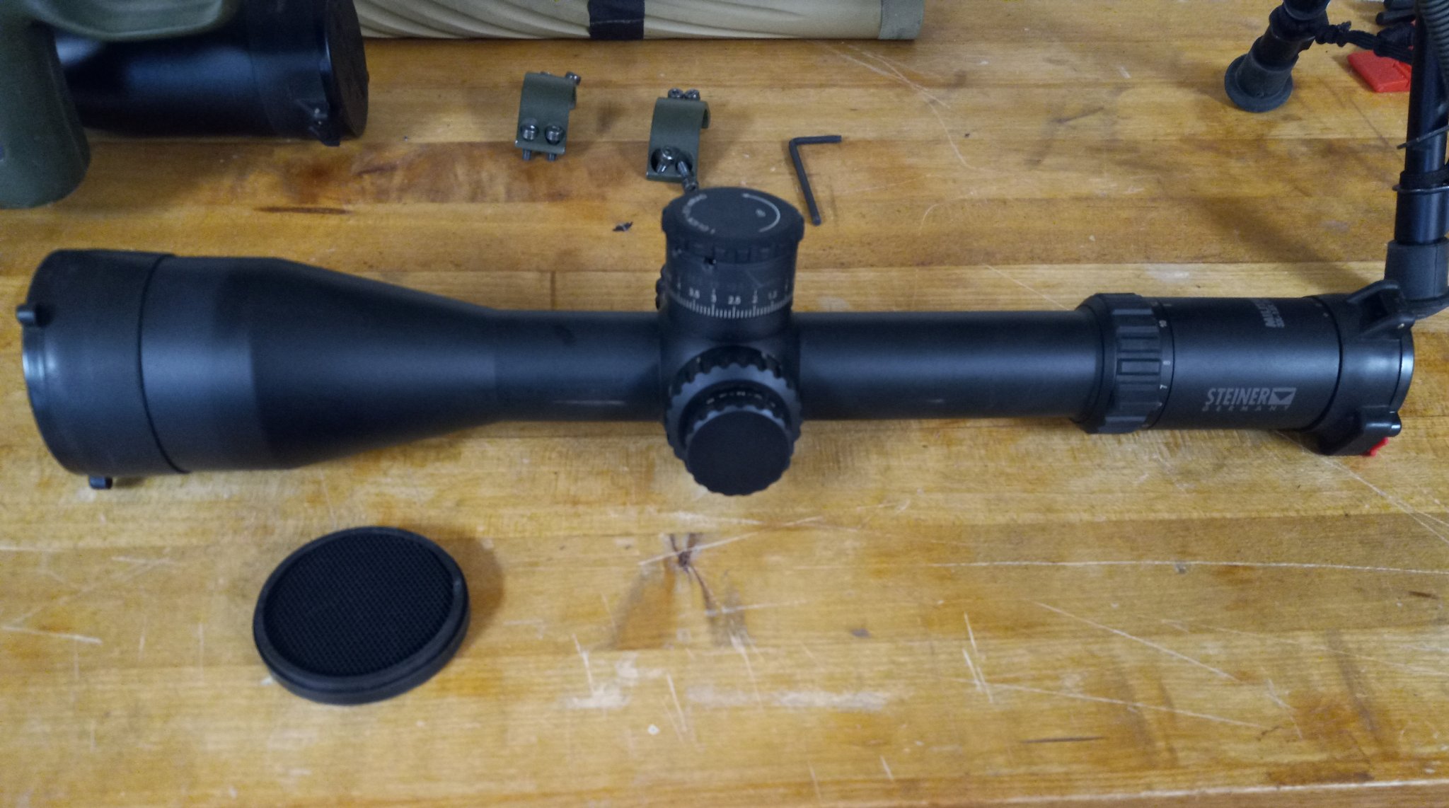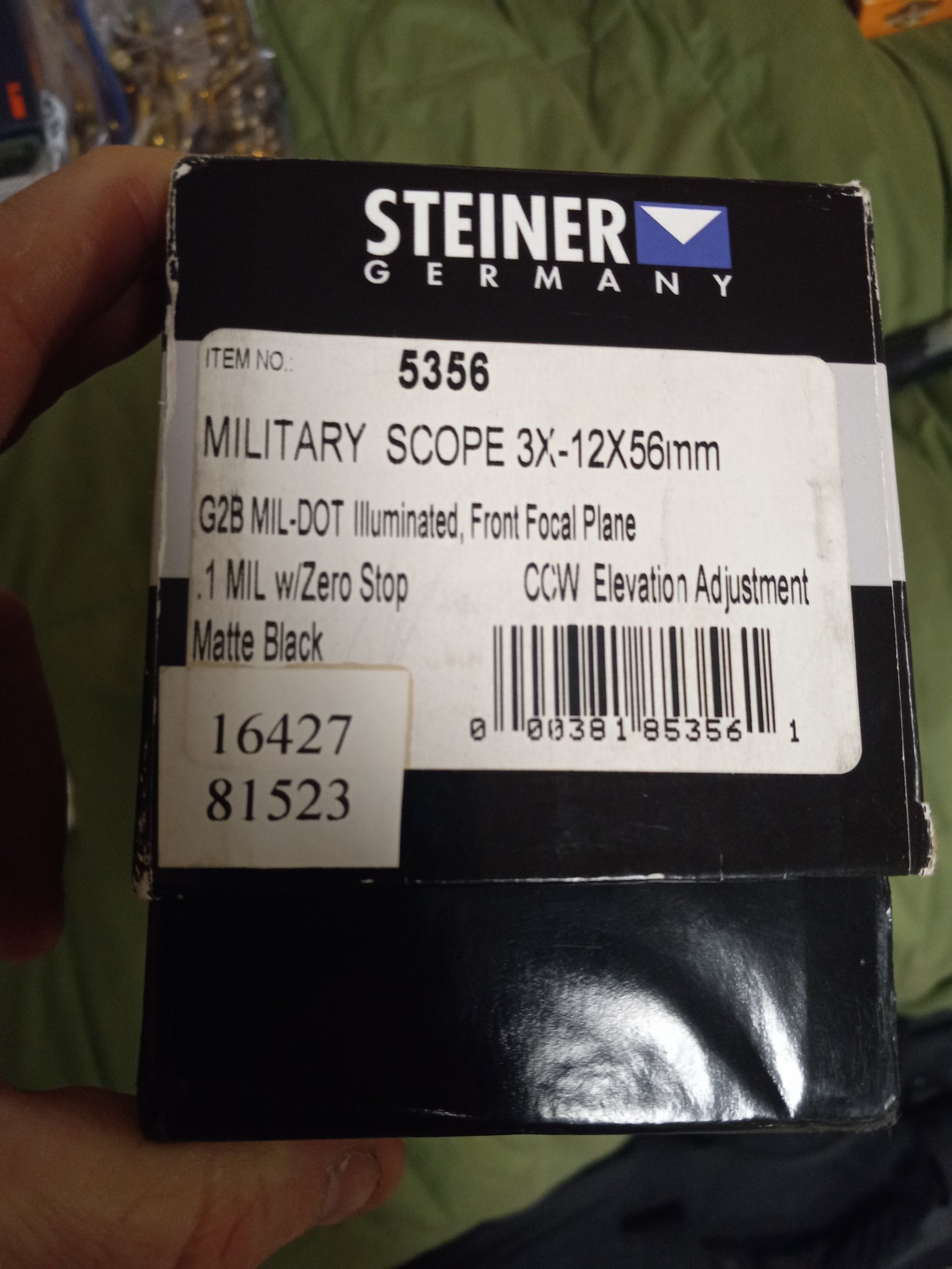 Steiner Military 3-12x56, illuminated G2B reticle (basically gen ii mildot), CCW. Glass is perfect. Parallax serviced by Steiner in 2022. Comes with BC caps and ARD insert. Rings marks from AI mount. Have the original box.