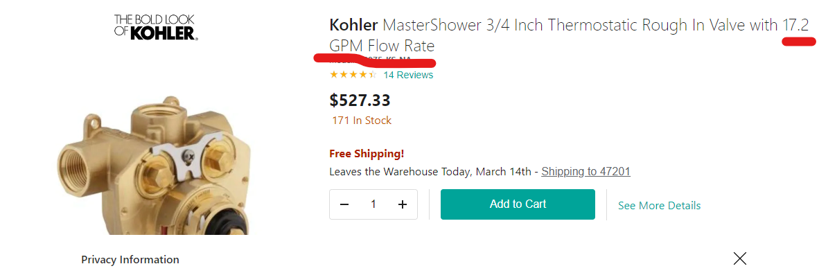 I have 2 showerheads upstairs and 2 downstairs. The larger guest room showerhead pressure is abysmal (sorry @clcustom1911 ) All the same brand but different configurations. I never liked the shower pressure in the master bathroom; it wasn't terrible, it also wasn't fantastic. I had a plumber check our water pressure when he was here and he confirmed I should be getting more water. I took the heads apart and took the regulators out. It improved but I was still under the impression from the amount of water it would shoot out with no showerhead on, that it should be more.