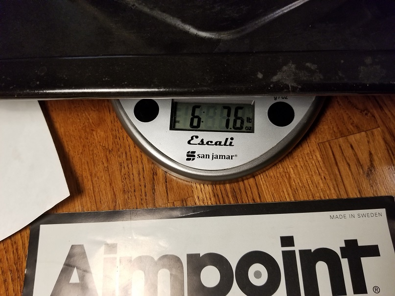 With the bipod closest in, there is 8 lbs 2 oz of weight. Minus bipod is 7 lbs 6 oz.