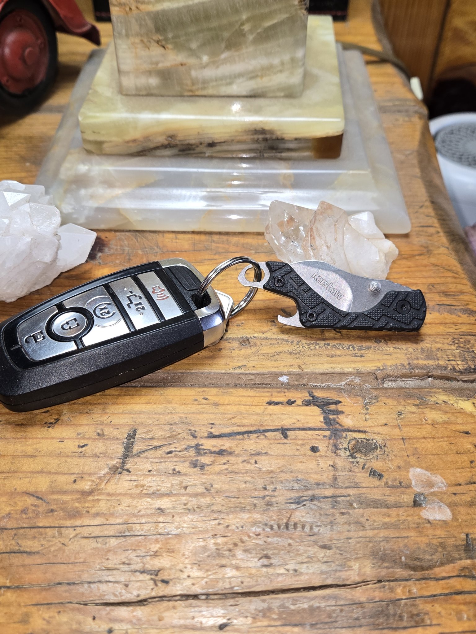 I got tired of grabbing my wife's keyfob by accident, instead of mine because they are similar, so I bought these cheap little keychain knives for both my fobs. No mistaking them now.