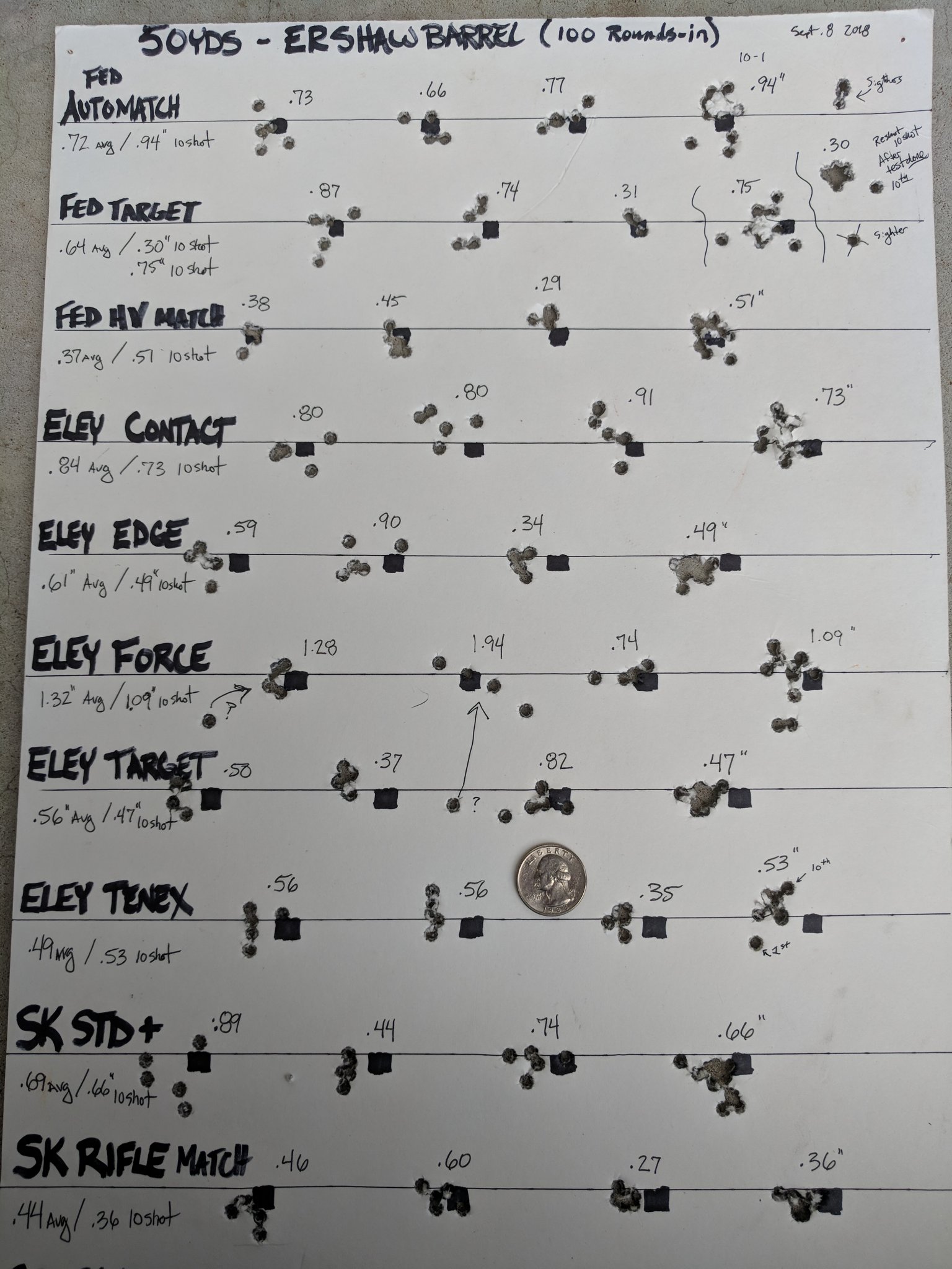 First three groups of each ammo are 5 shot groups and last is a 10 shot group. Shot at 50yds prone with rear bag and bipod. Super calm conditions until about halfway (Eley Target and lower groups) and wind began drifting left to right slightly. Quarter in middle for reference.