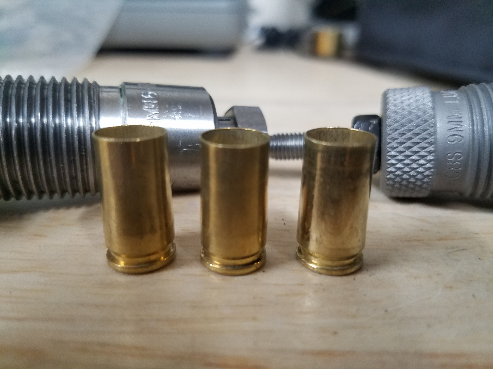 So I have been loading 9mm for years using a loadmaster and lee dies and have made thousands of rounds that always came out great and looked great. This past year I have been using a dillon progressive and decided to buy the dillon 9mm dies for the heck of it. I was confused after my first few resizes after seeing a crazy hour glass shape on the case and an even worse bulge when seating the bullet. I know the bulge isn't really that uncommon with 9mm, especially being a tapered case, but the dillon dies made this shape very exaggerated.