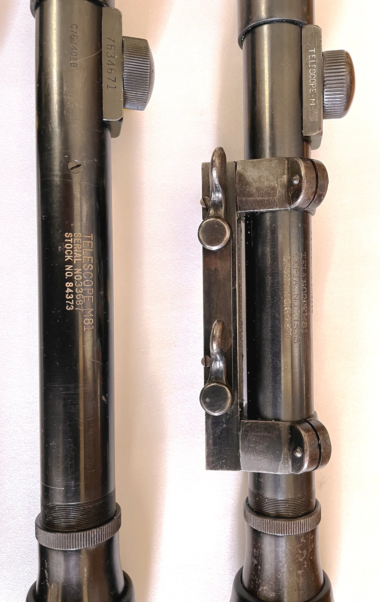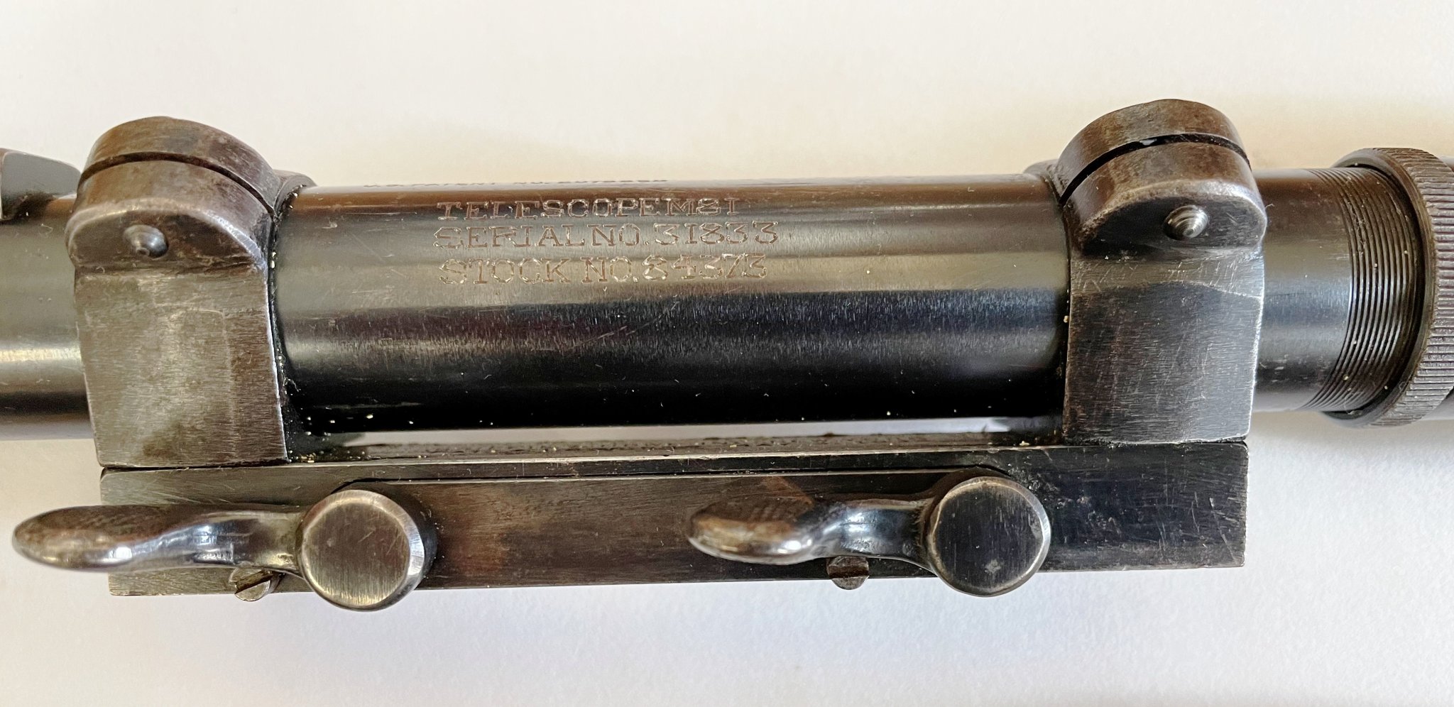 So I give you one of a 149 Commercial Lyman Alaskan Scopes that Lyman had already marked Telescope M73, and had to go back and remark them the M81. You can see how they marked out the 73 in the Telescope M73 and remarked them the M81. Also since they were commercial scopes they retain all the original Lyman Alaskan markings and even the commercial serial number, which on this one is the 51xx serial range. Today there are only about 10 of these M73/M81 marked scopes known to exist. This one also retains it's original Griffin and Howe mount with a M1C serial from the first block. We know by the records and existing examples, this is the original G&H mount for this scope. There are only a couple M73/M81 marked scopes that retain their original M1C mount, that are known to still exist.