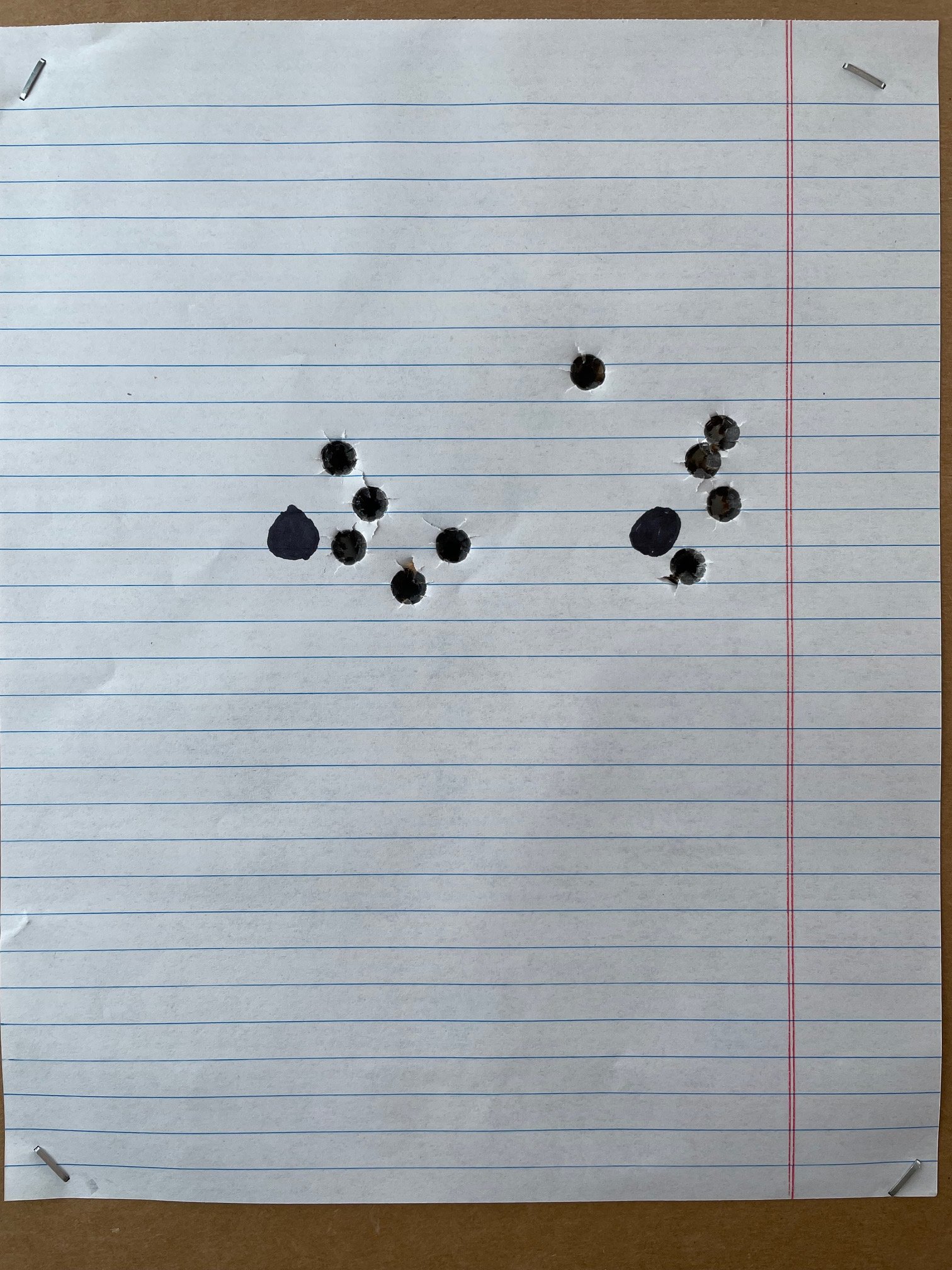 Today across 10 rds I ran an average of 2739 fps with an ES of 19fps and an SD of 6.7..... very happy with velocity but you can see these 100 yd groups are brutal. the flyer on the right dot up by itself was my first round.