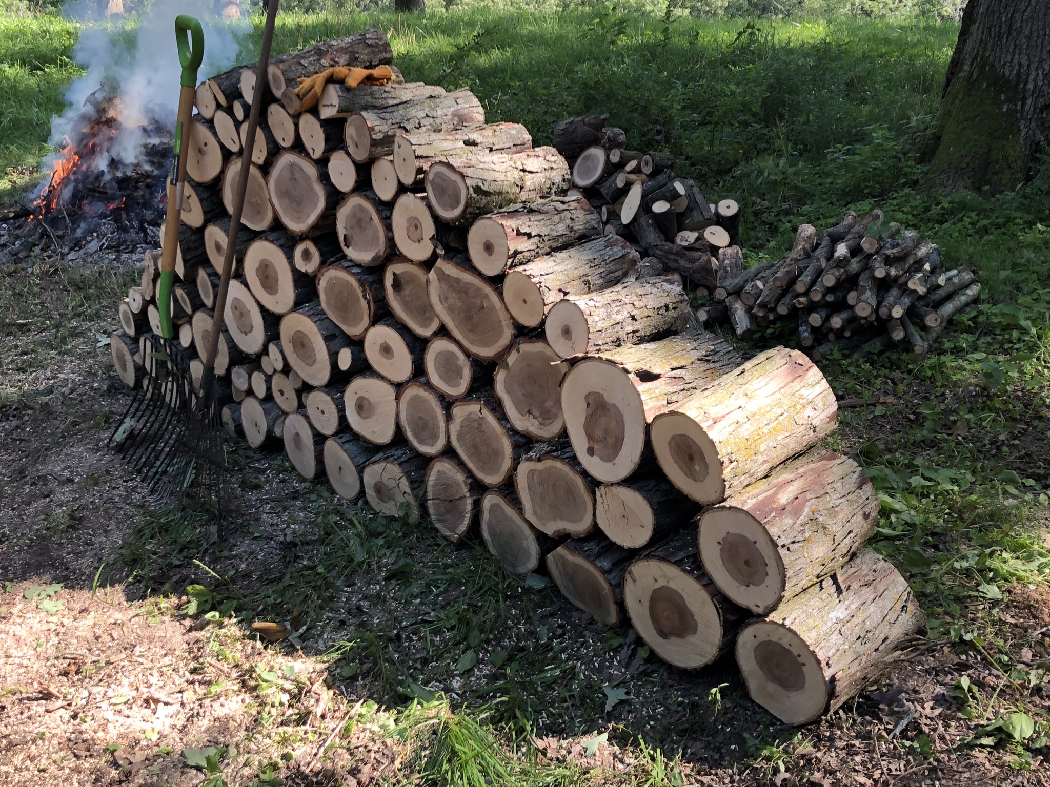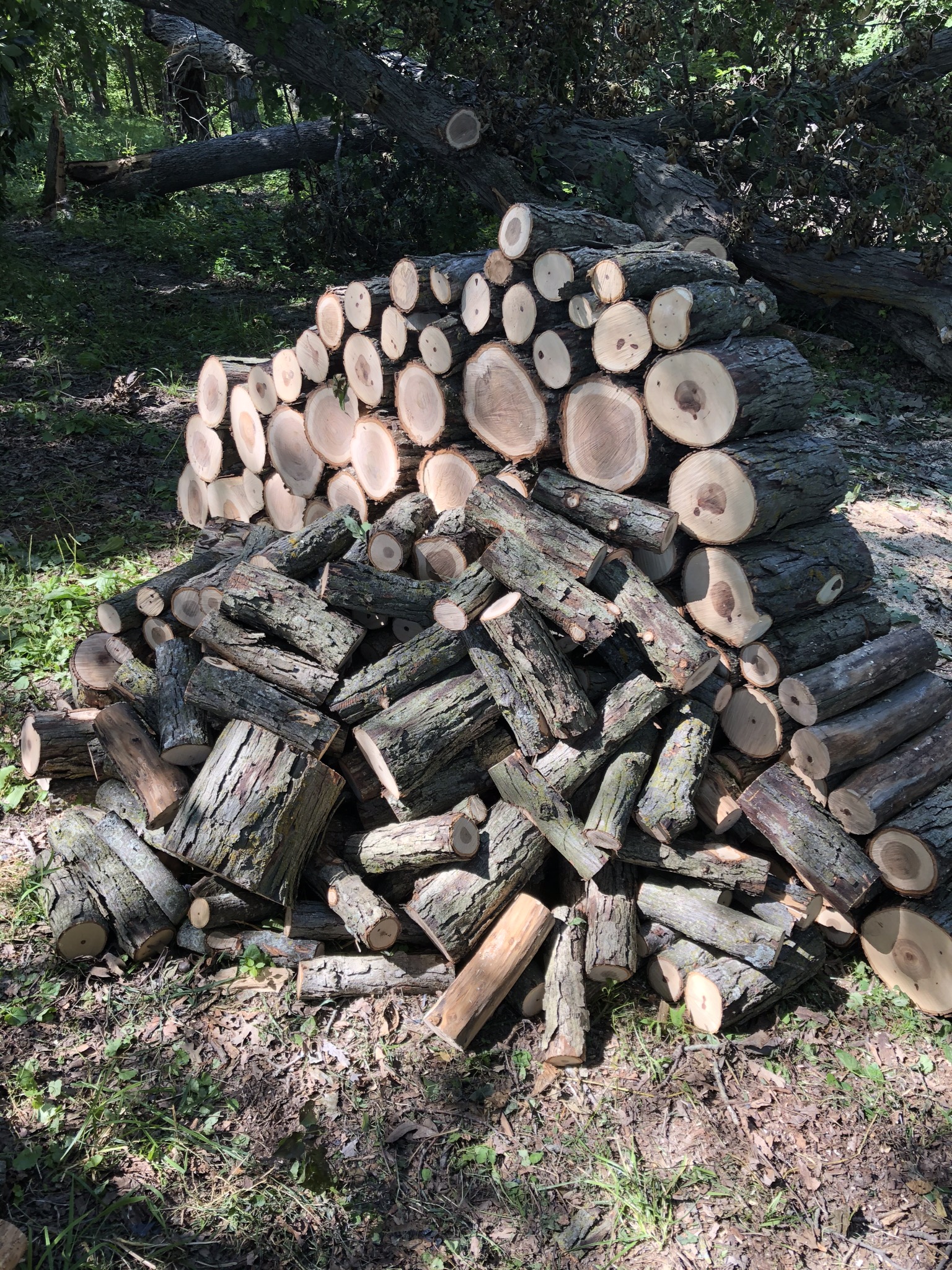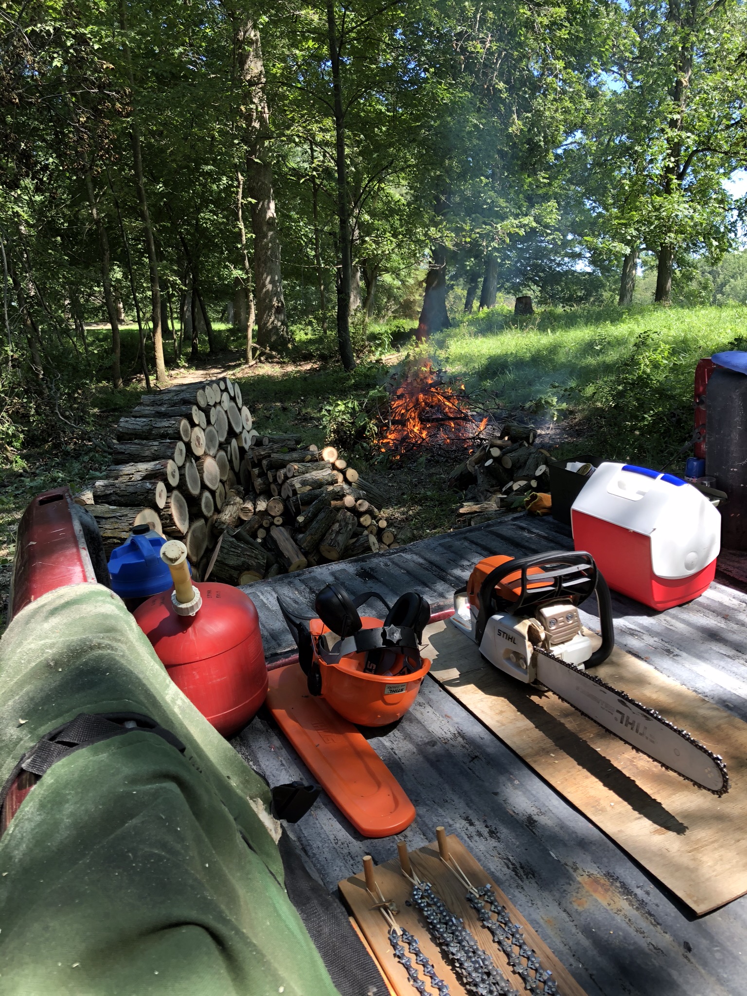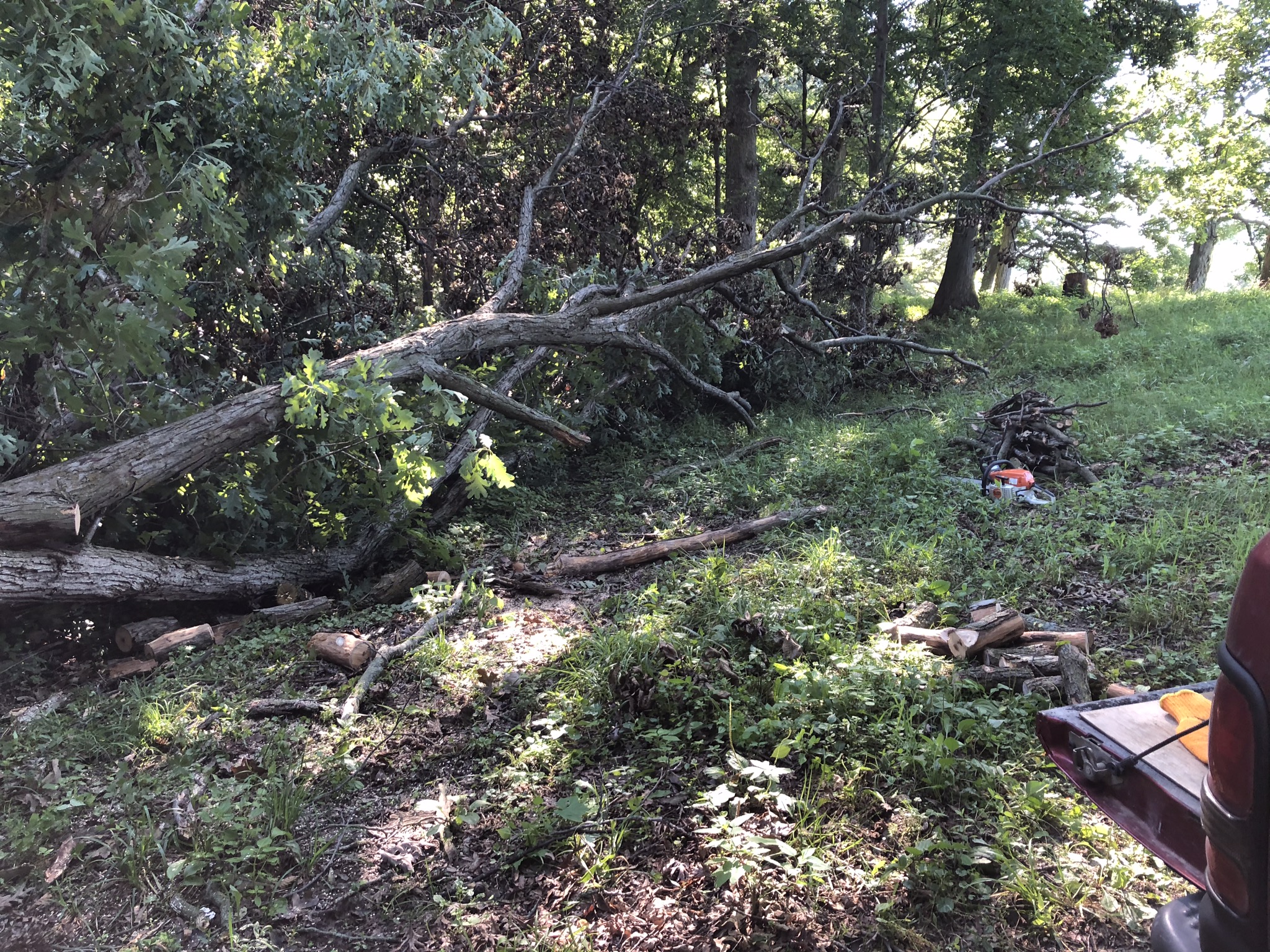 You are like me,you go to saw wood not sharpen chainsTaking advantage of storm damage with high quality wood. A Shagbark Hickory took out 2 Oaks in our neighbors timber. In spite of the heat (for an old timer like me) I didn’t want to lose the opportunity before some other scrounger got to it. Doesn’t look like much done for 7 hours work, but the tops are slow going in a tangled mess. Next time out I’ll be more productive working on the main stems.