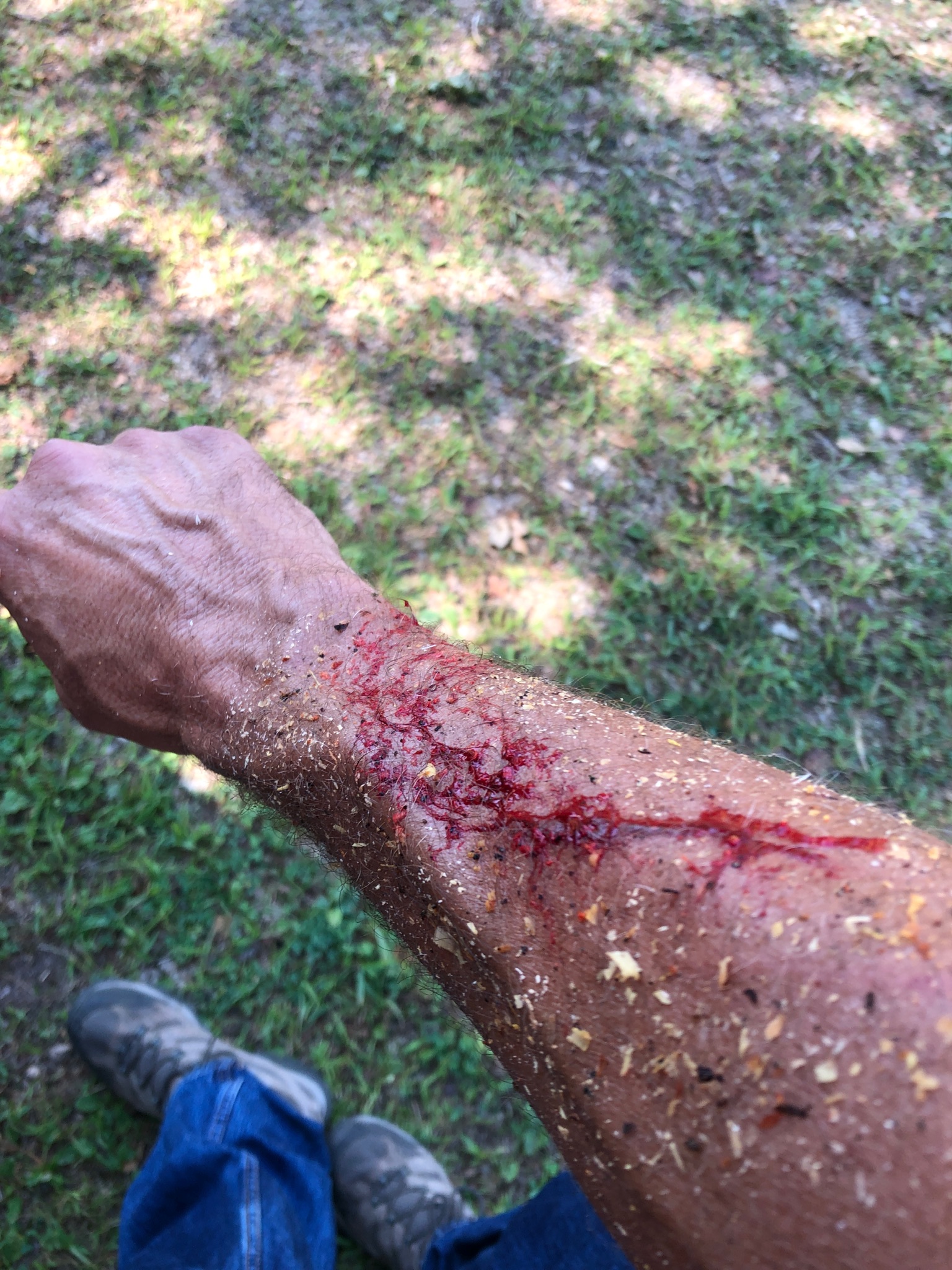 Finished the week of storm cleanup at the in-laws this morning. Not done by any means, but we’ve got nearly all of it off the ground. Pulling a limb out of a fruit tree just before noon another limb snagged me a bit. I hate yard trees, especially fruit and ornamental shit.