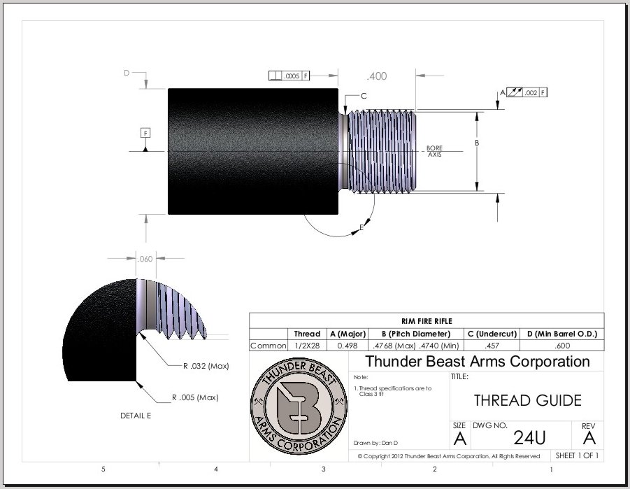 I came across a strange problem today. While out shooting my new Bartlein barrel on my CZ, I noticed that it is threaded 1/2x28 but the threads are about 0.600" long. Significantly longer than any other .22lr I have more like an AR. My YHM Mite will screw right on but my uncles Silencerco Sparrow would not. It bottomed out before the shoulder. It has a stop built in that I guess is to keep it from screwing onto AR threads. My question is: will the TB .22 takedown screw onto my barrel?