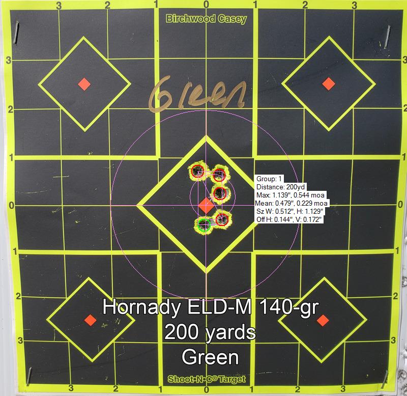 So, the final combo was "green (powder) - black (seating depth). Honestly, I don't think I really accomplished much, as there seems to be no real consistency. And, I blame myself for that. This was 7 months ago, so I'm a better shooter now. I wonder if I should start over with a new LDP #1?