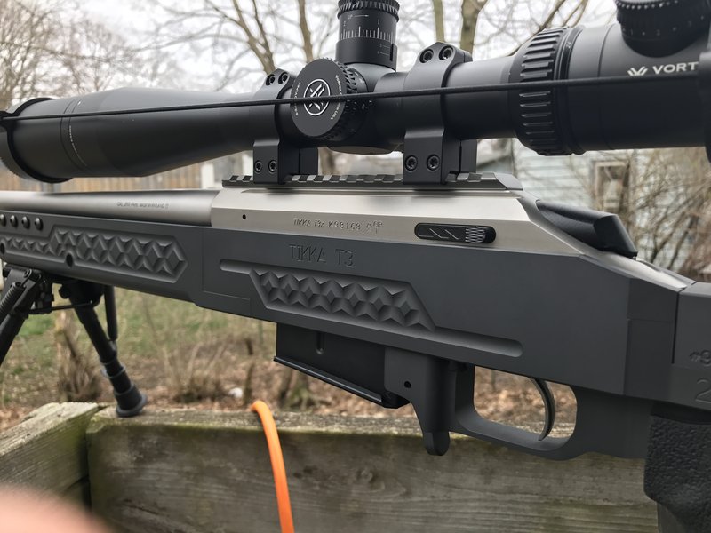 I've been super pleased with my tikka in a KRG X-ray. Solid feel, easy recoil management, and I like the vertical grip. I don't clean all that often, so removing the cheek piece is no big deal to me. I like the polymer build as it gives a good grip and doesn't get unspeakably cold in the winter.